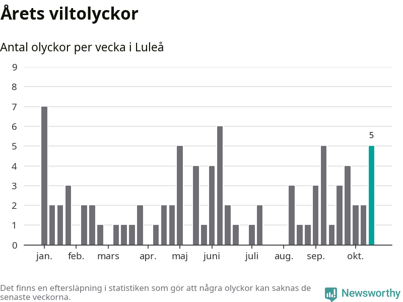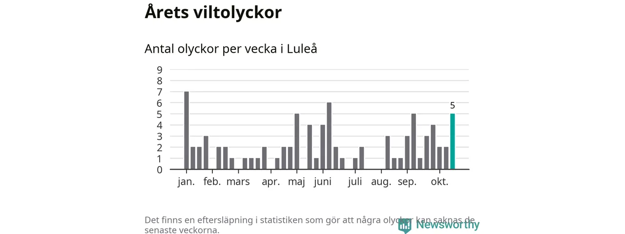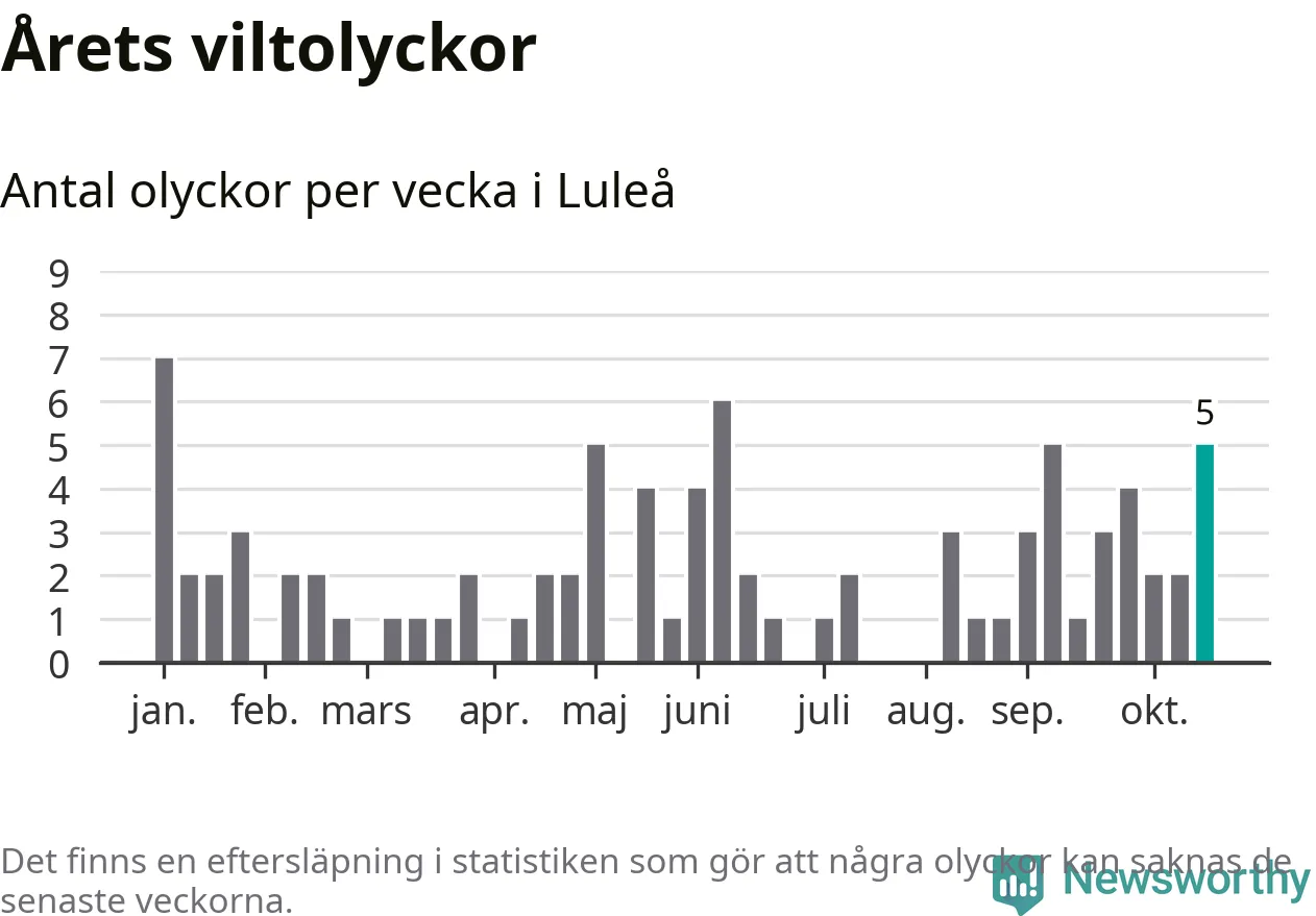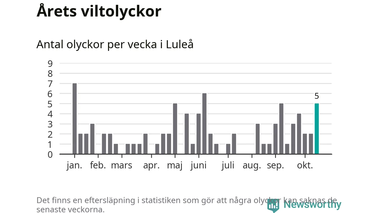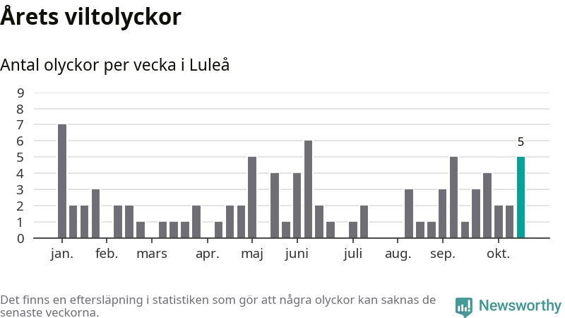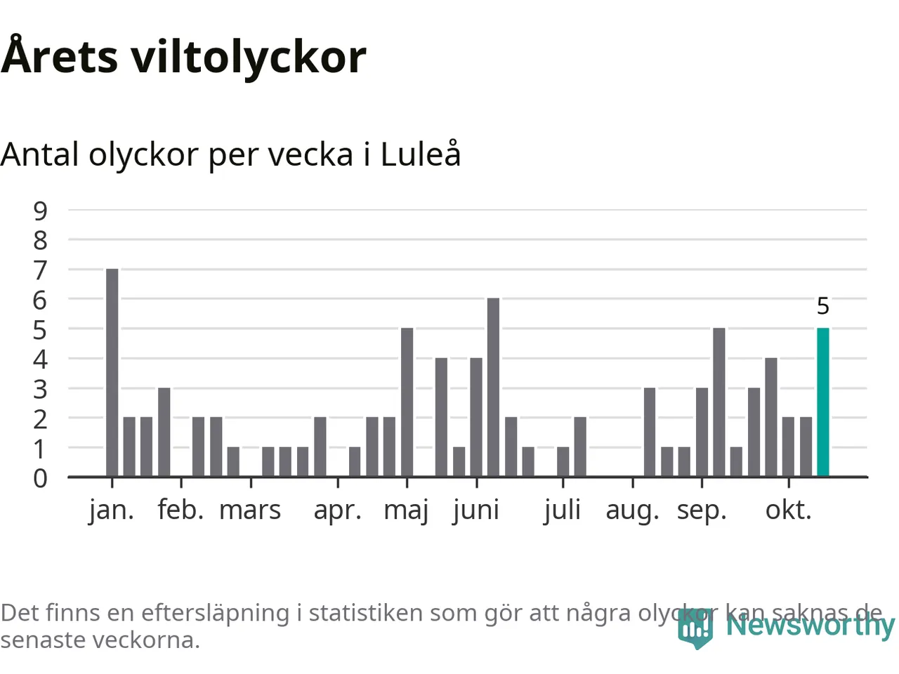 Hittills har fem viltolyckor rapporterats in i Luleå kommun från vecka 43. Se listan här.