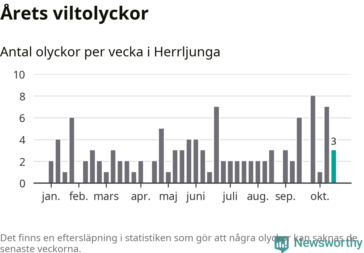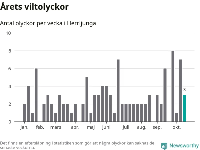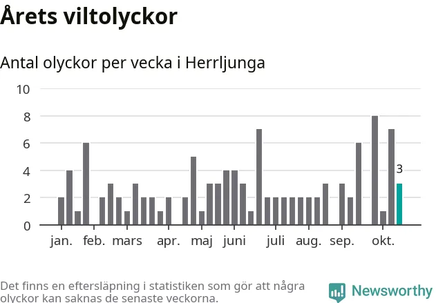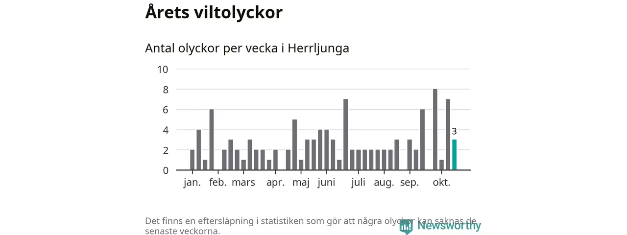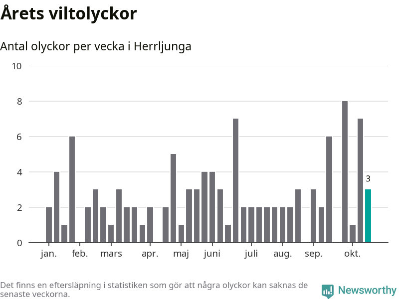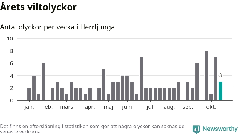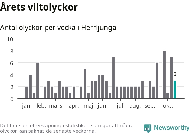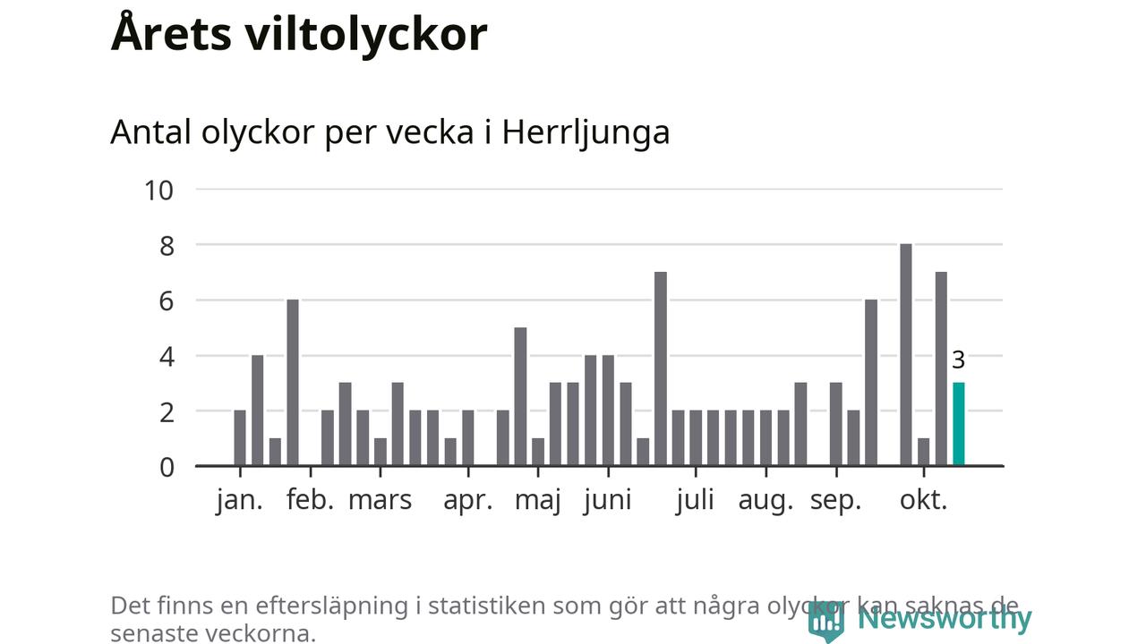 Hittills har tre viltolyckor rapporterats in i Herrljunga kommun från vecka 43. Se listan här.