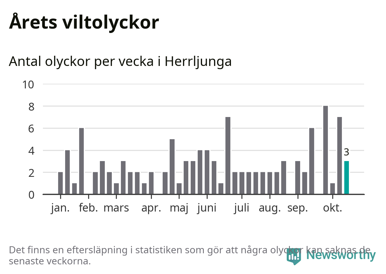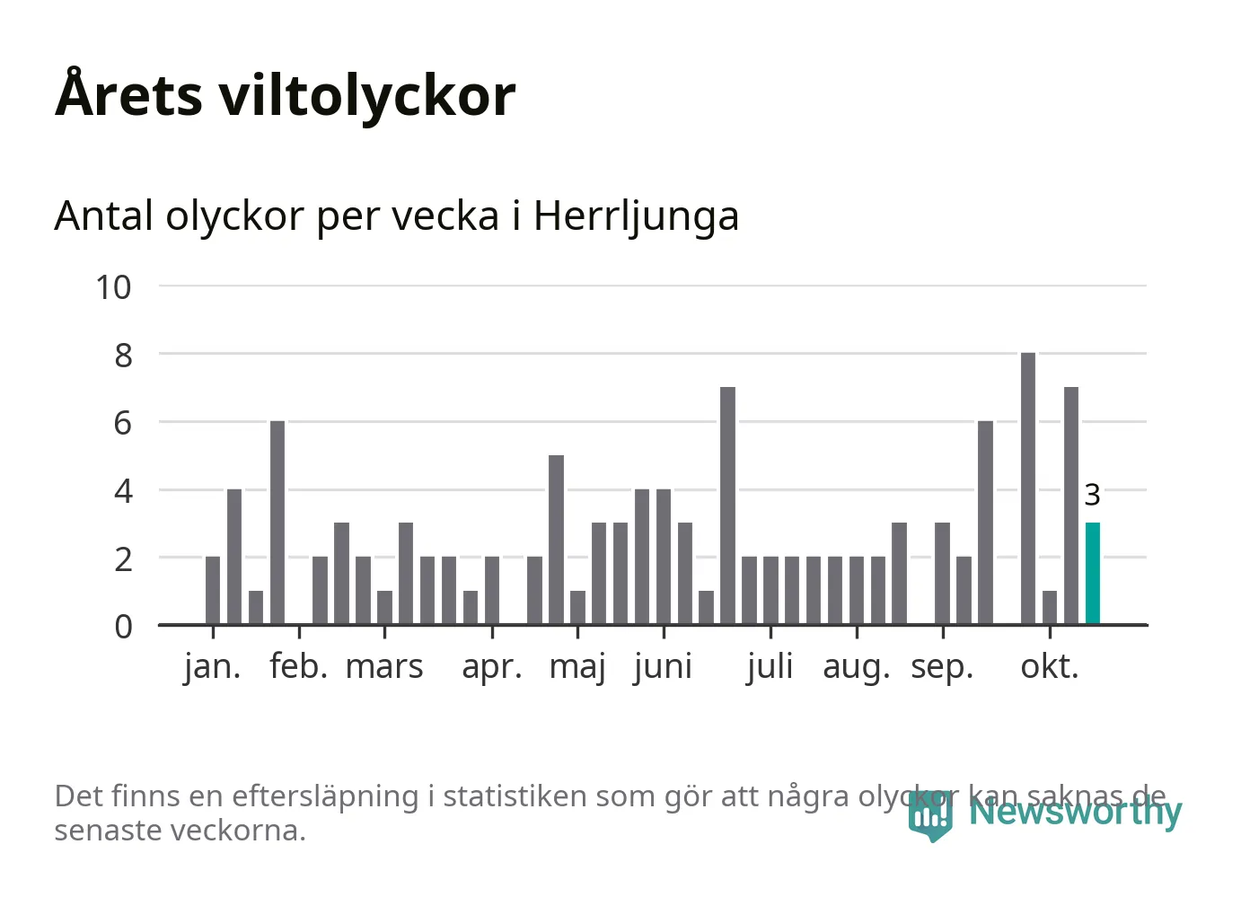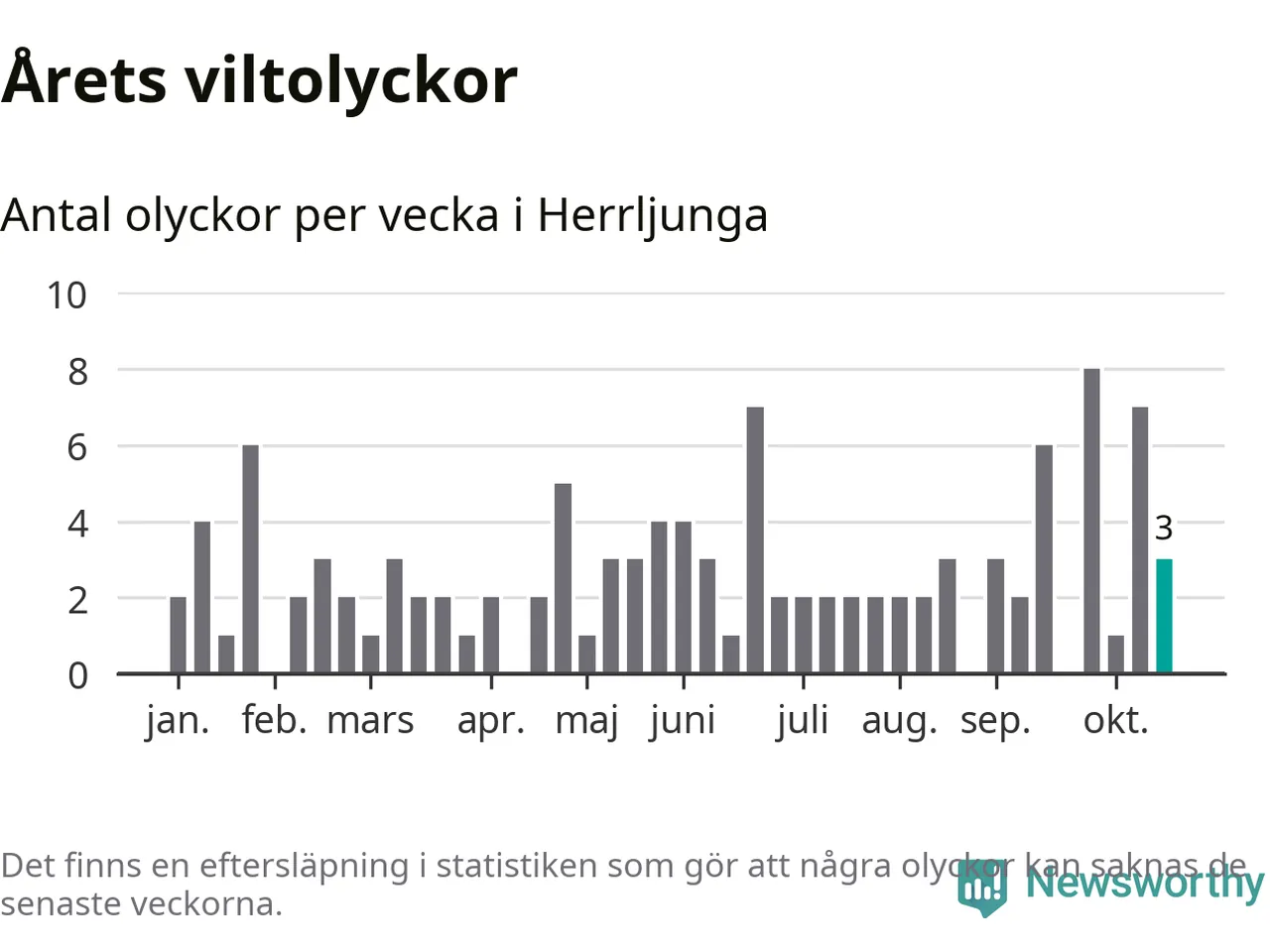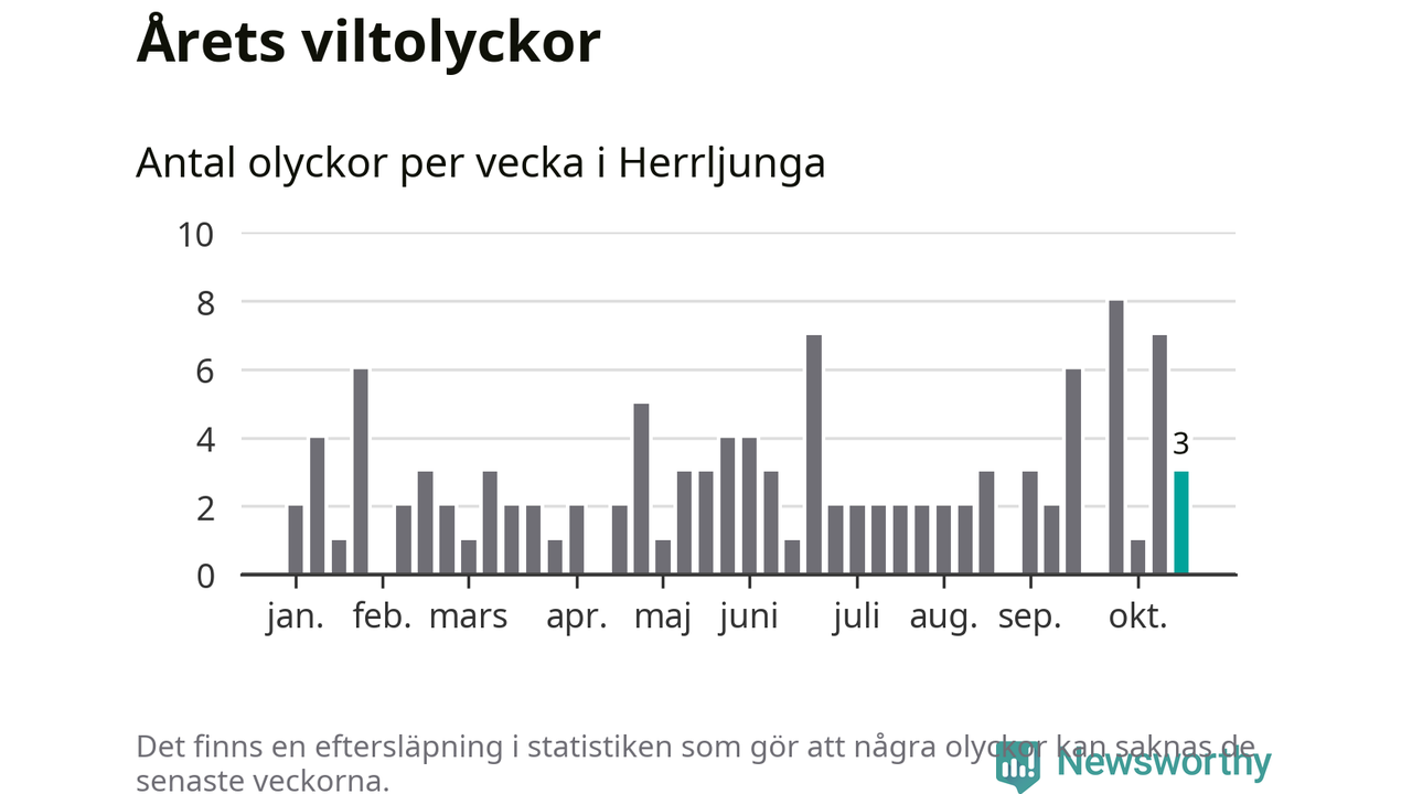 Hittills har tre viltolyckor rapporterats in i Herrljunga kommun från vecka 43. Se listan här.