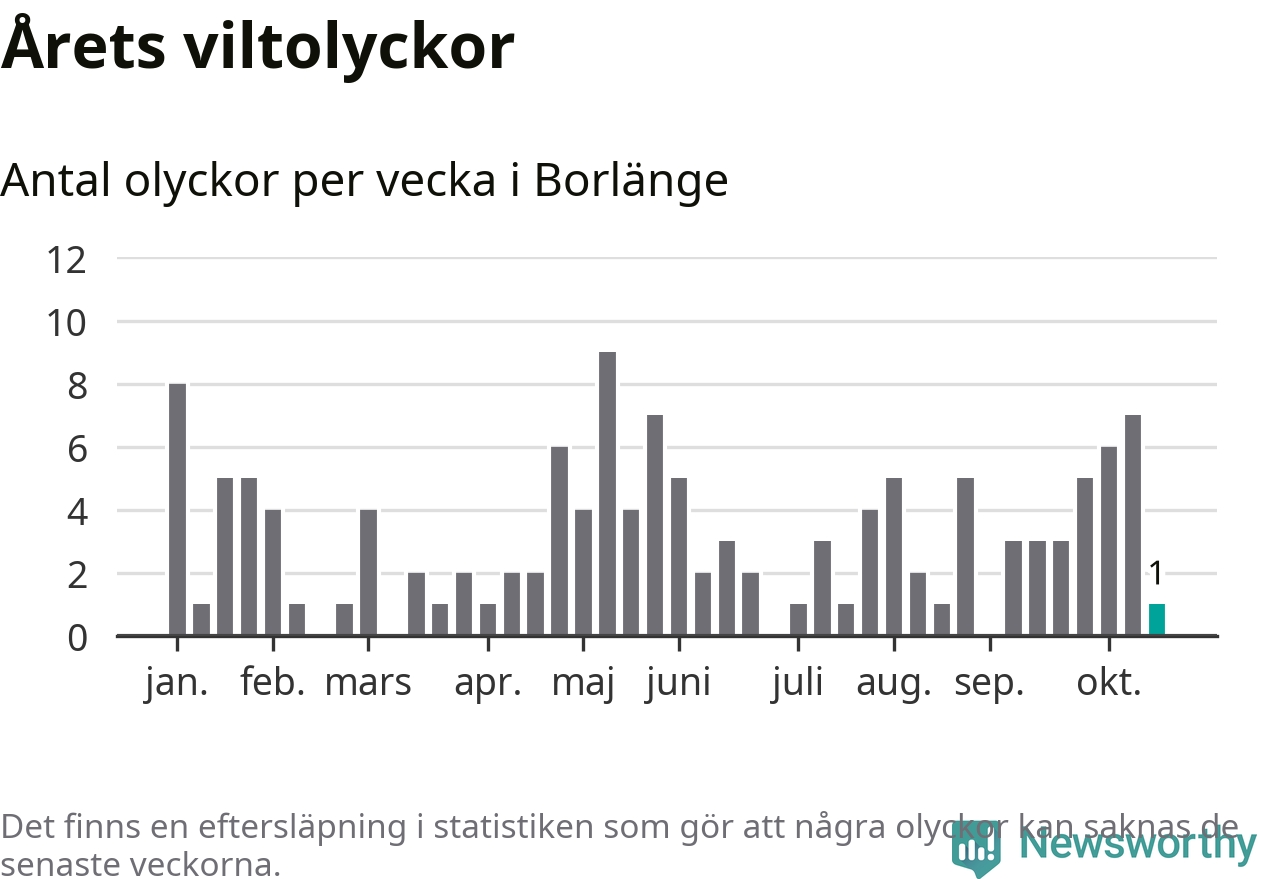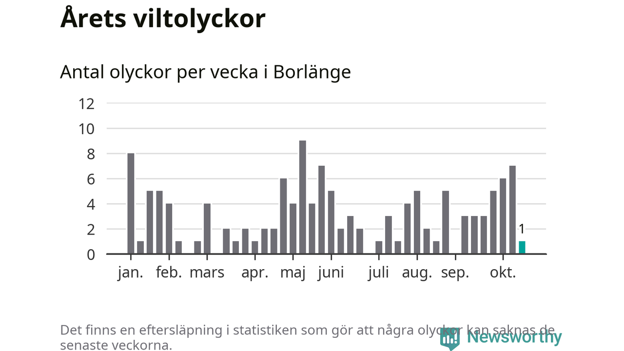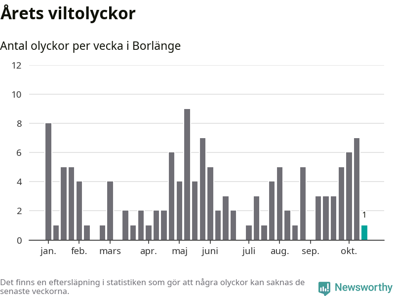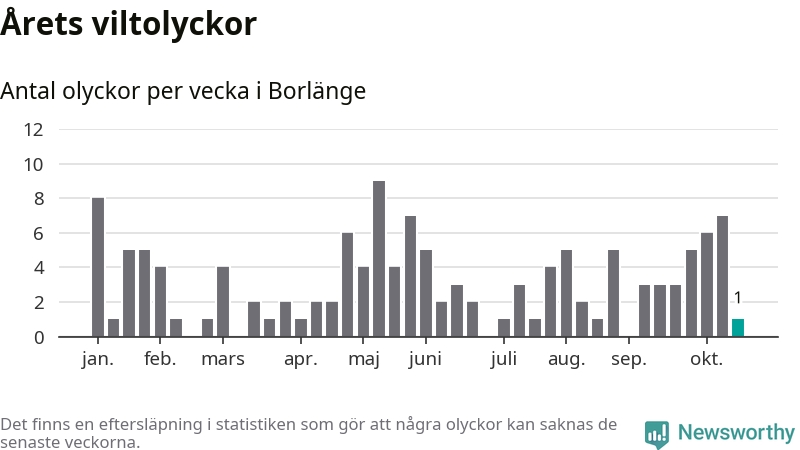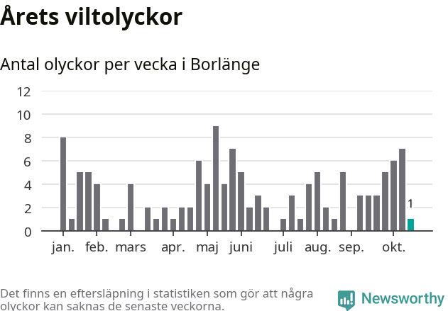 Från förra veckan (vecka 43) har hittills en viltolycka rapporterats in i Borlänge kommun.