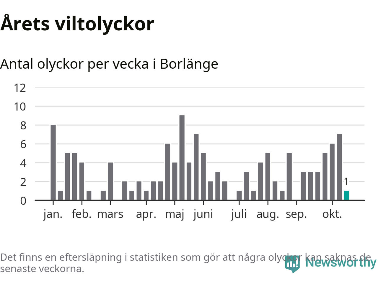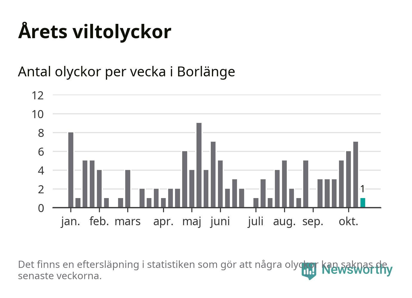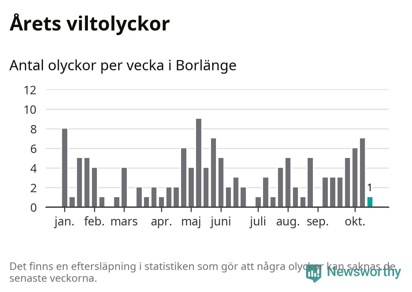 Från förra veckan (vecka 43) har hittills en viltolycka rapporterats in i Borlänge kommun.