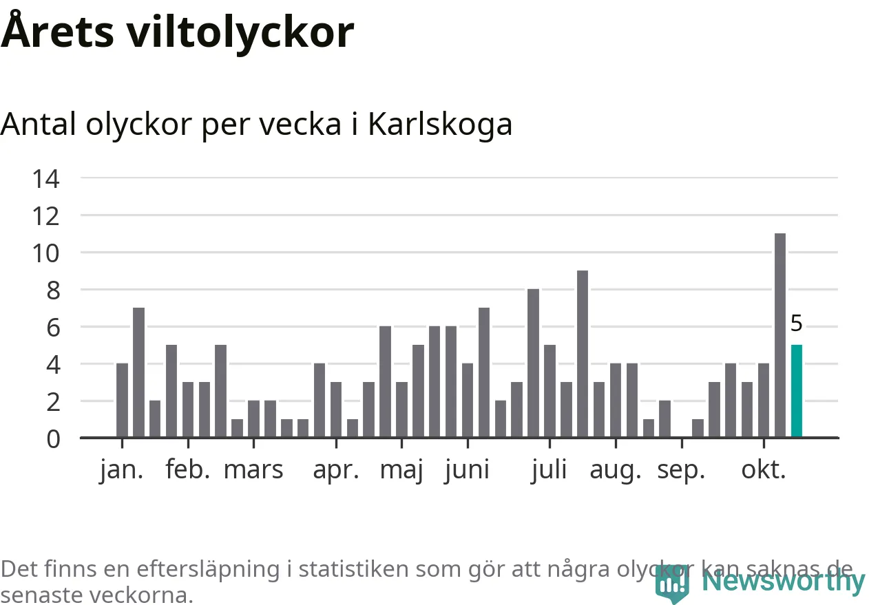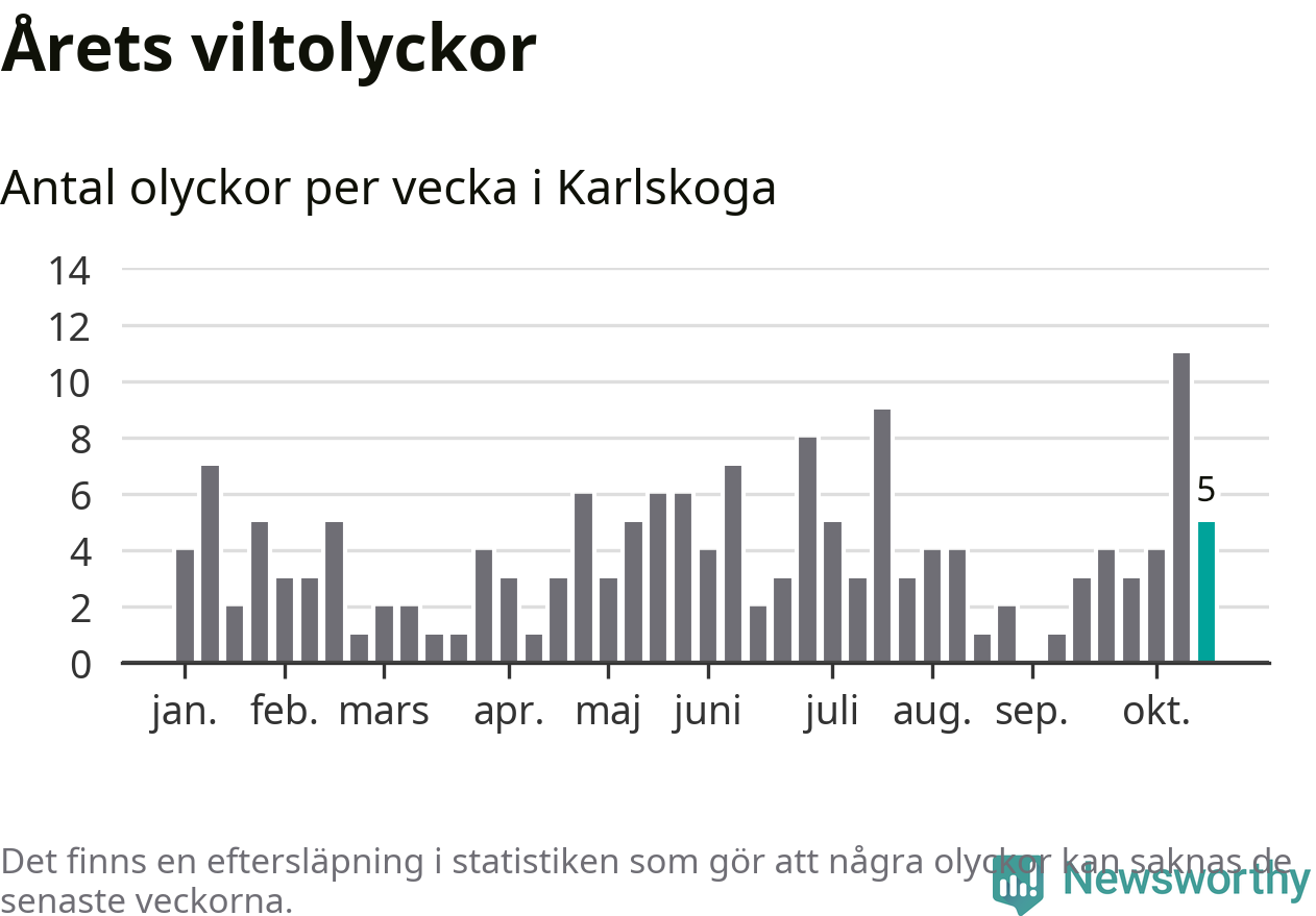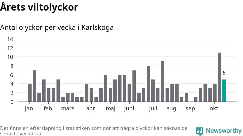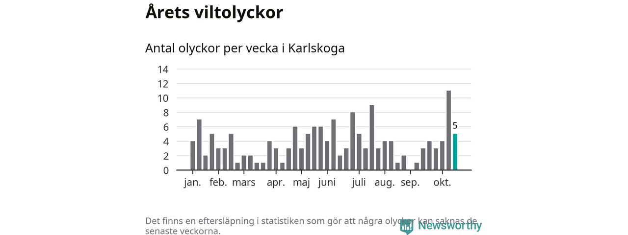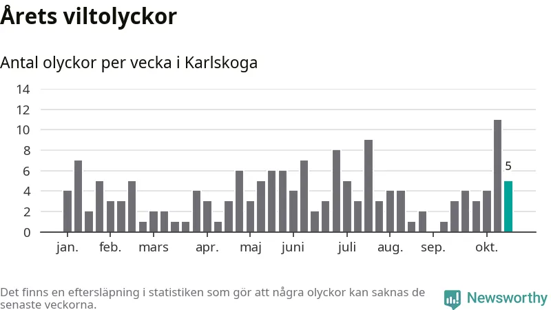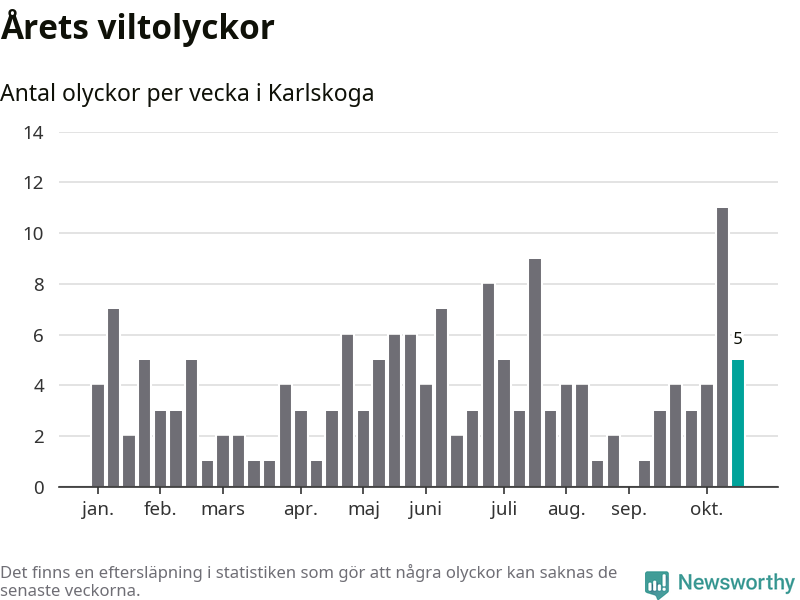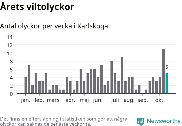 Hittills har fem viltolyckor rapporterats in i Karlskoga kommun från vecka 43. Se listan här.