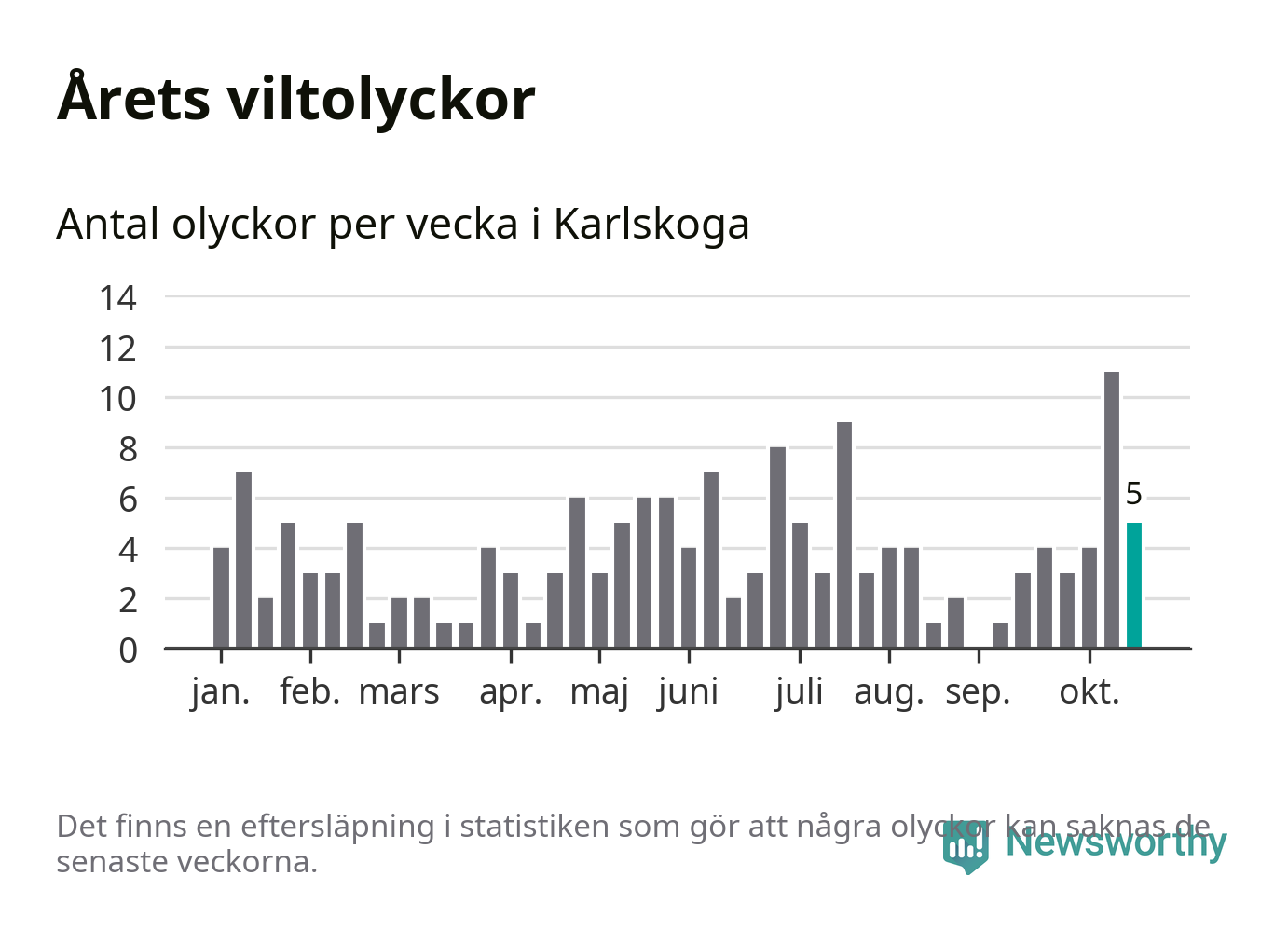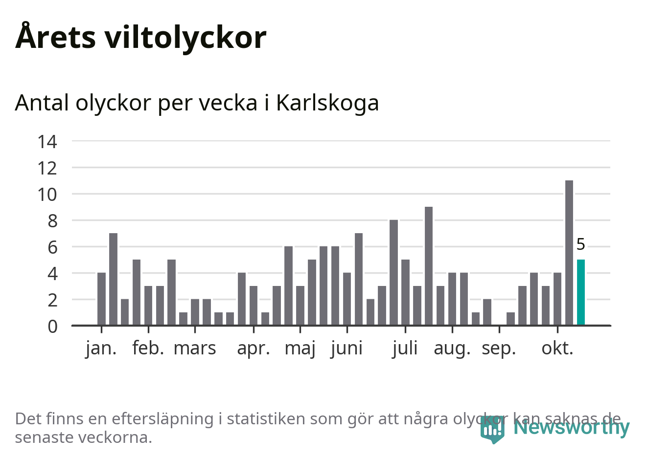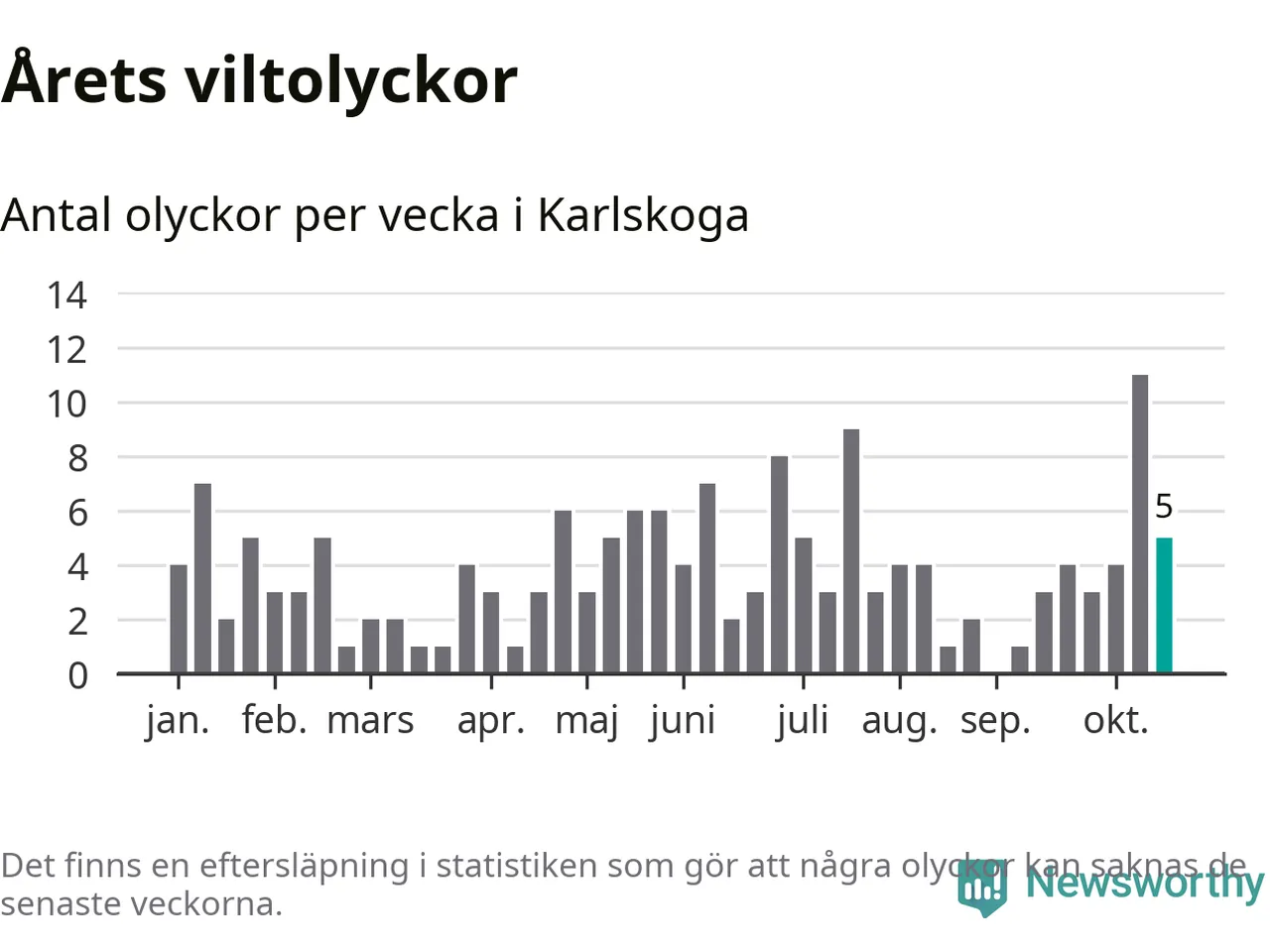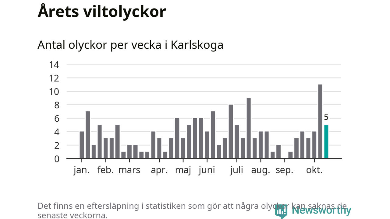 Hittills har fem viltolyckor rapporterats in i Karlskoga kommun från vecka 43. Se listan här.