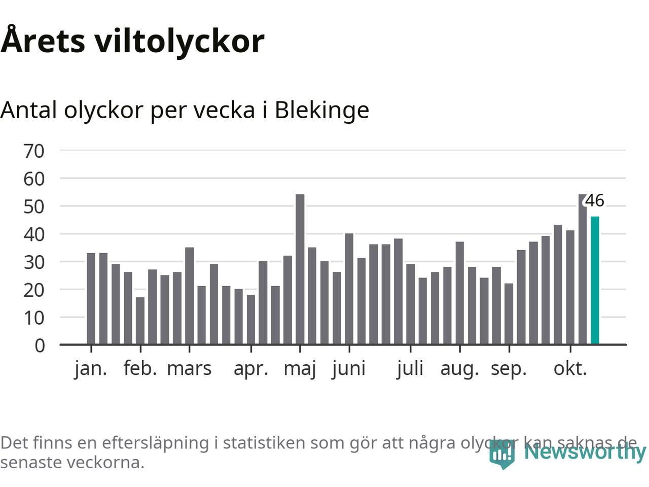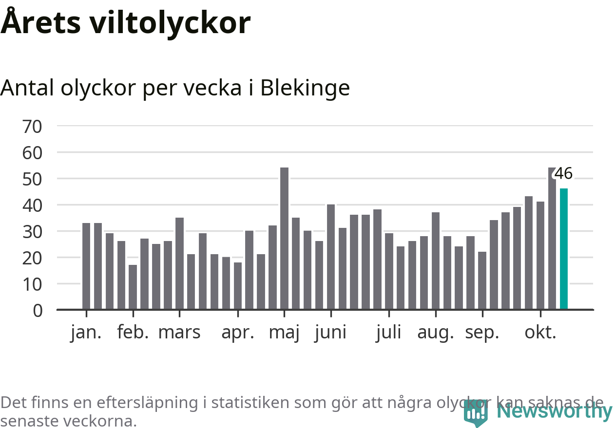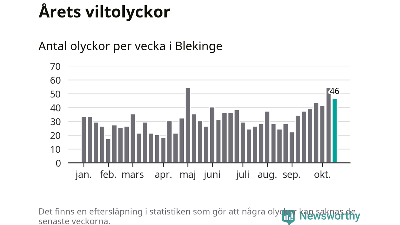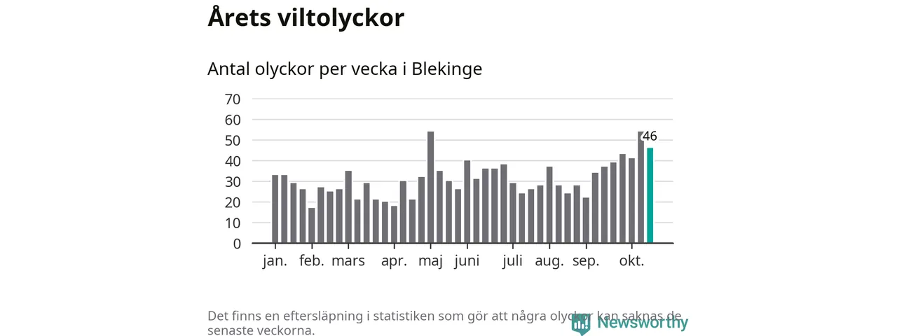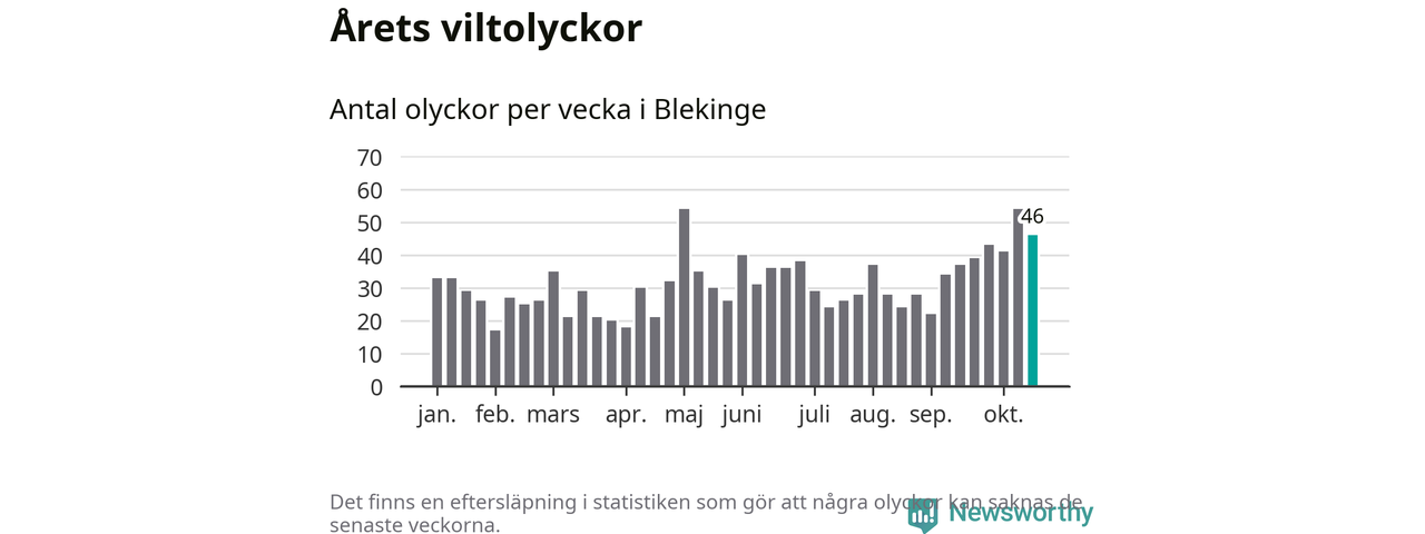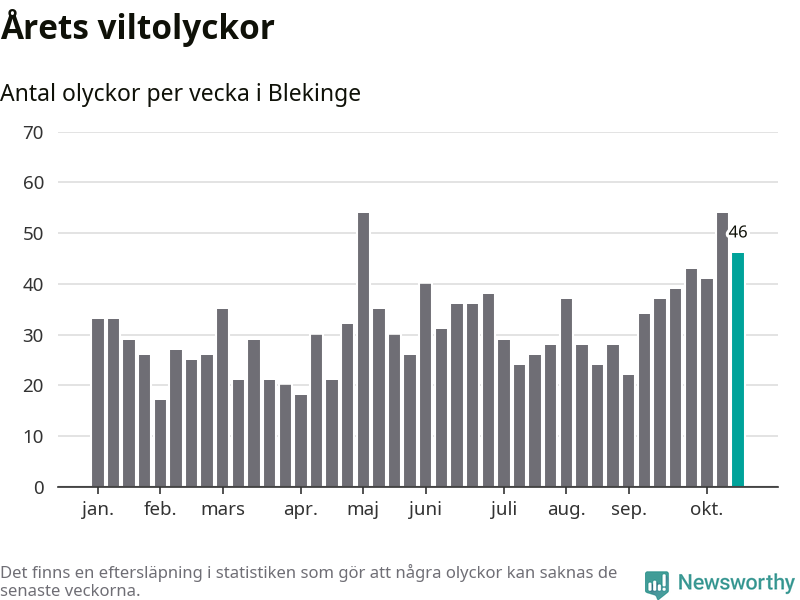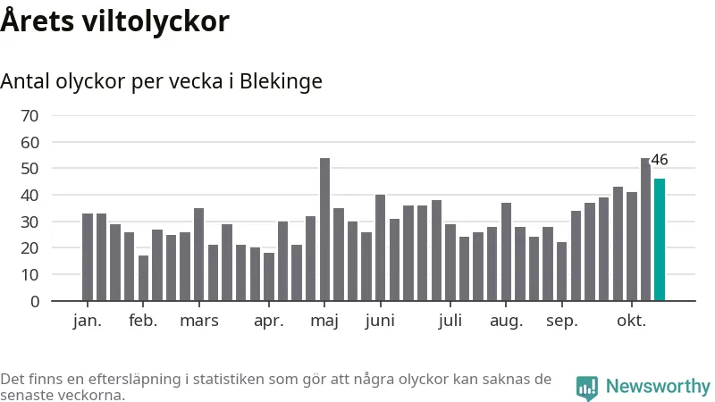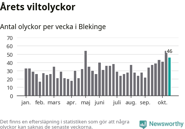 Hittills har 46 viltolyckor rapporterats in i Blekinge län från vecka 43. Se listan här.