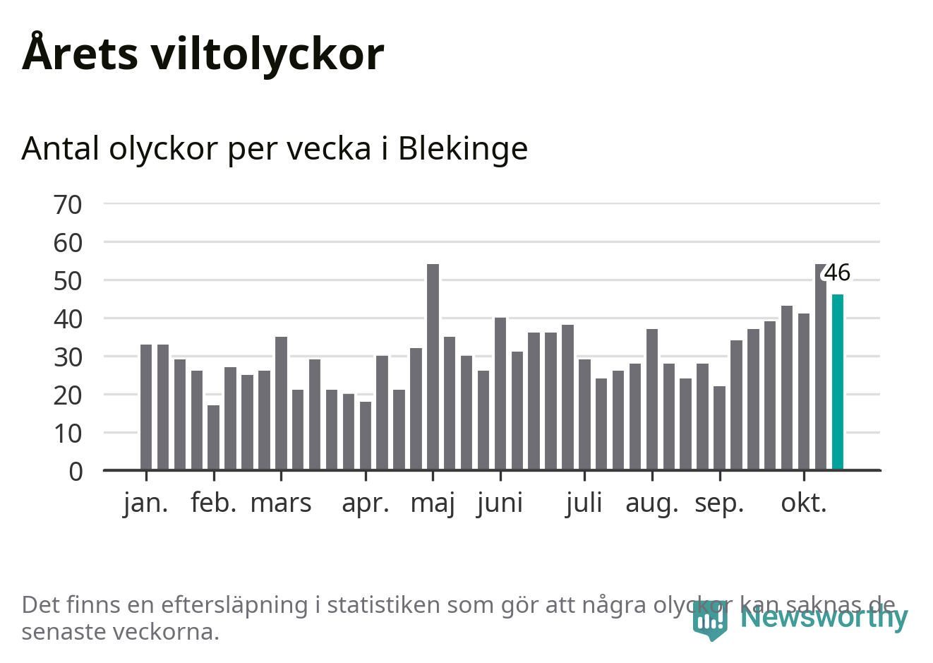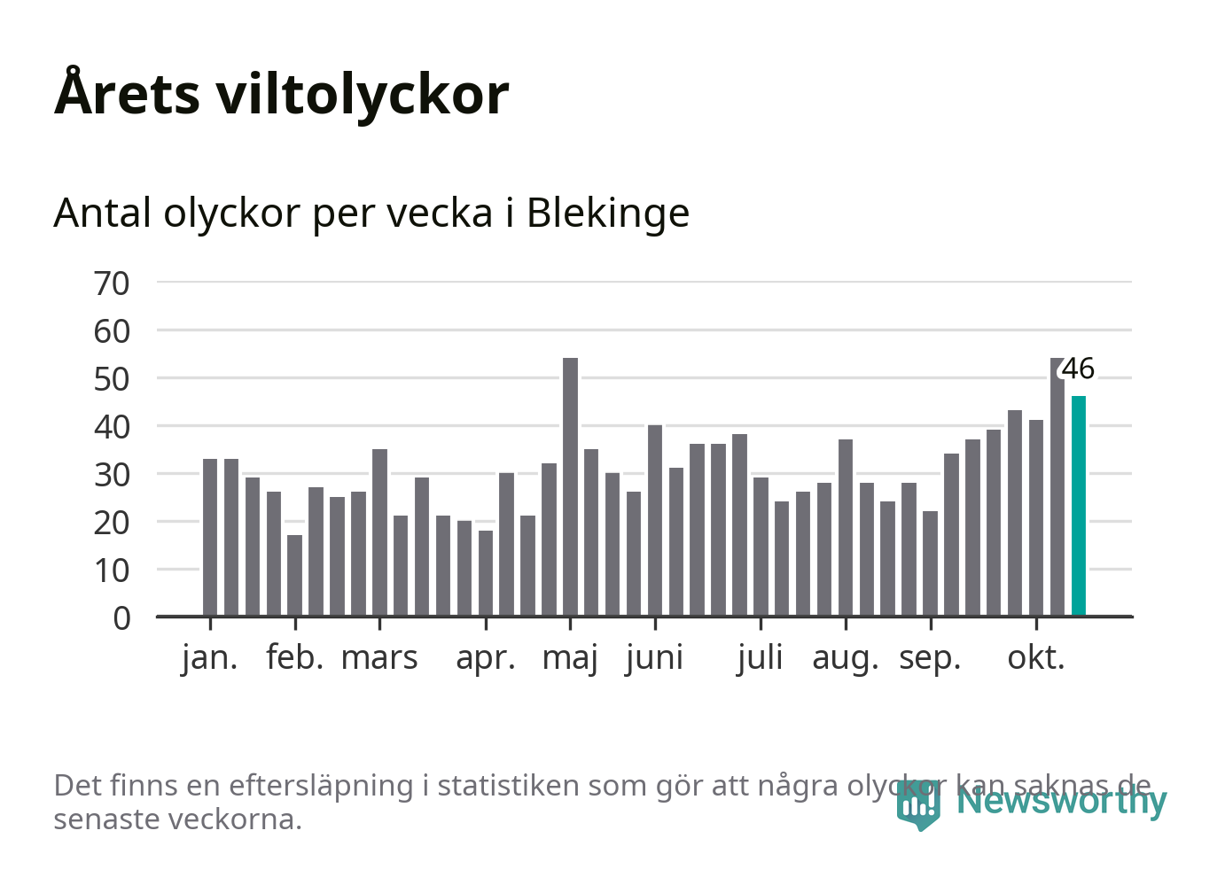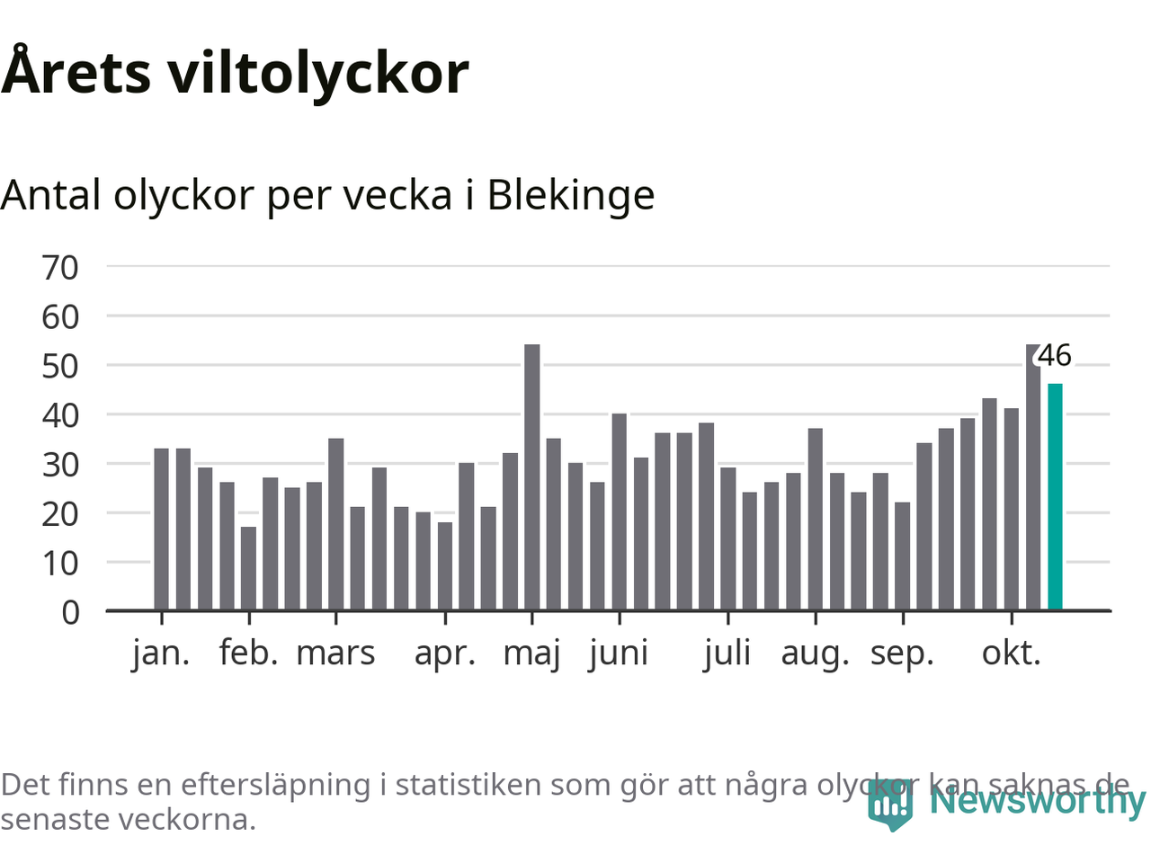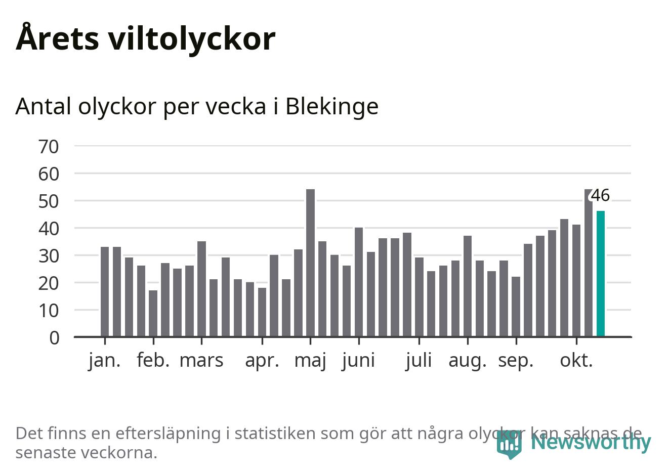Hittills har 46 viltolyckor rapporterats in i Blekinge län från vecka 43. Se listan här.