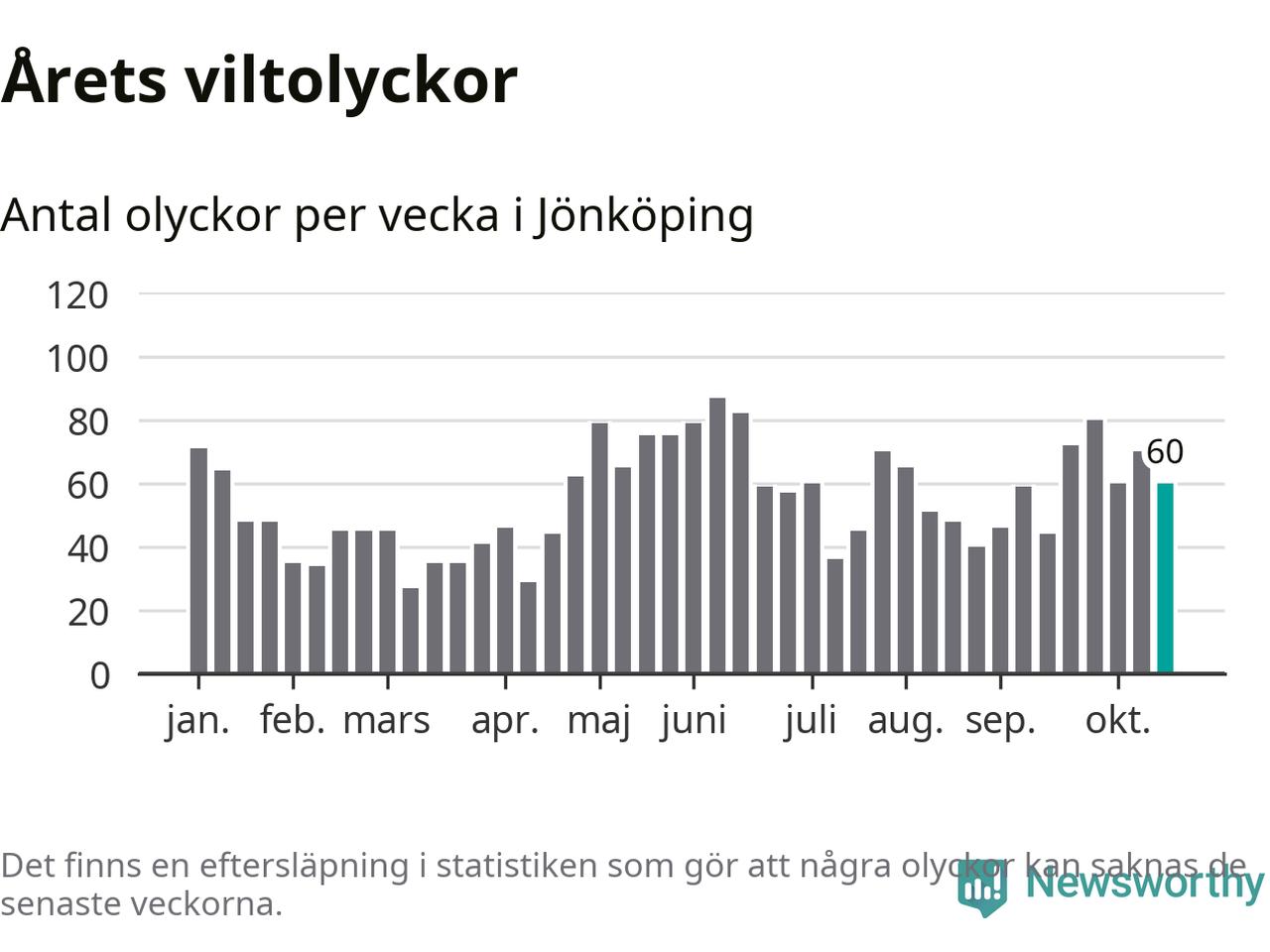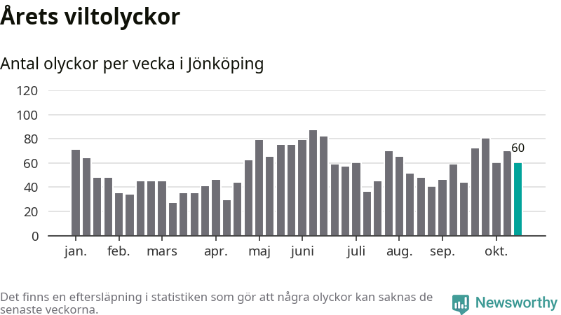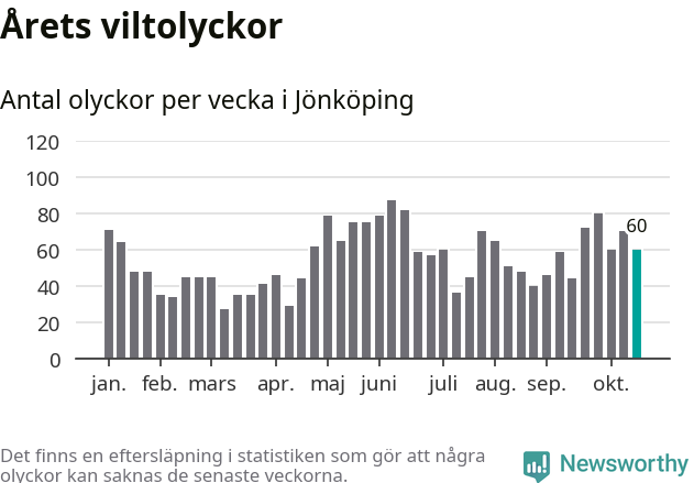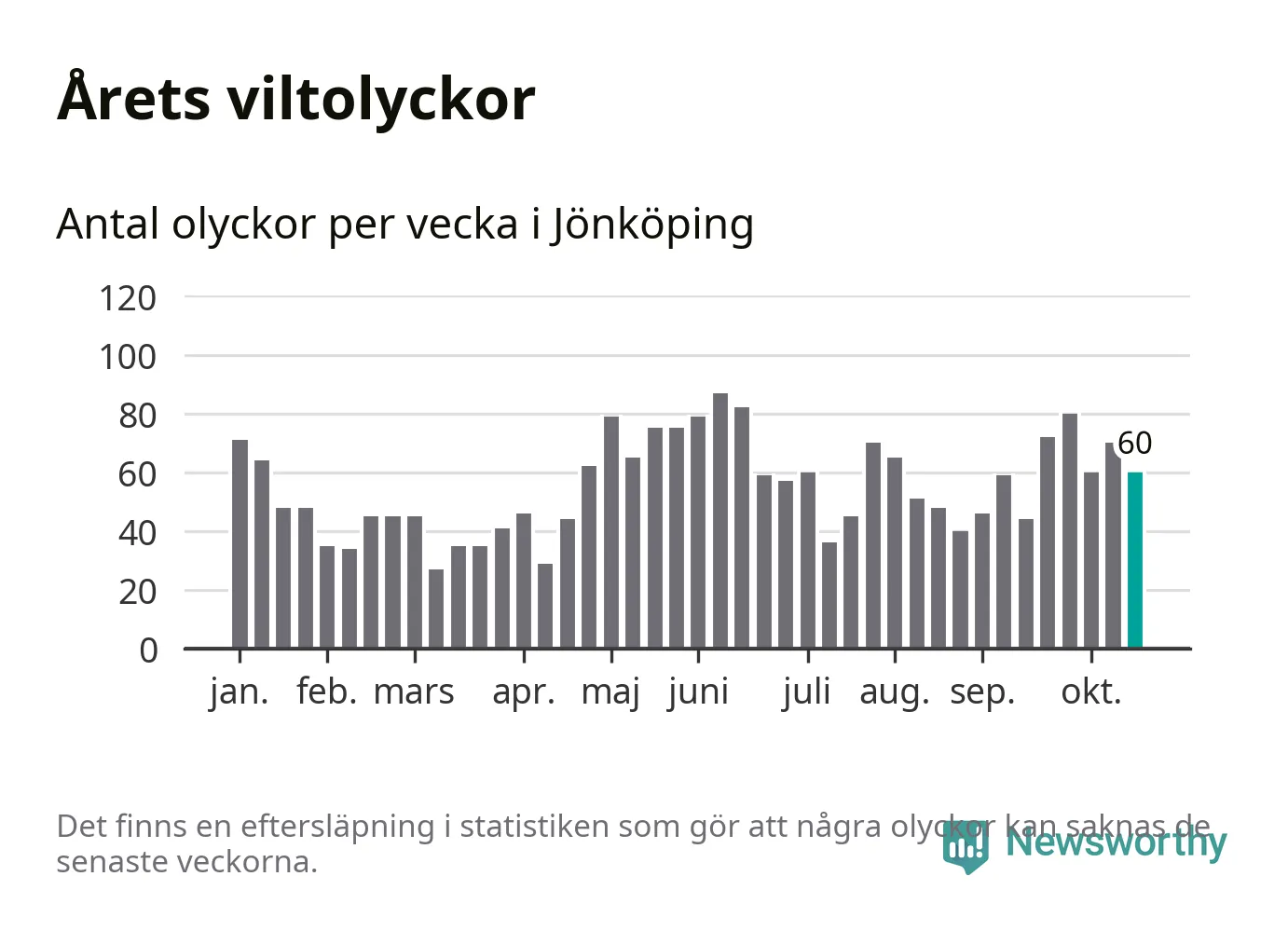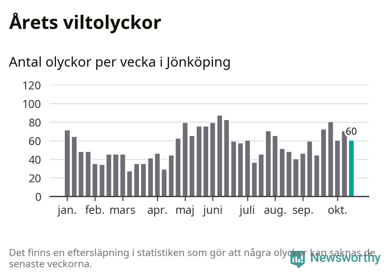 Hittills har 60 viltolyckor rapporterats in i Jönköpings län från vecka 43. Se listan här.