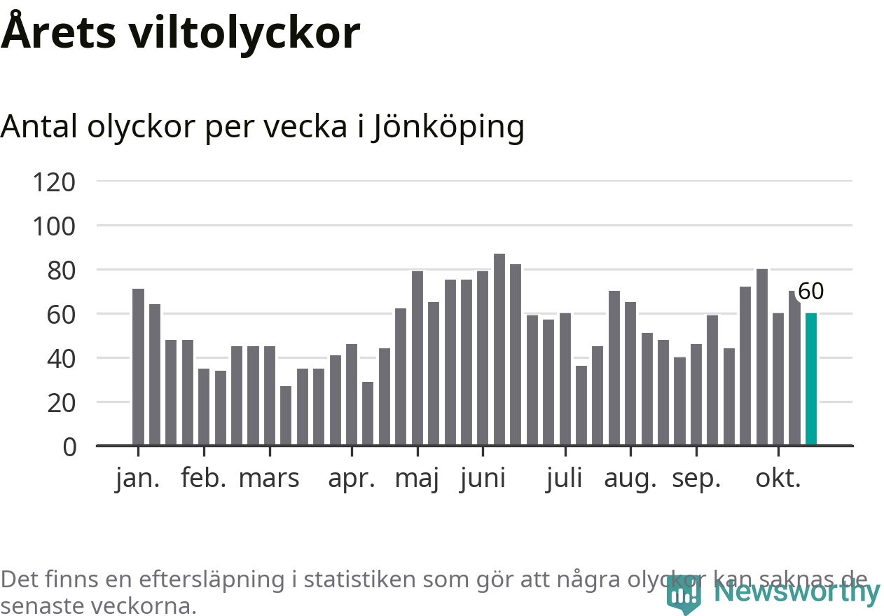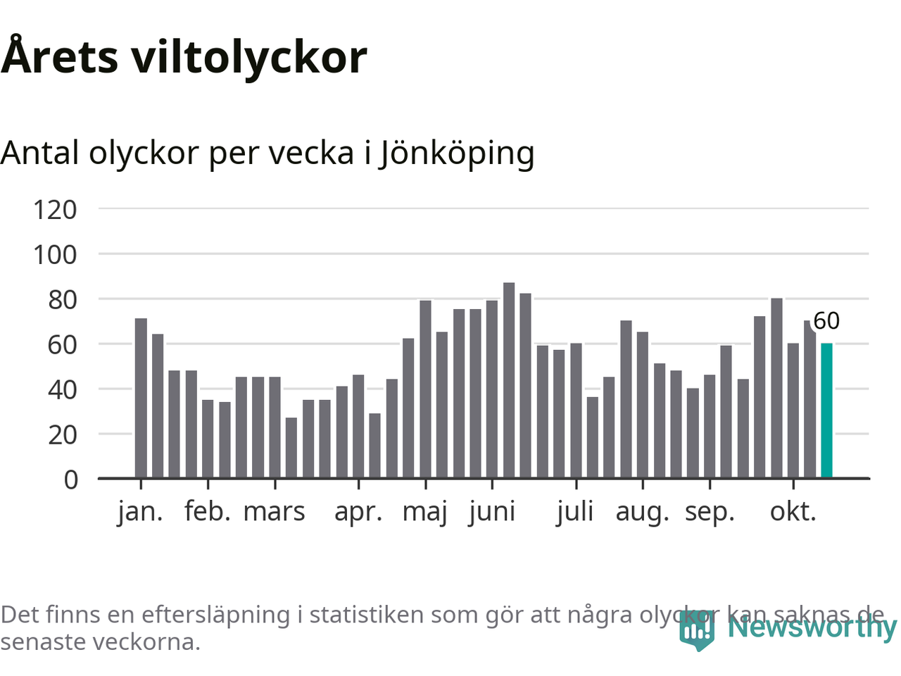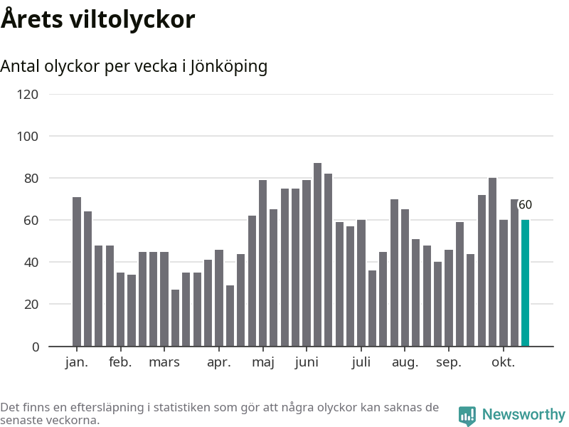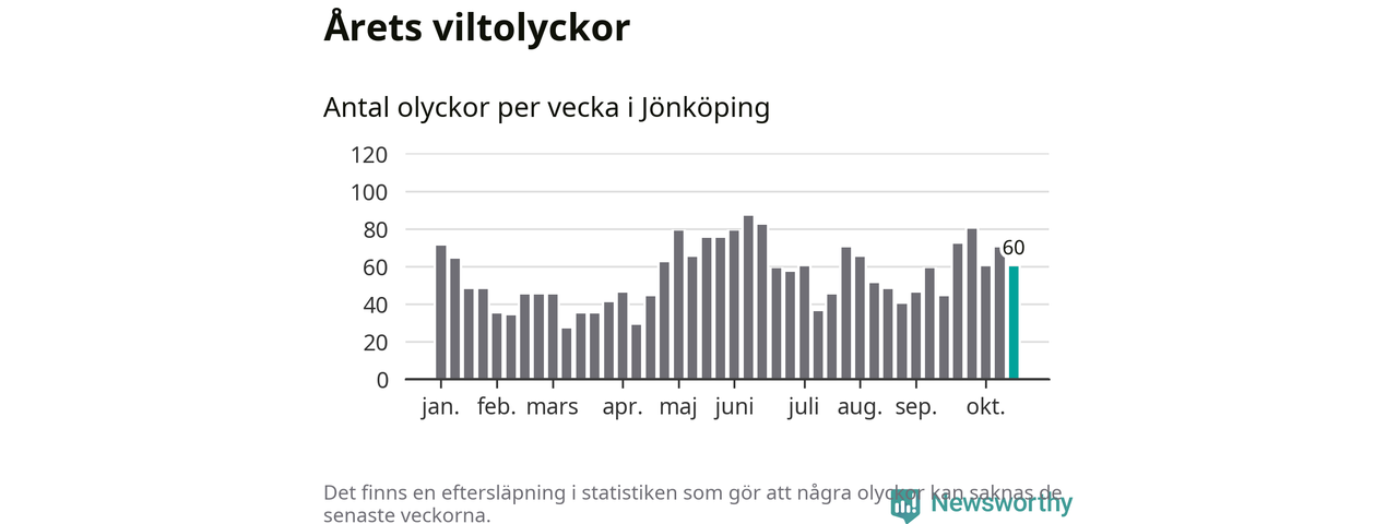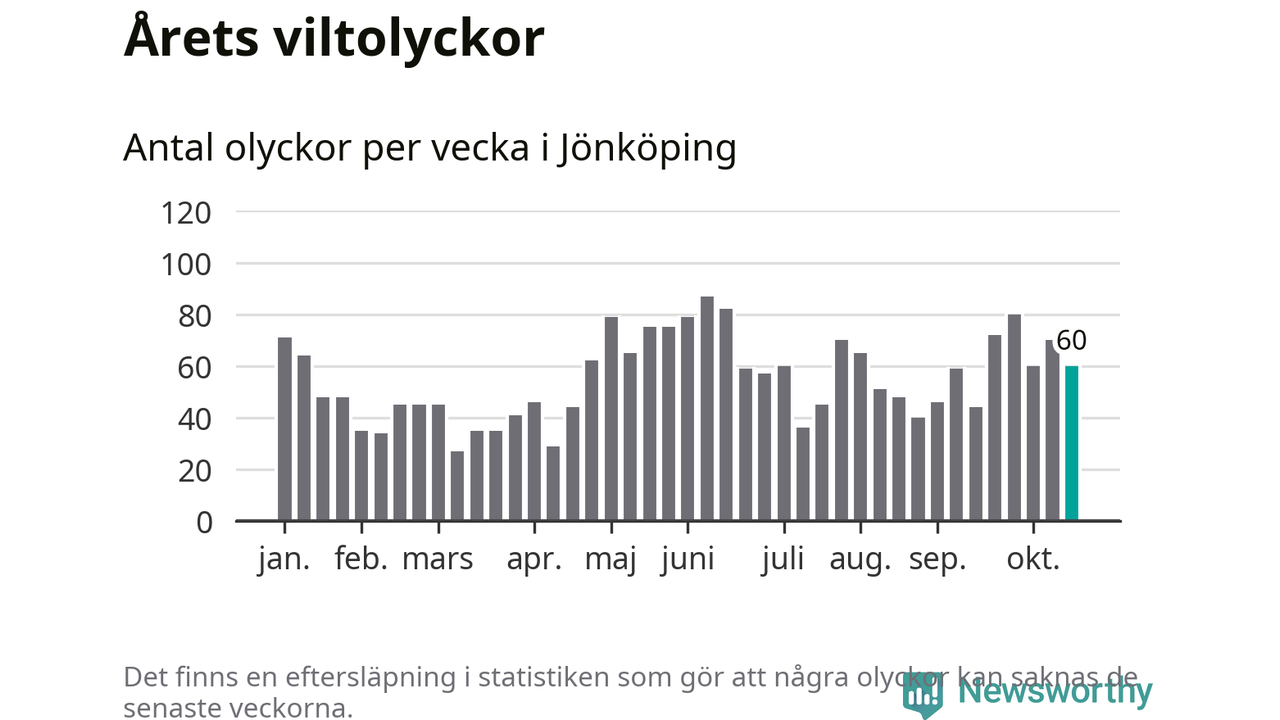 Hittills har 60 viltolyckor rapporterats in i Jönköpings län från vecka 43. Se listan här.