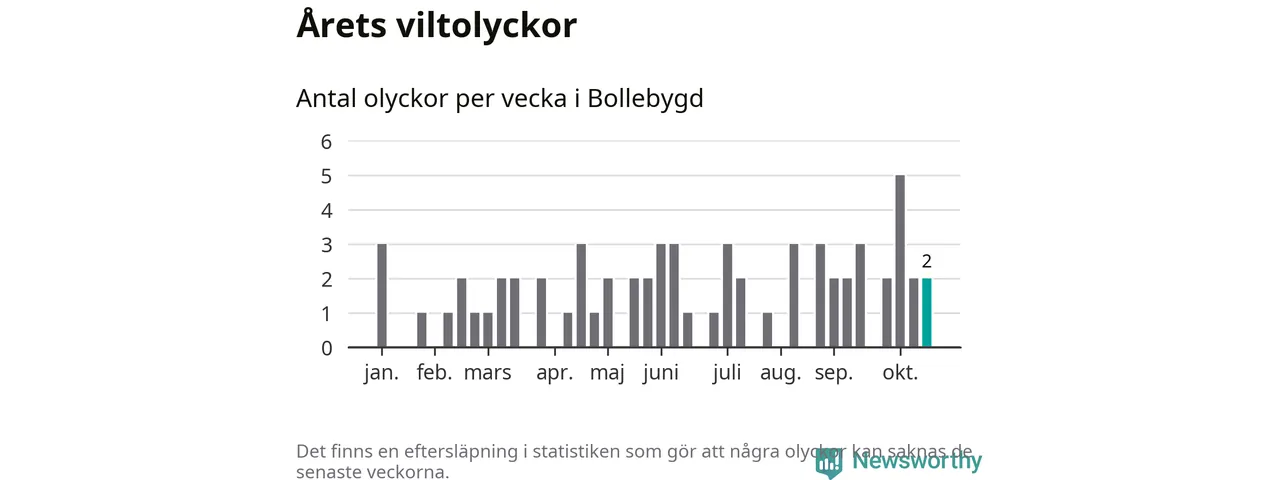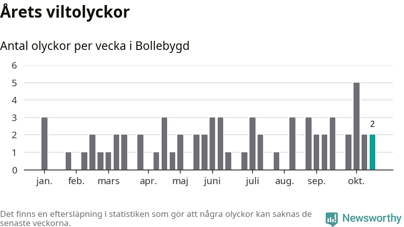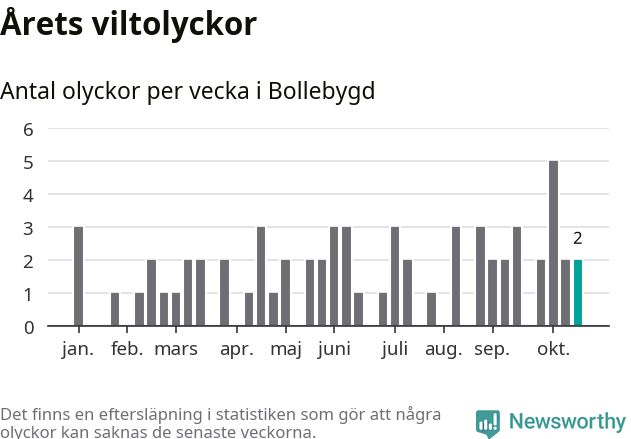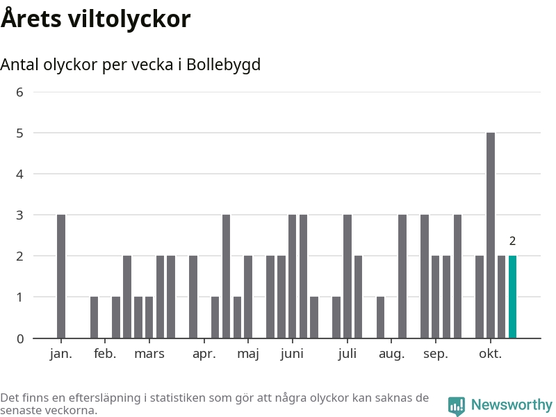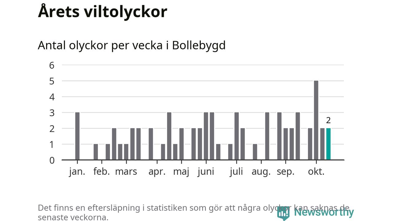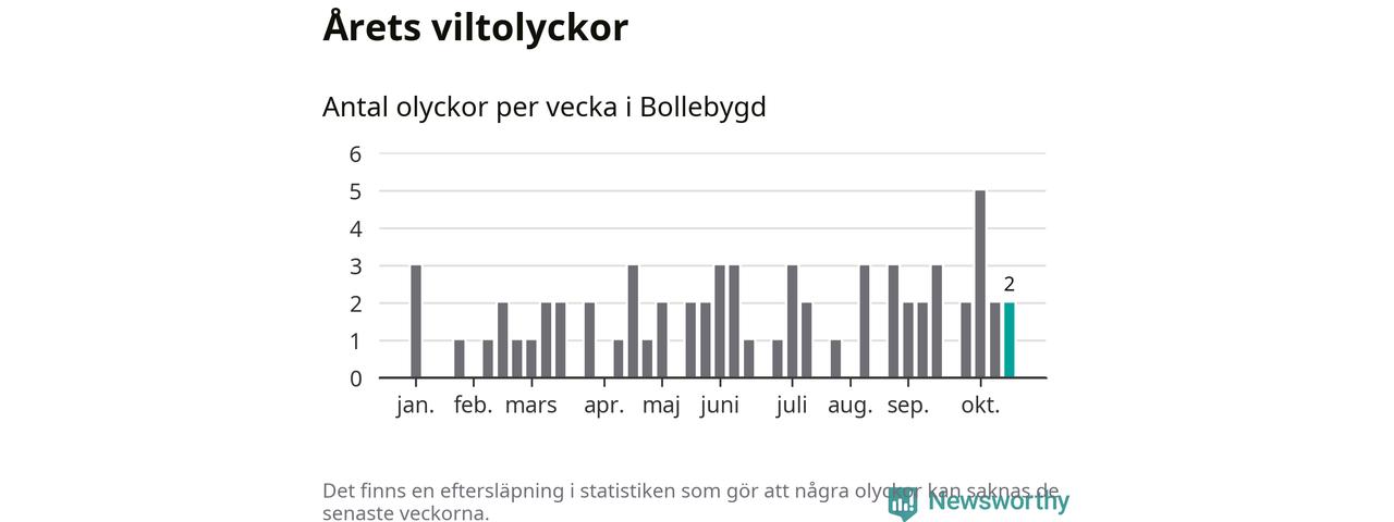Hittills har två viltolyckor rapporterats in i Bollebygds kommun från vecka 43. Se listan här.
