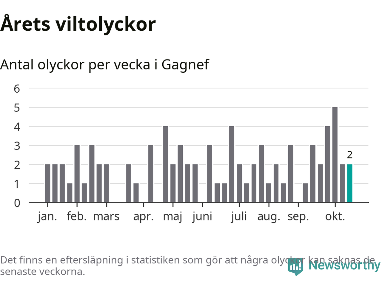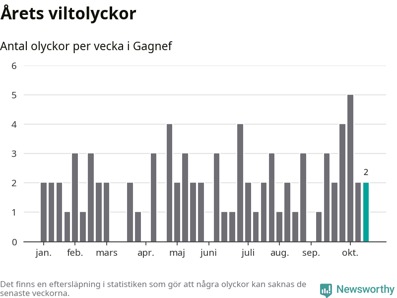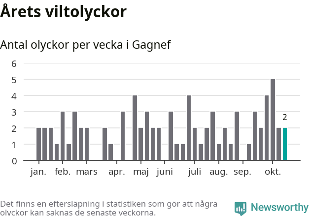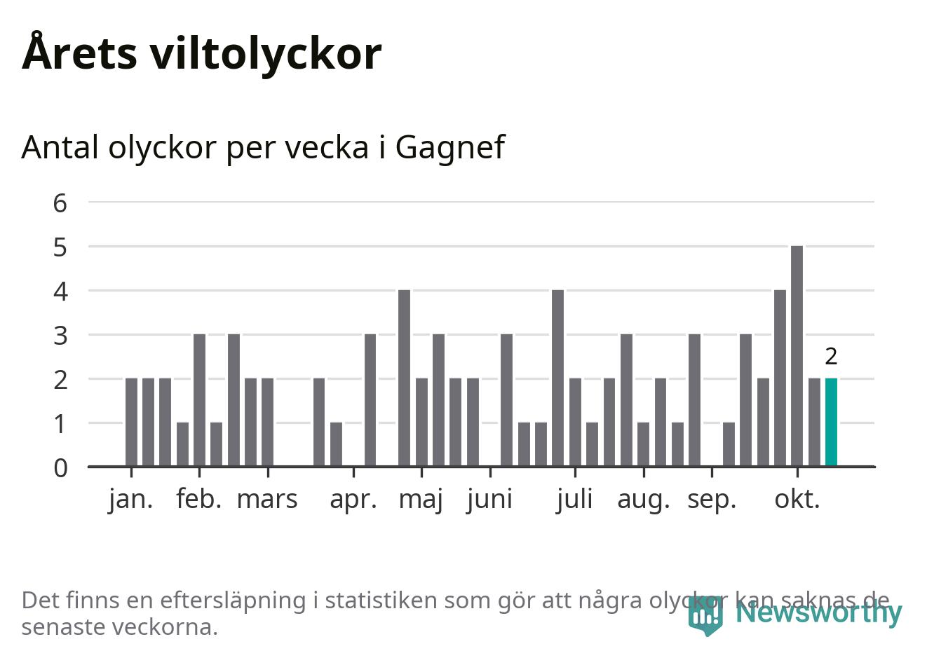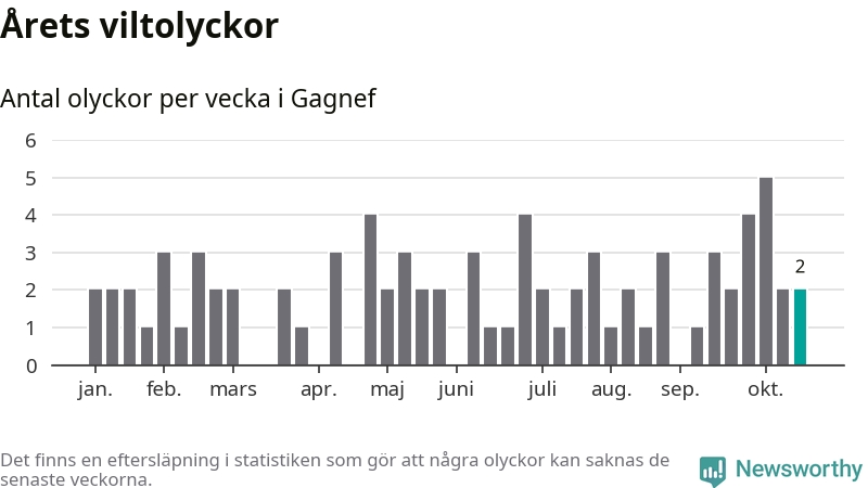 Hittills har två viltolyckor rapporterats in i Gagnefs kommun från vecka 43. Se listan här.