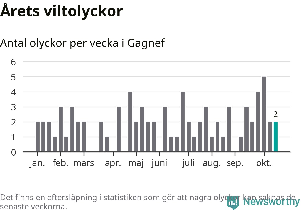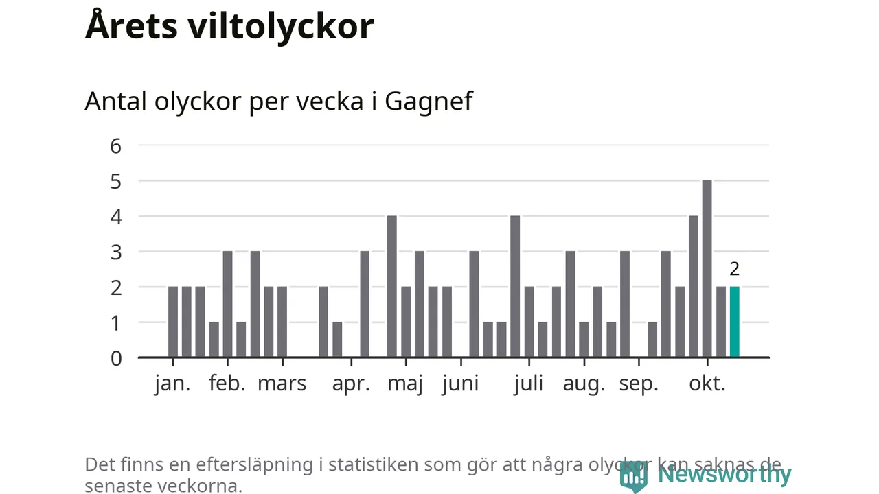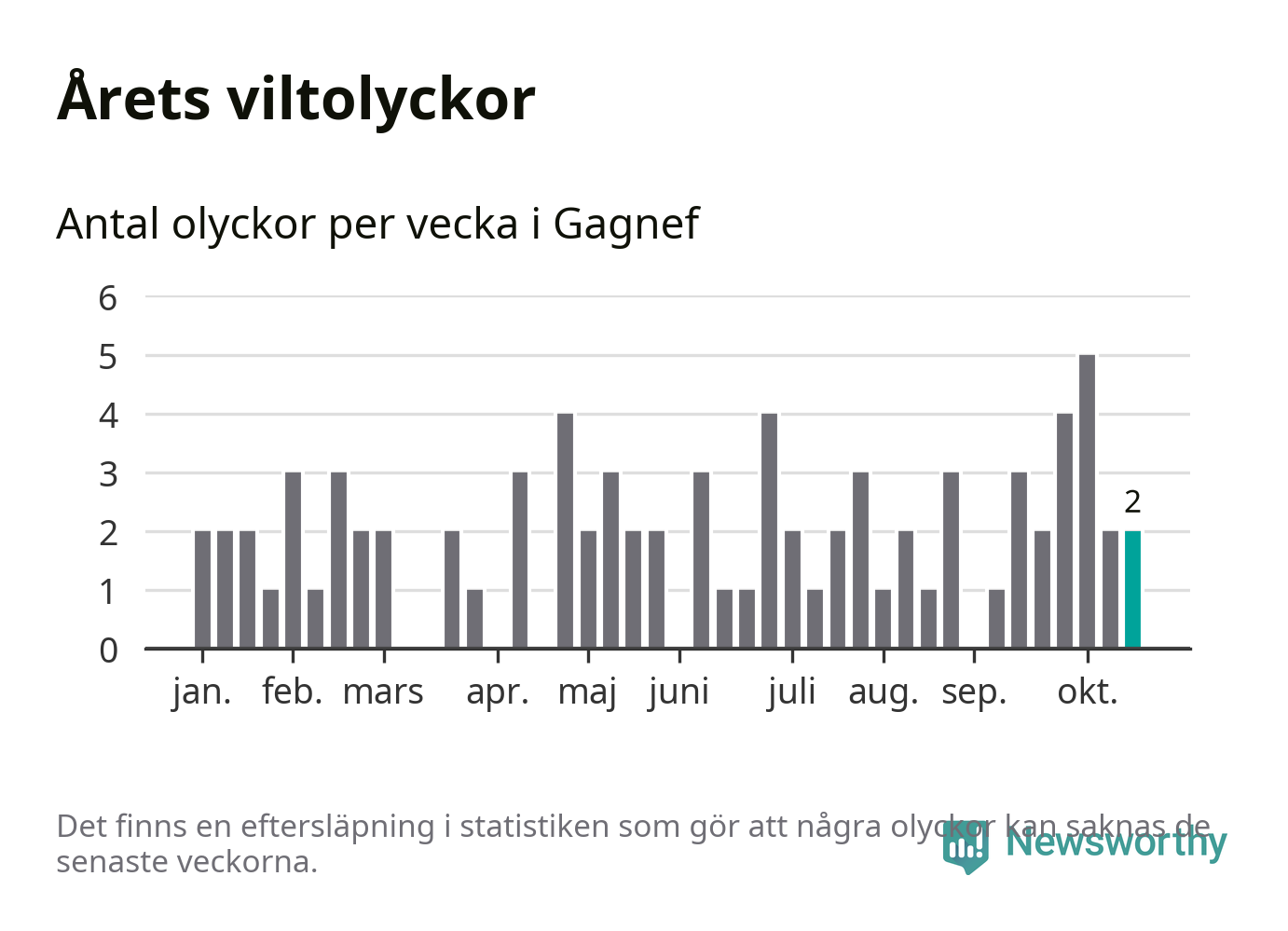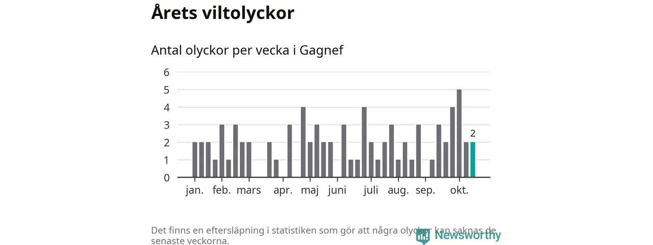 Hittills har två viltolyckor rapporterats in i Gagnefs kommun från vecka 43. Se listan här.