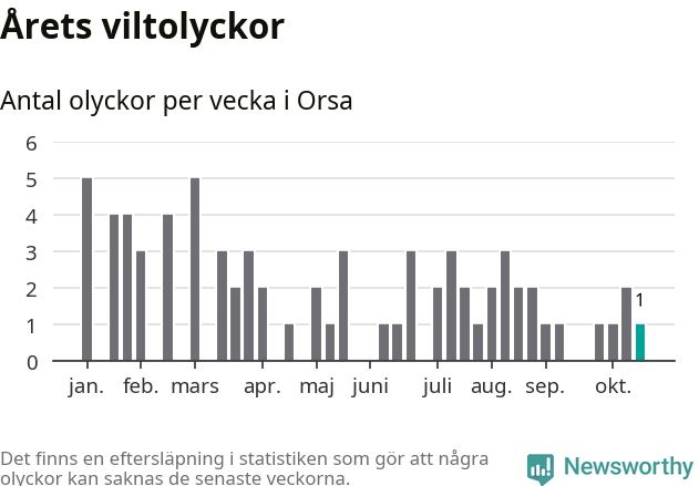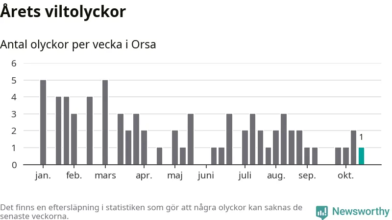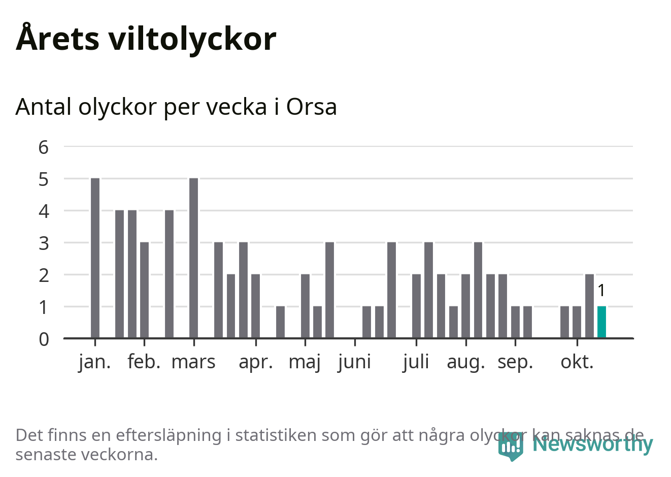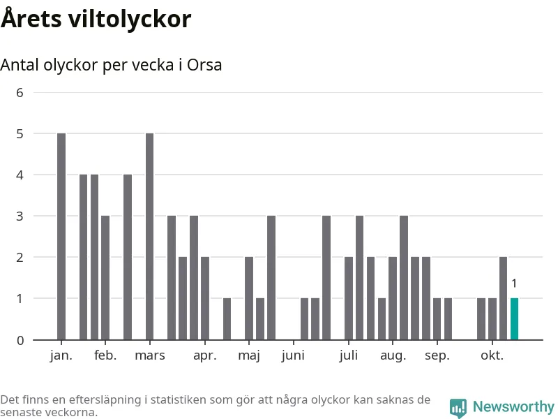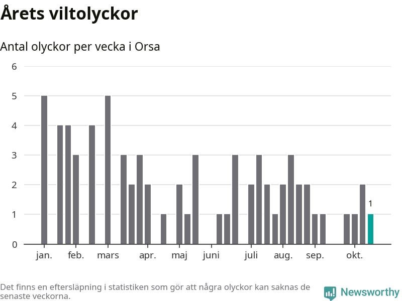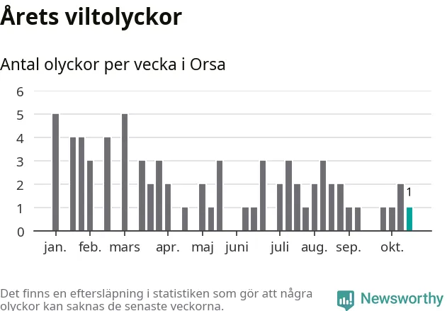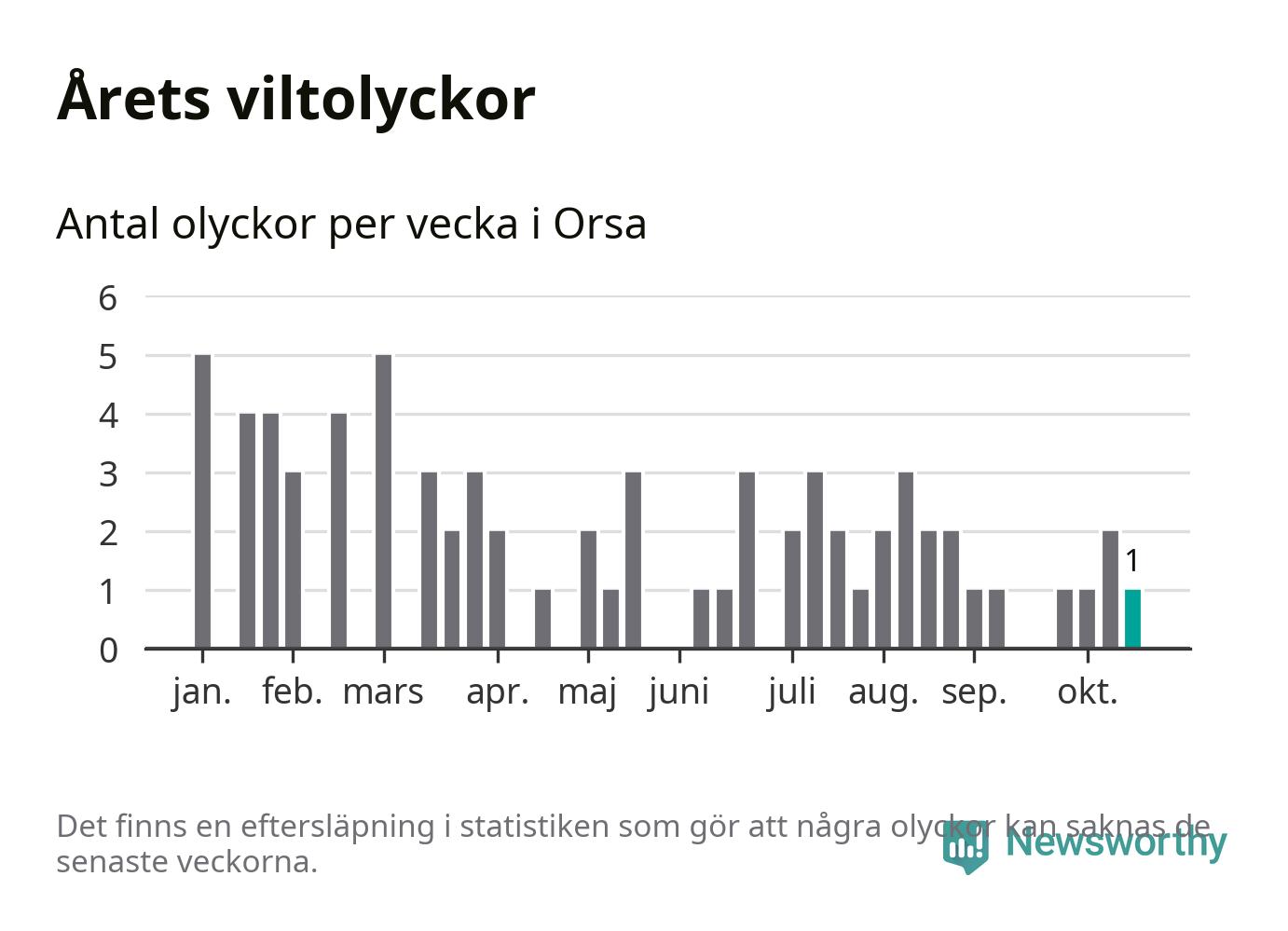 Från förra veckan (vecka 43) har hittills en viltolycka rapporterats in i Orsa kommun.