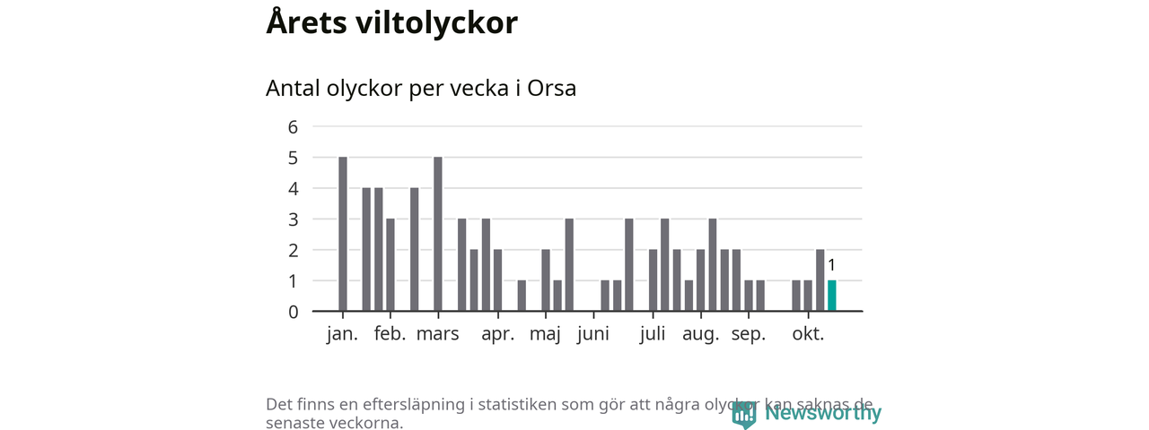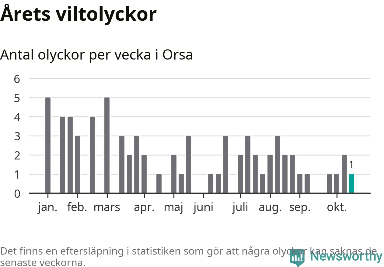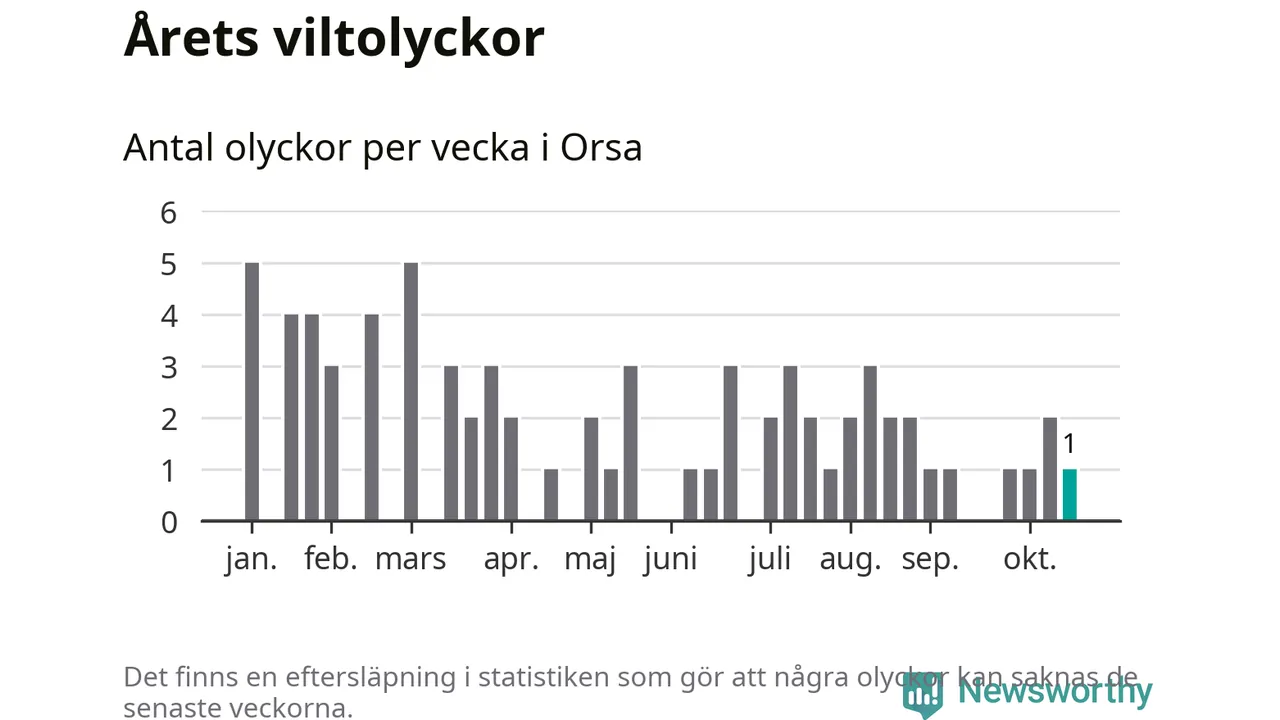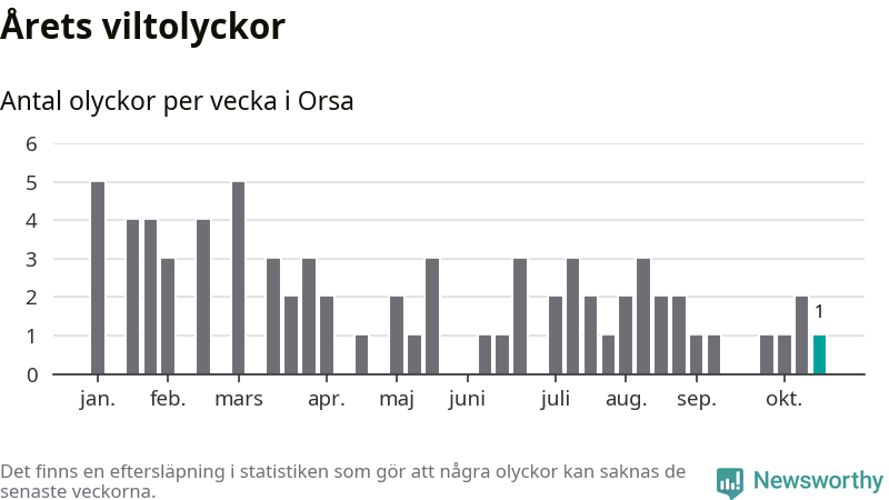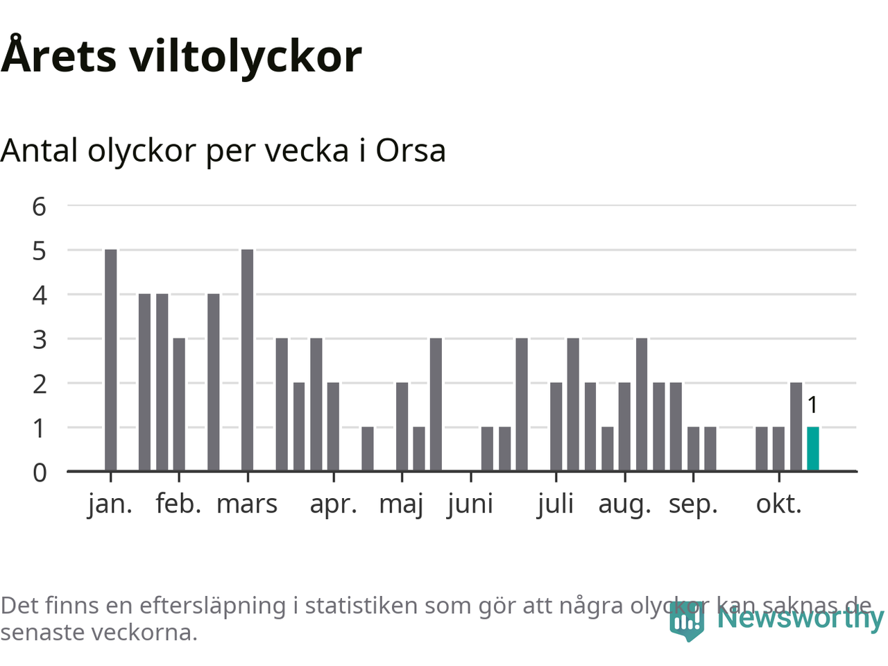 Från förra veckan (vecka 43) har hittills en viltolycka rapporterats in i Orsa kommun.