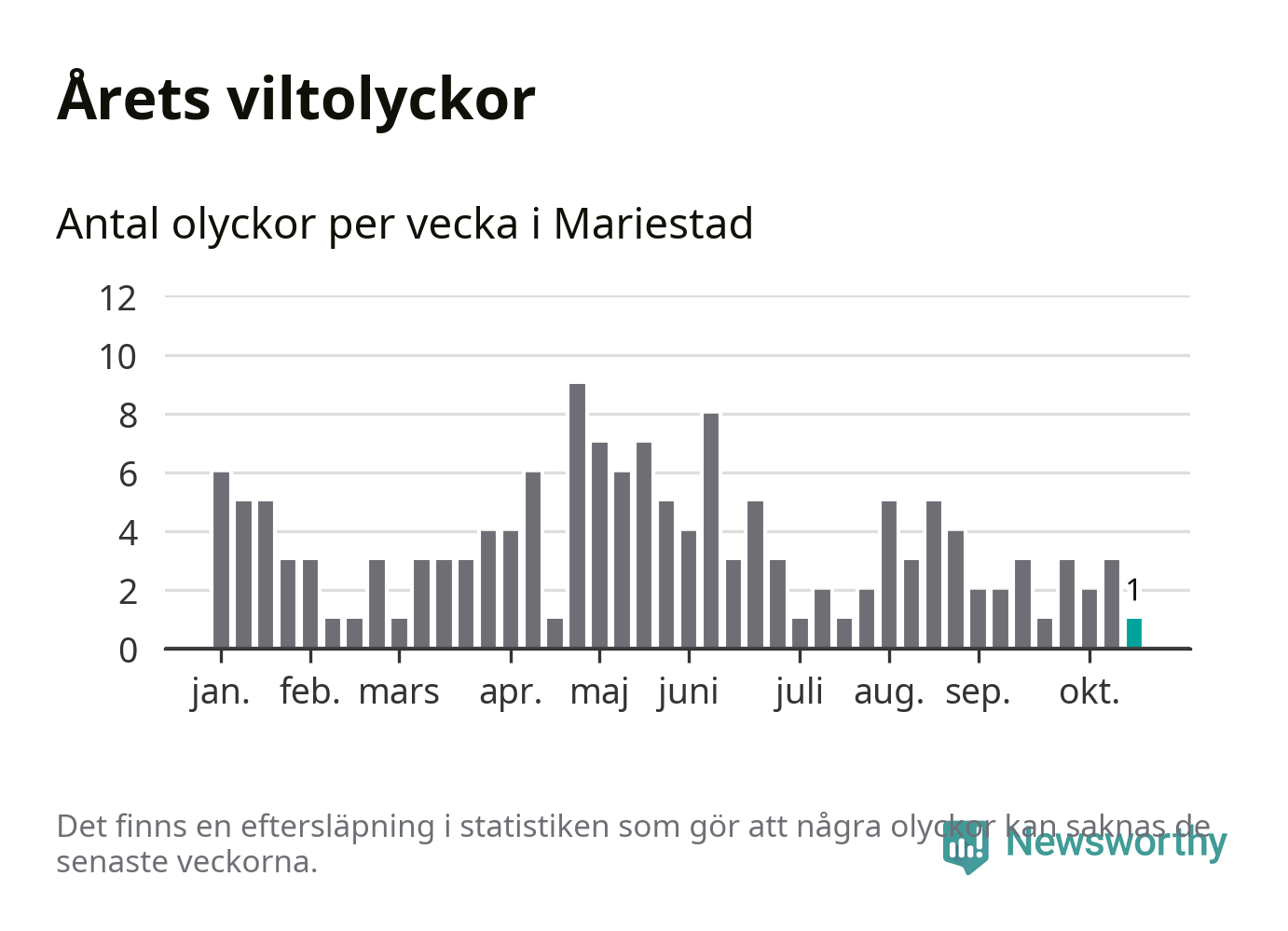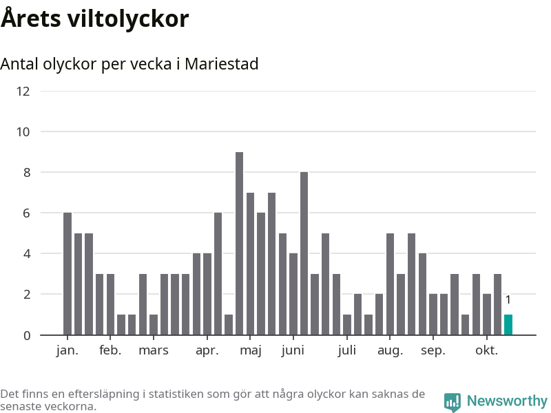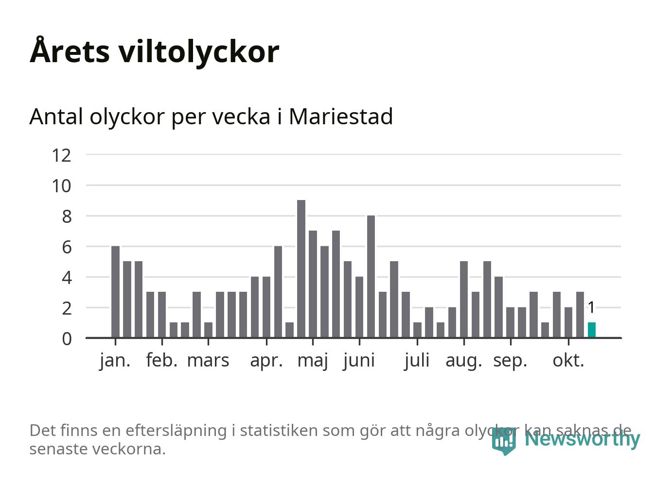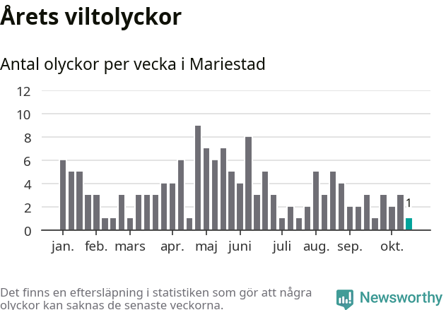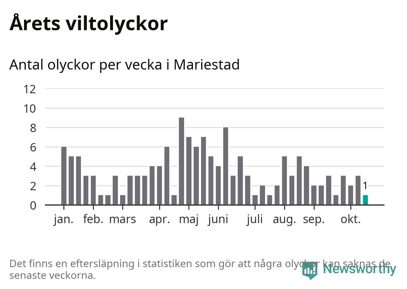 Från förra veckan (vecka 43) har hittills en viltolycka rapporterats in i Mariestads kommun.