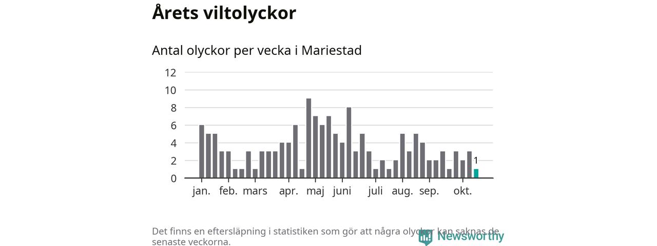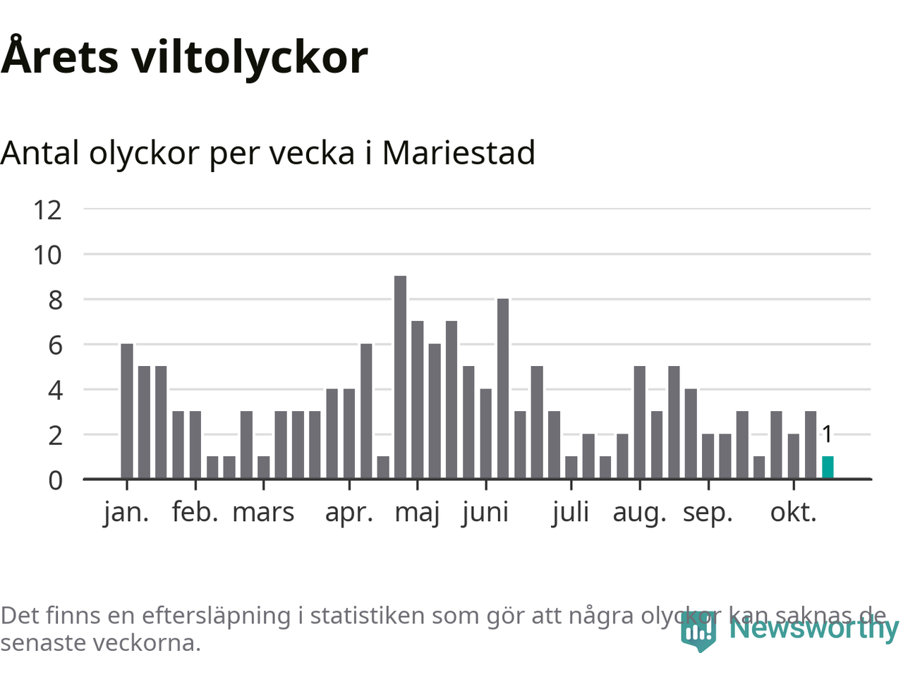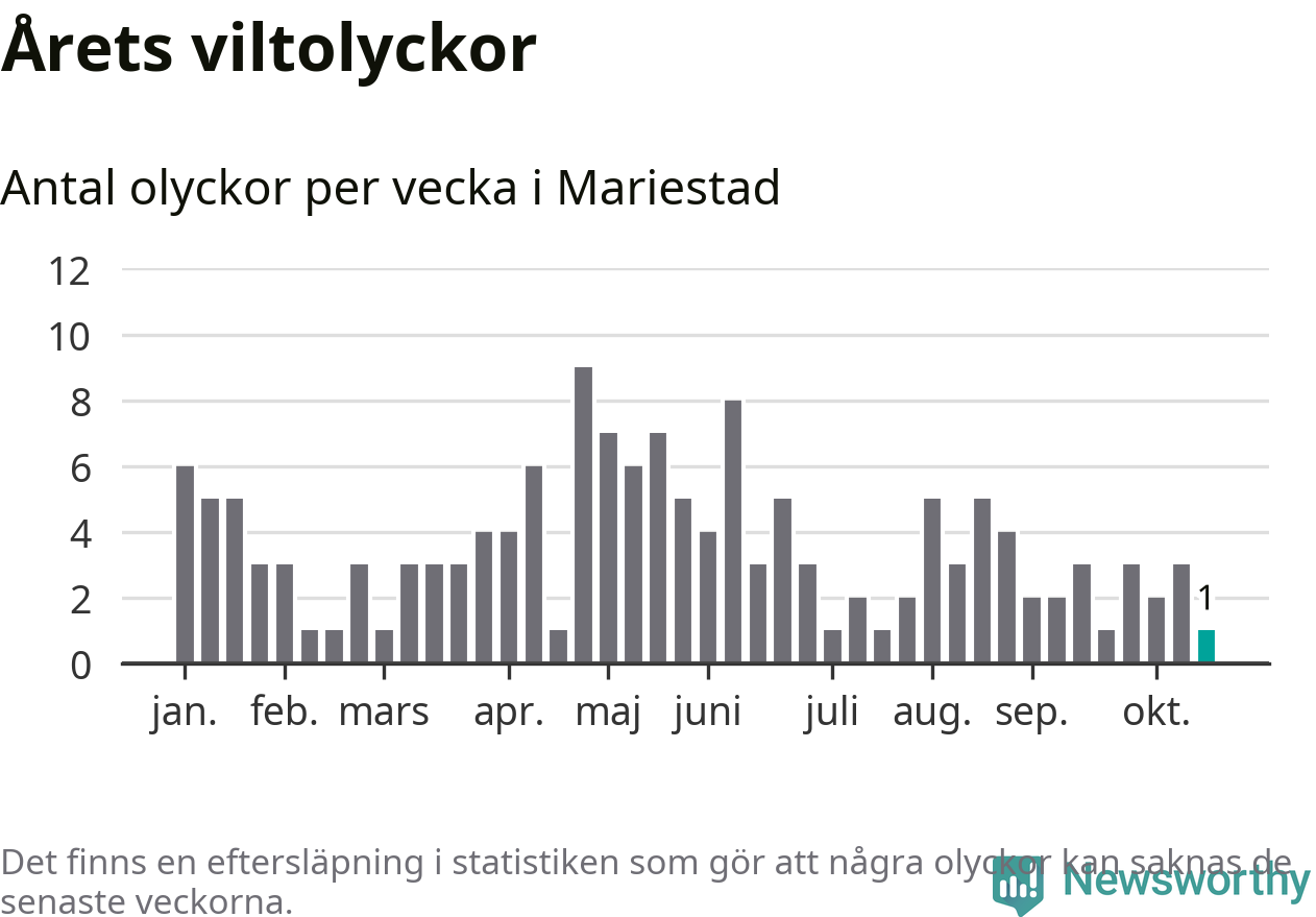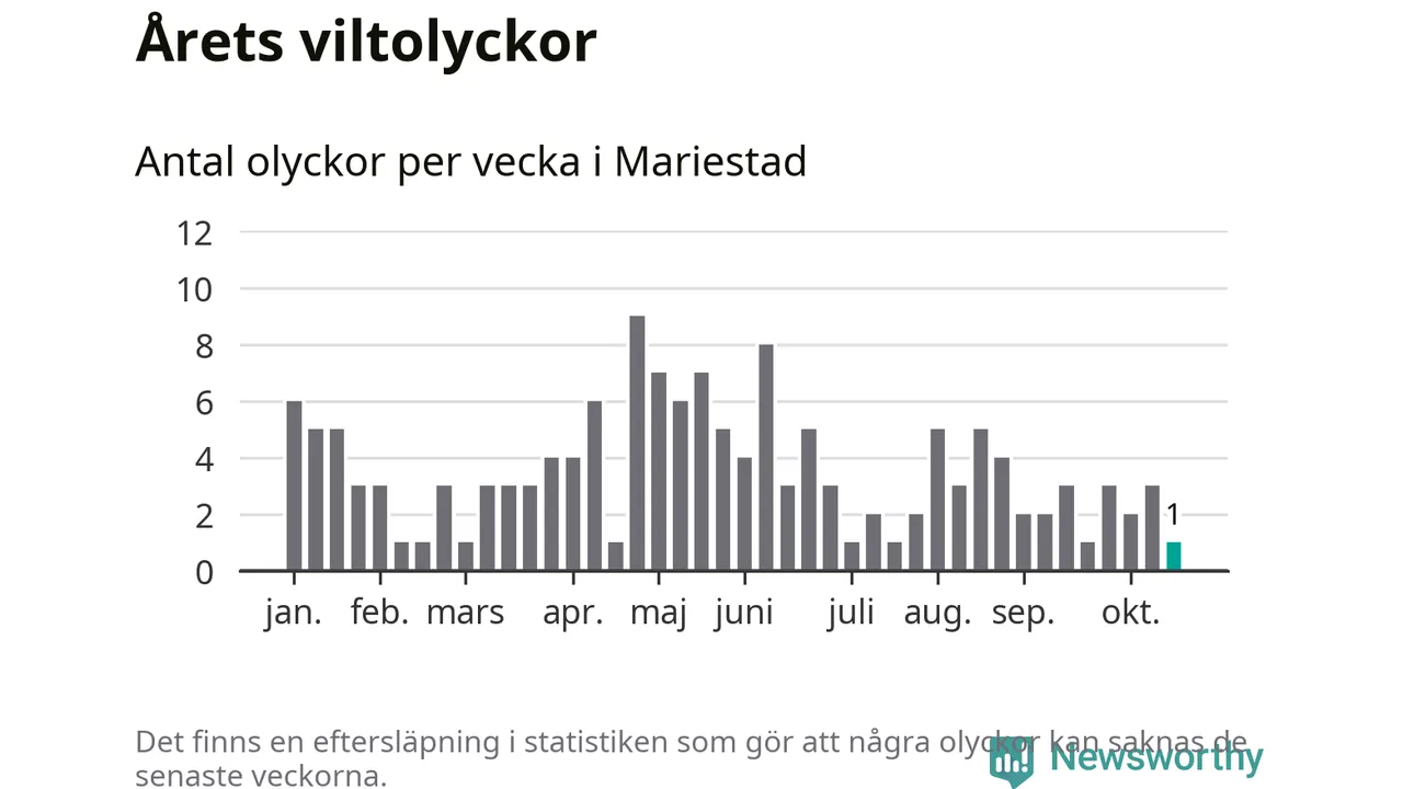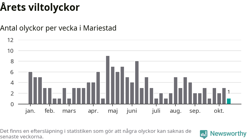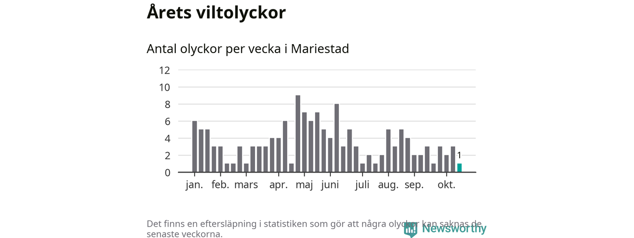 Från förra veckan (vecka 43) har hittills en viltolycka rapporterats in i Mariestads kommun.