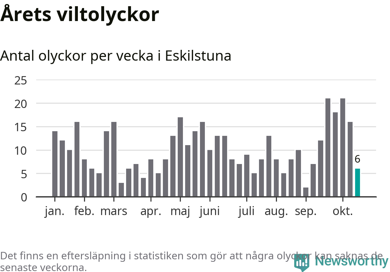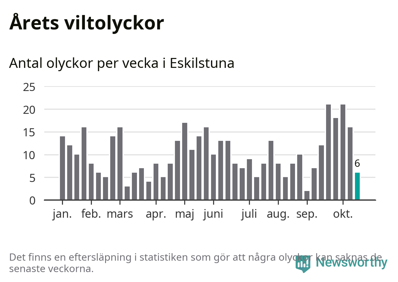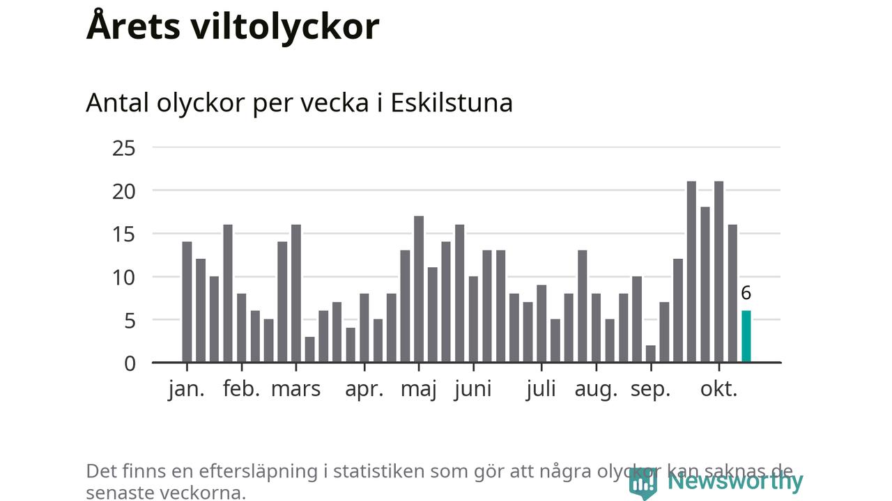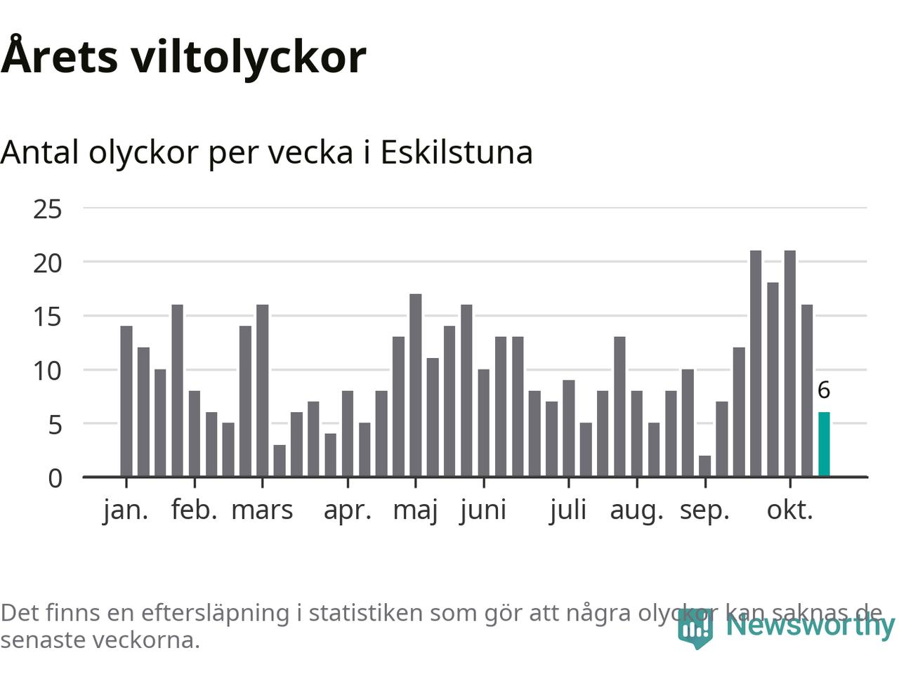 Hittills har sex viltolyckor rapporterats in i Eskilstuna kommun från vecka 43. Se listan här.