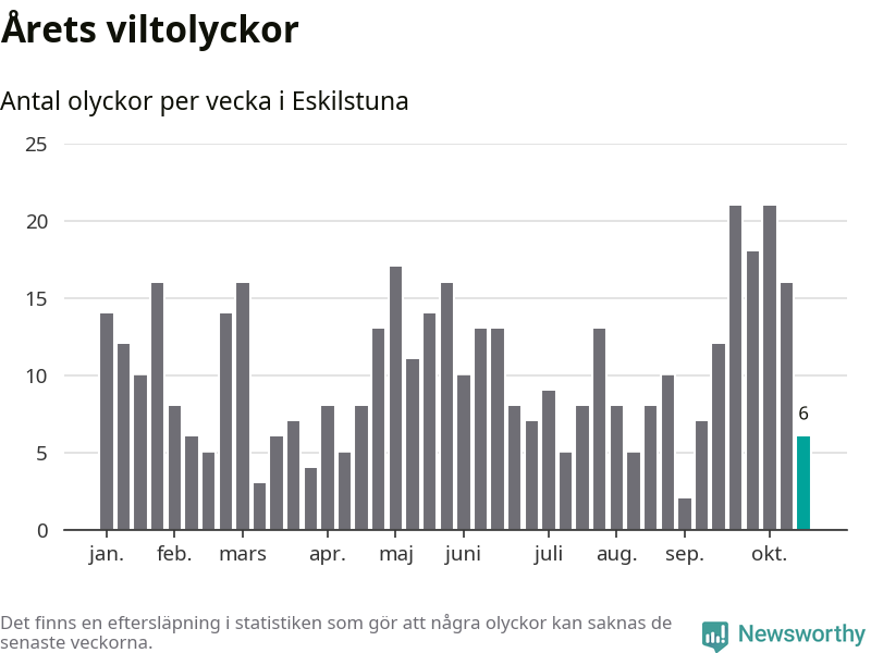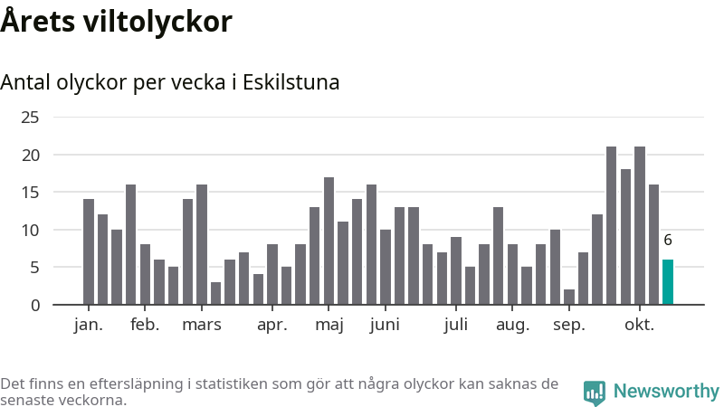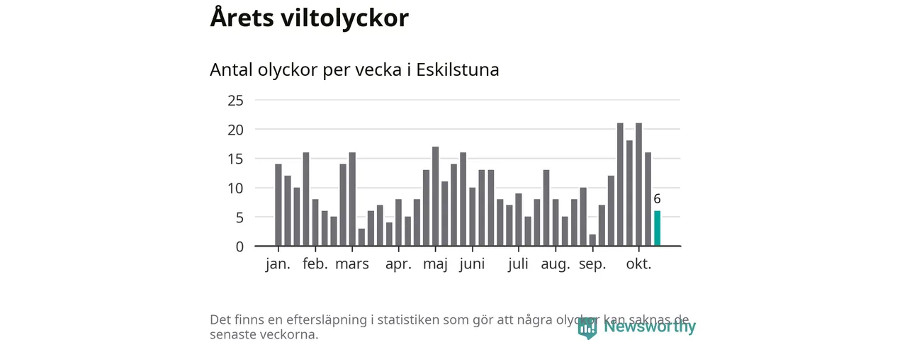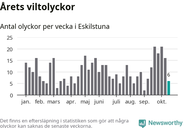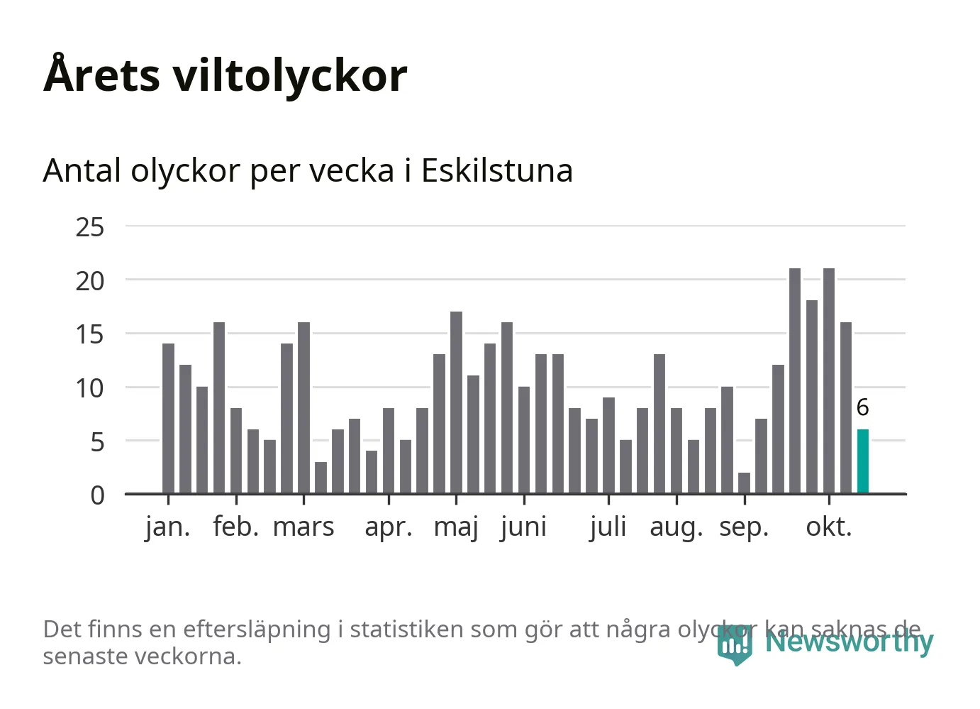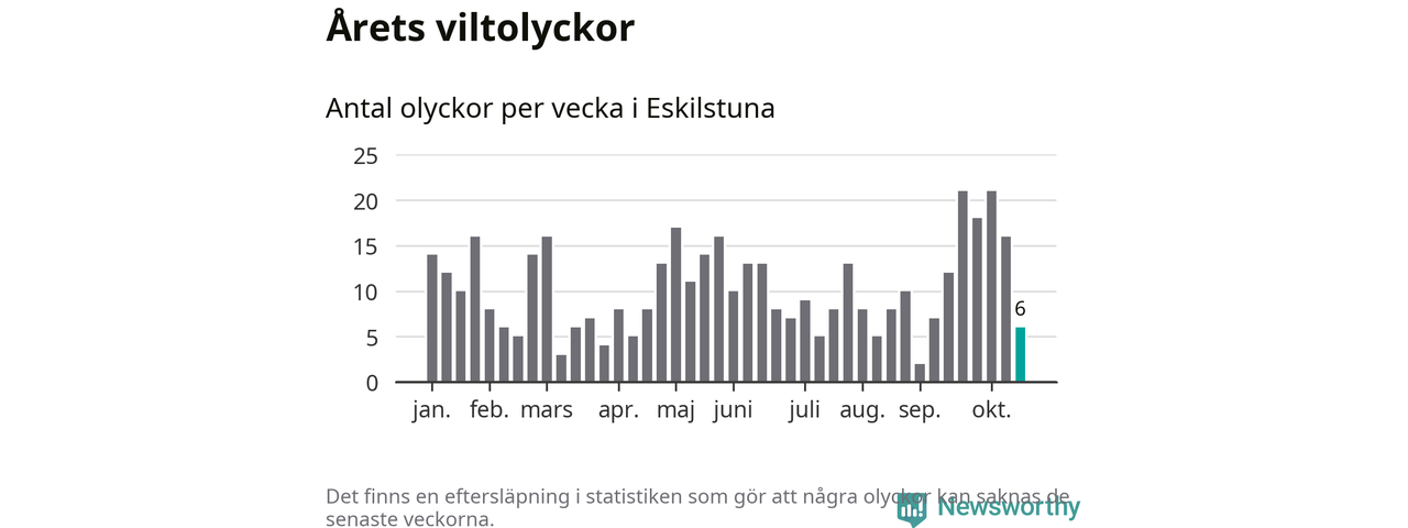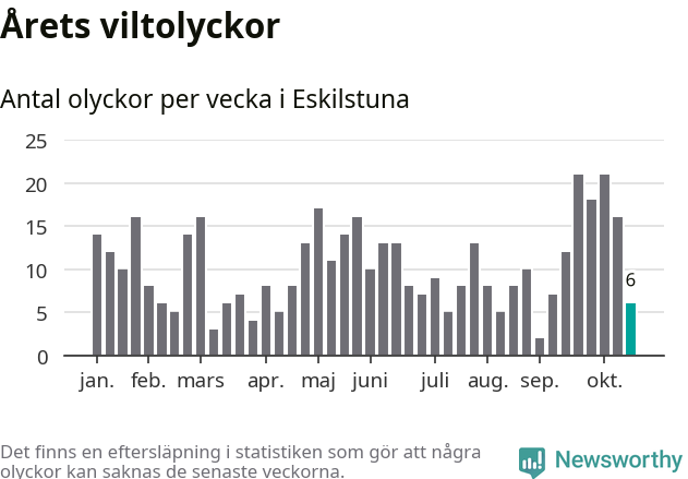 Hittills har sex viltolyckor rapporterats in i Eskilstuna kommun från vecka 43. Se listan här.
