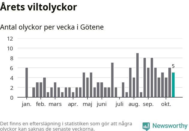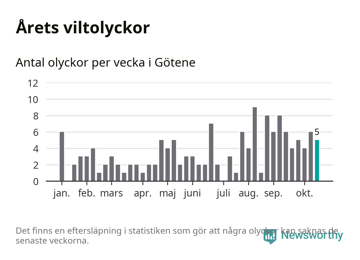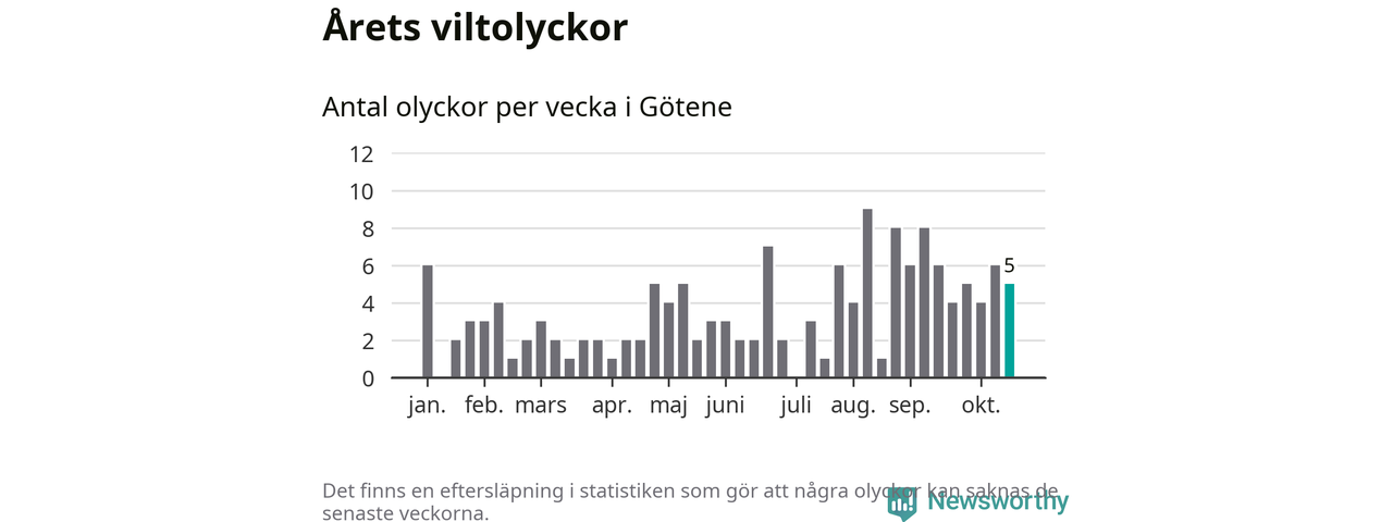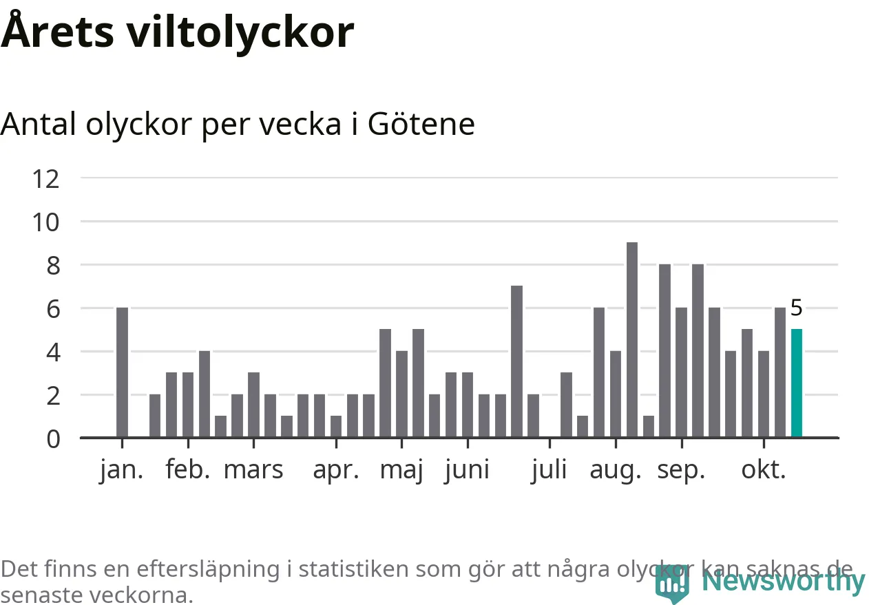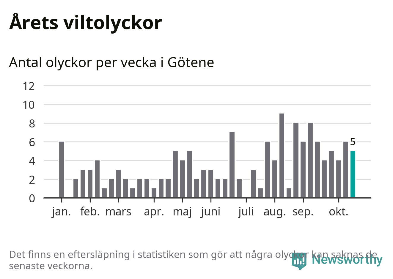 Hittills har fem viltolyckor rapporterats in i Götene kommun från vecka 43. Se listan här.