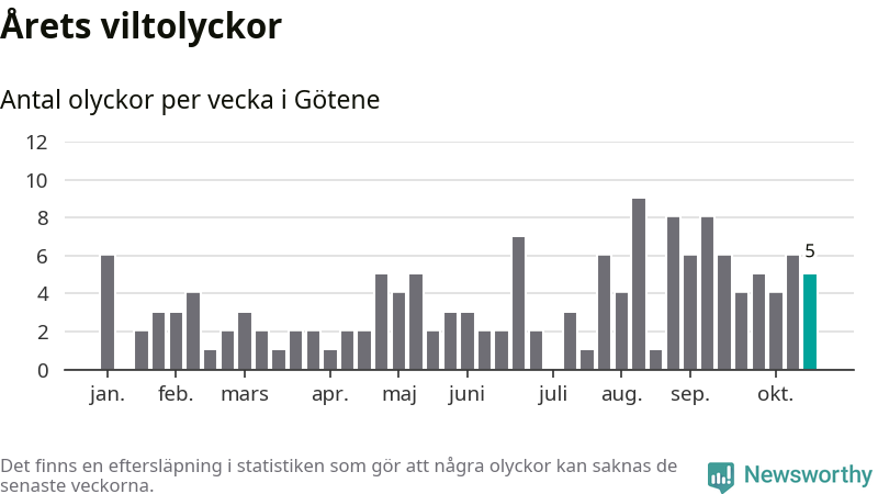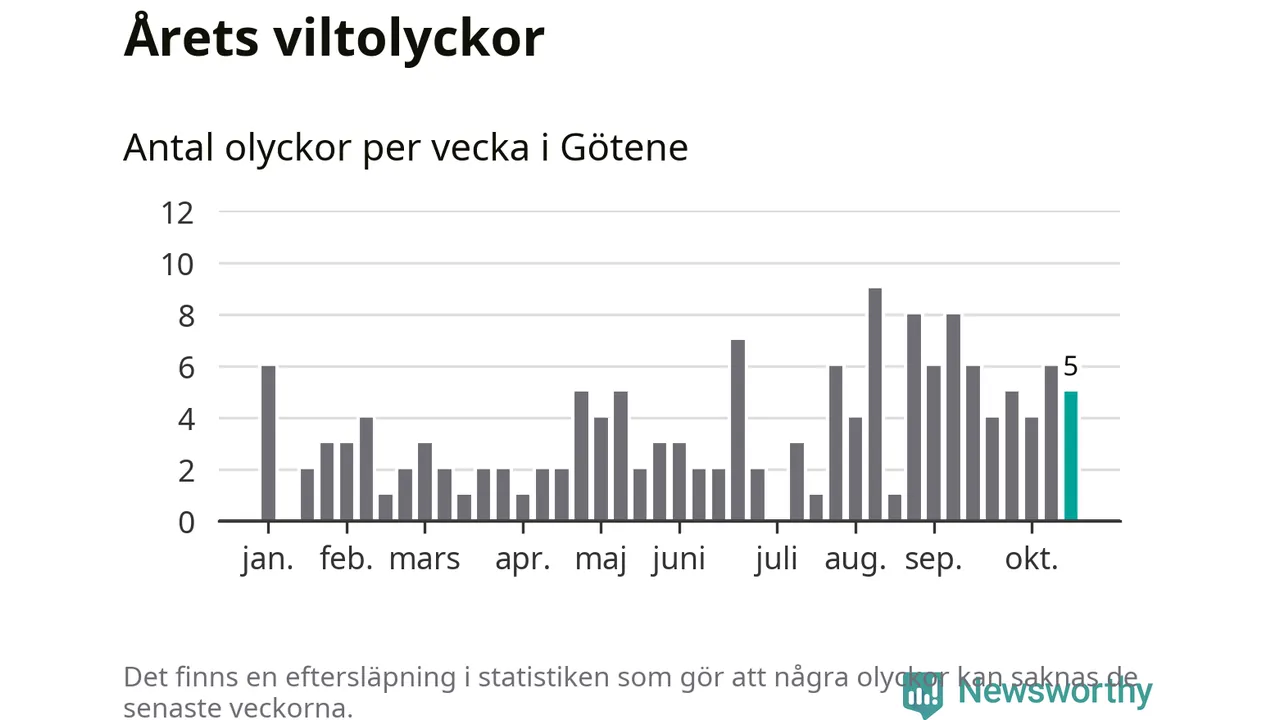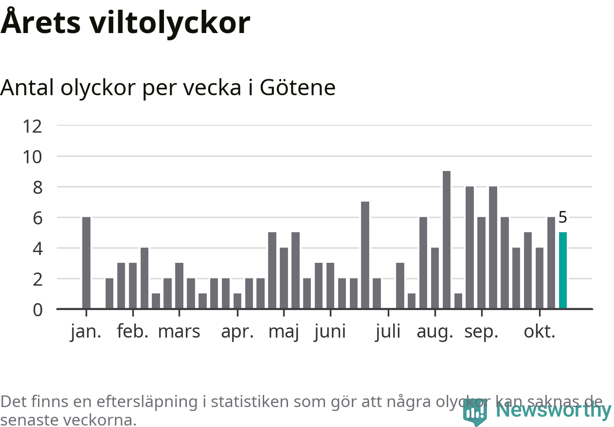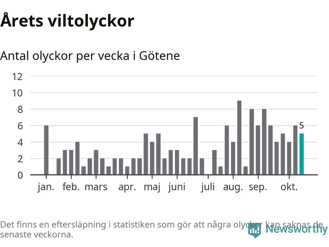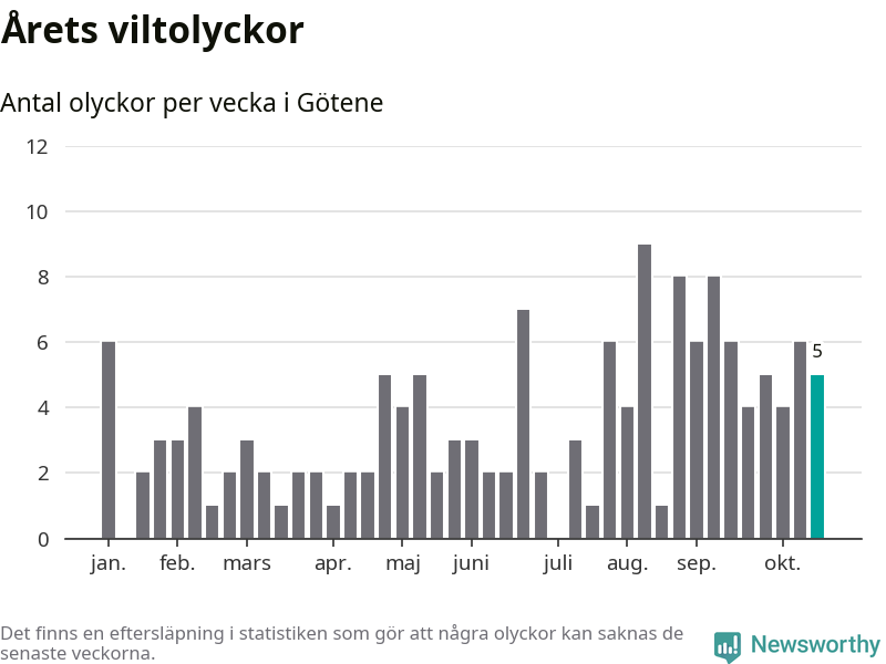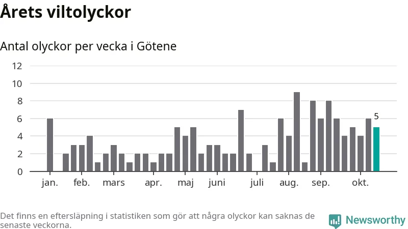 Hittills har fem viltolyckor rapporterats in i Götene kommun från vecka 43. Se listan här.