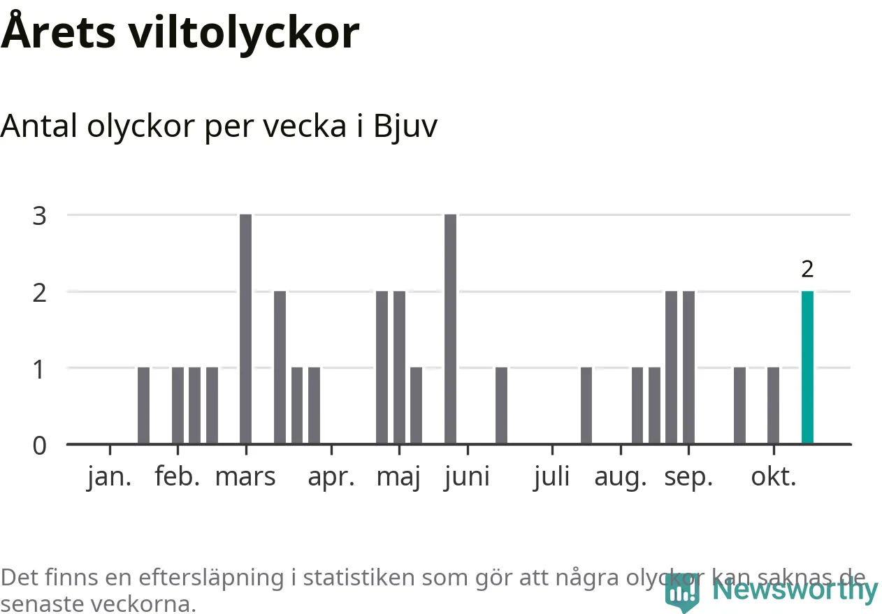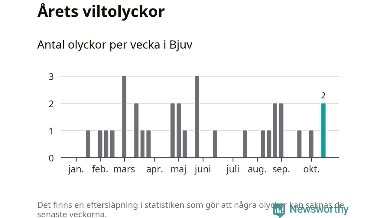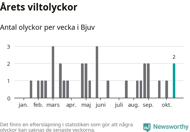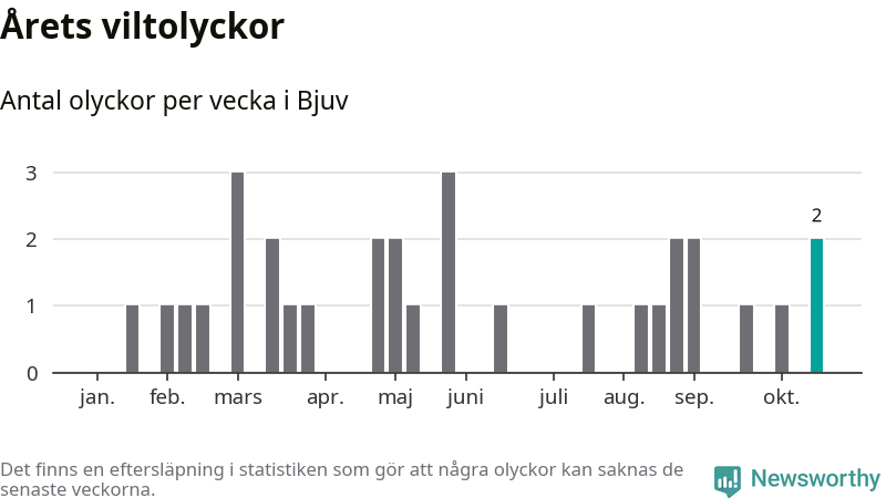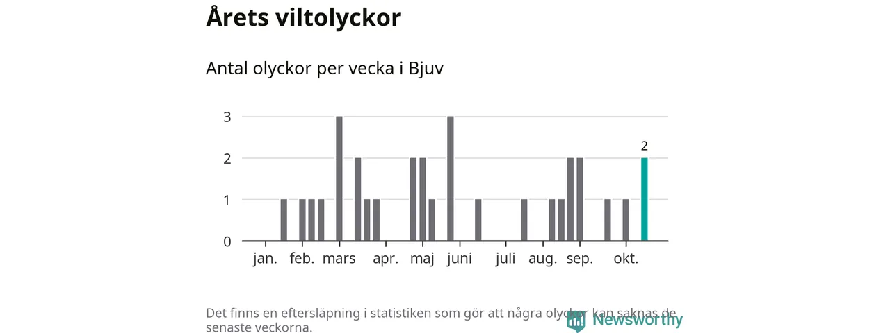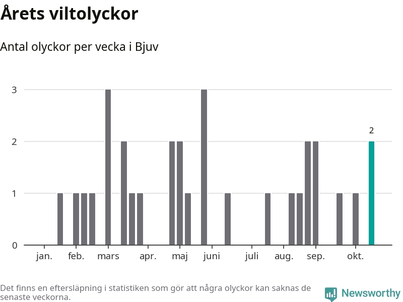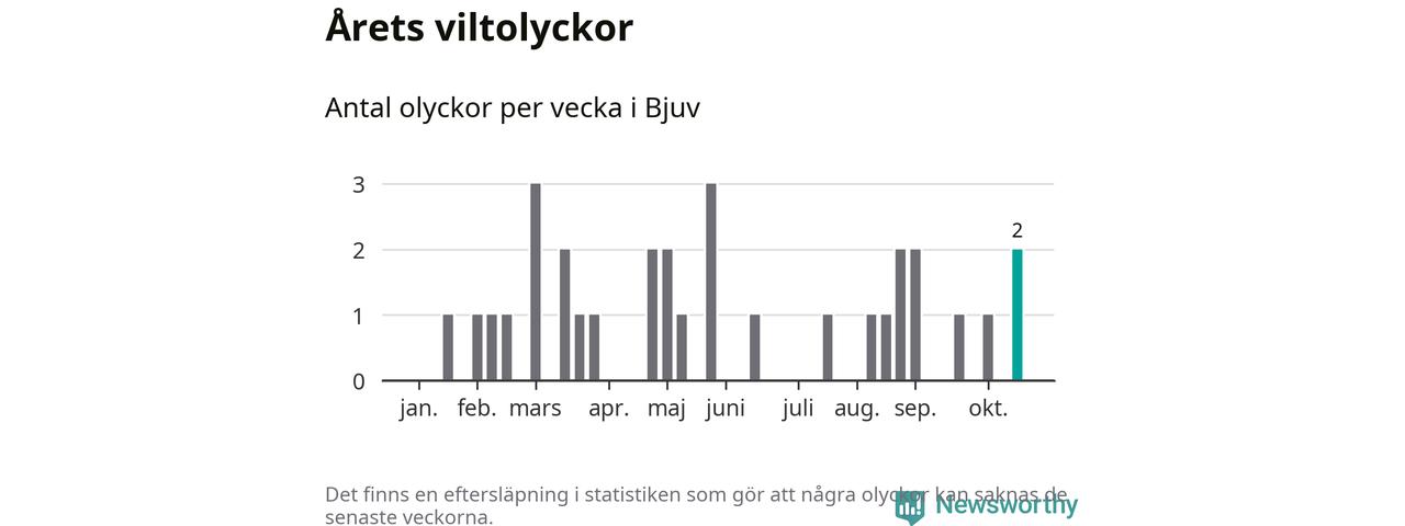 Hittills har två viltolyckor rapporterats in i Bjuvs kommun från vecka 43. Se listan här.
