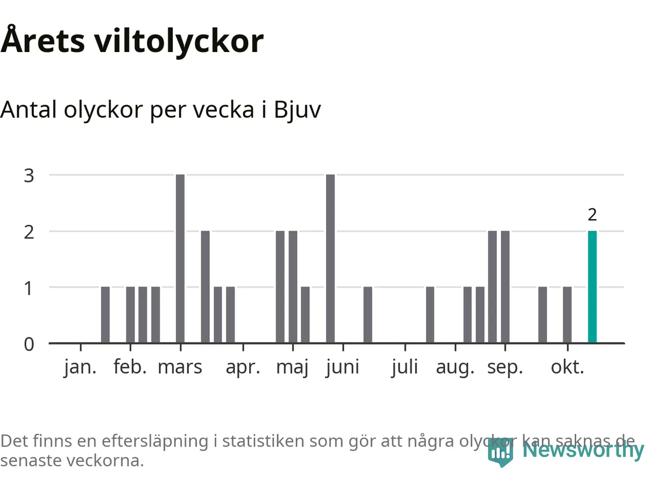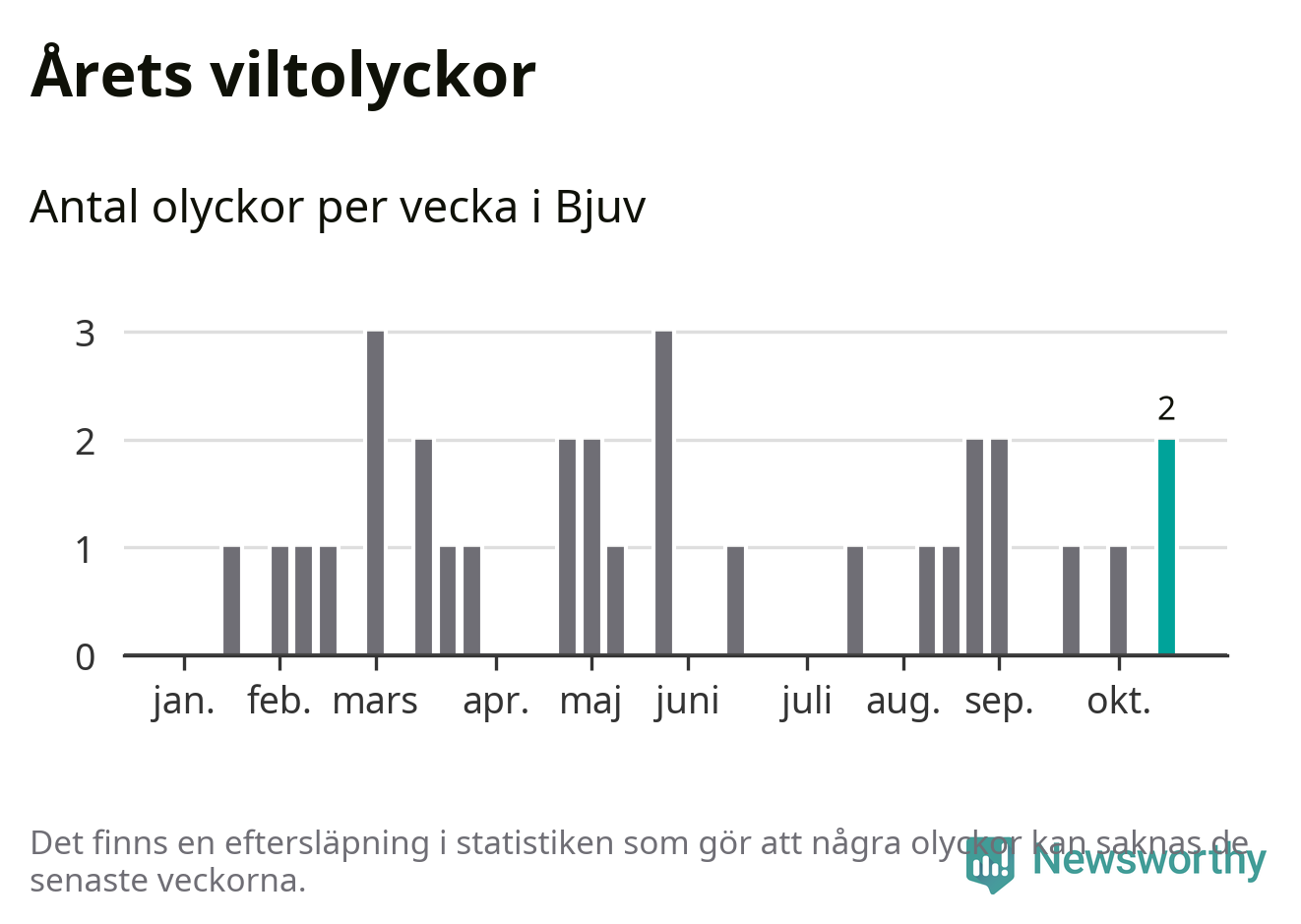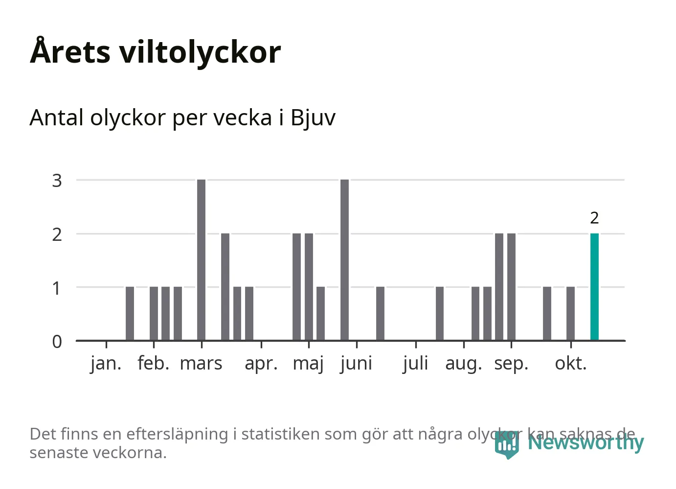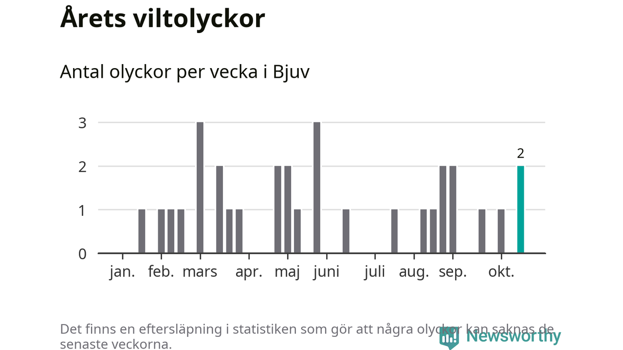 Hittills har två viltolyckor rapporterats in i Bjuvs kommun från vecka 43. Se listan här.