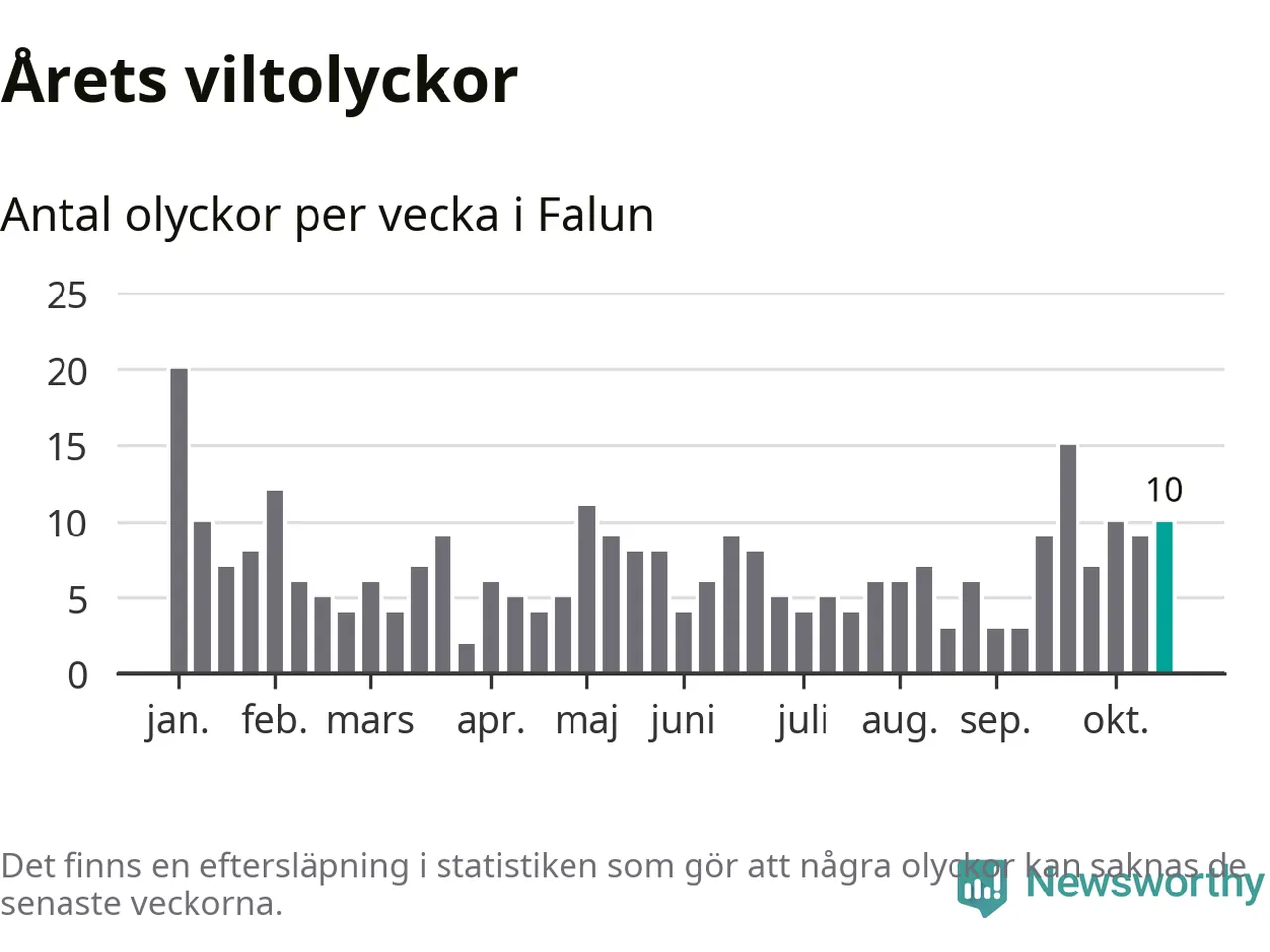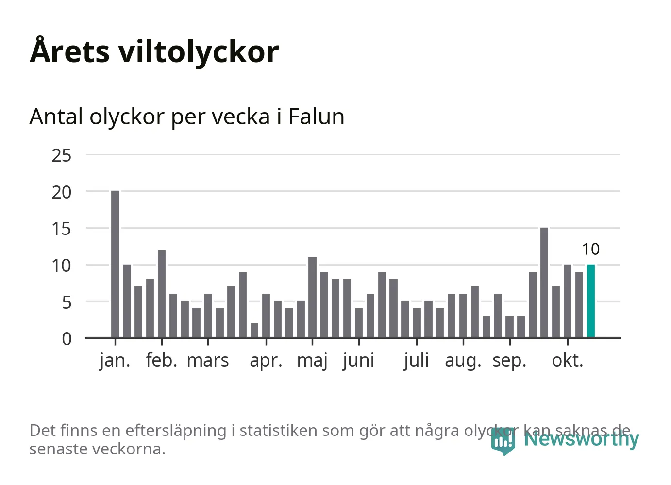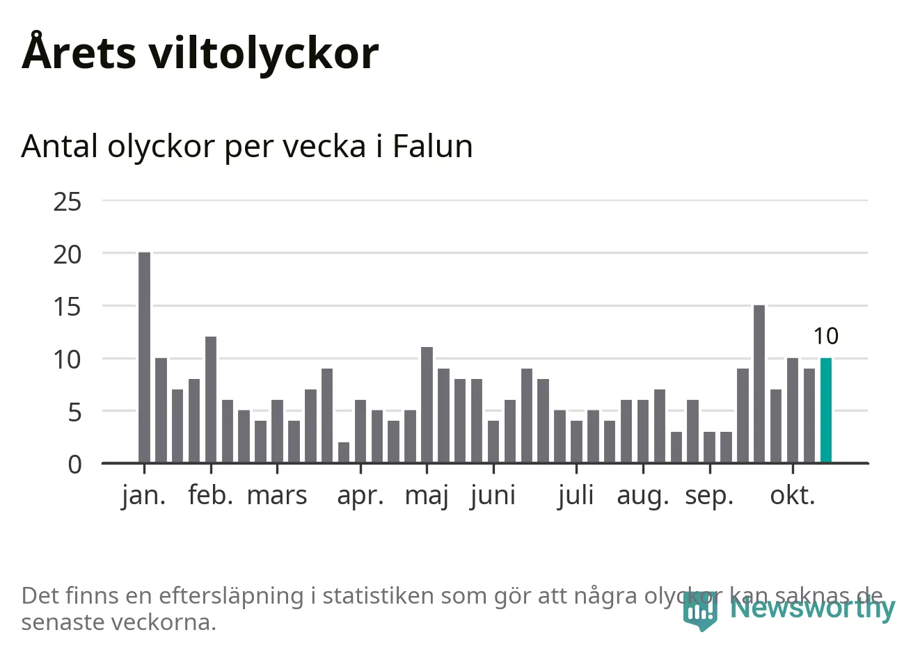 Hittills har tio viltolyckor rapporterats in i Falu kommun från vecka 43. Se listan här.