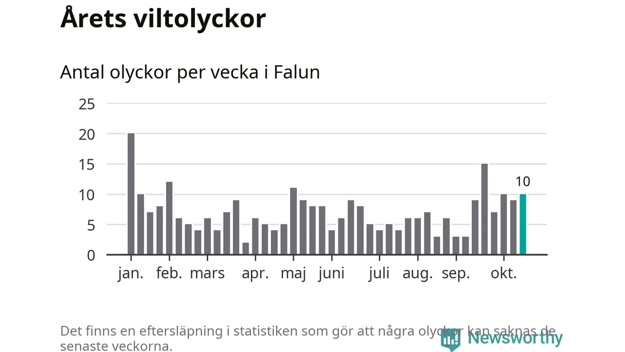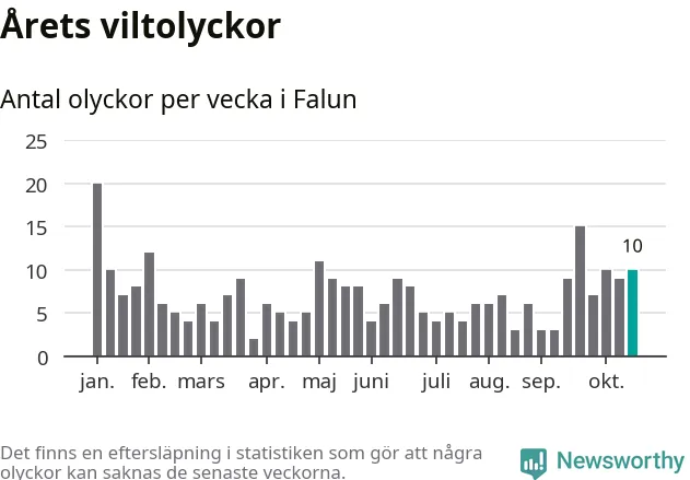 Totalt det här året har det inträffat 304 viltolyckor i kommunen. Det är mindre än genomsnittet för motsvarande period (omkring 352) de senaste tio åren.