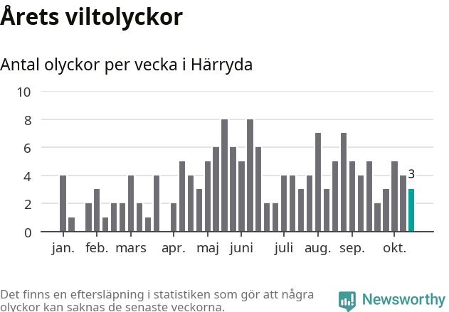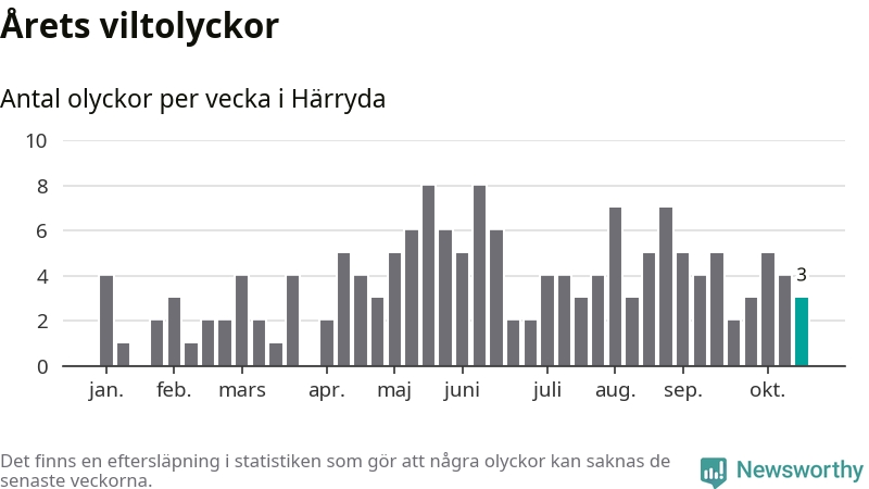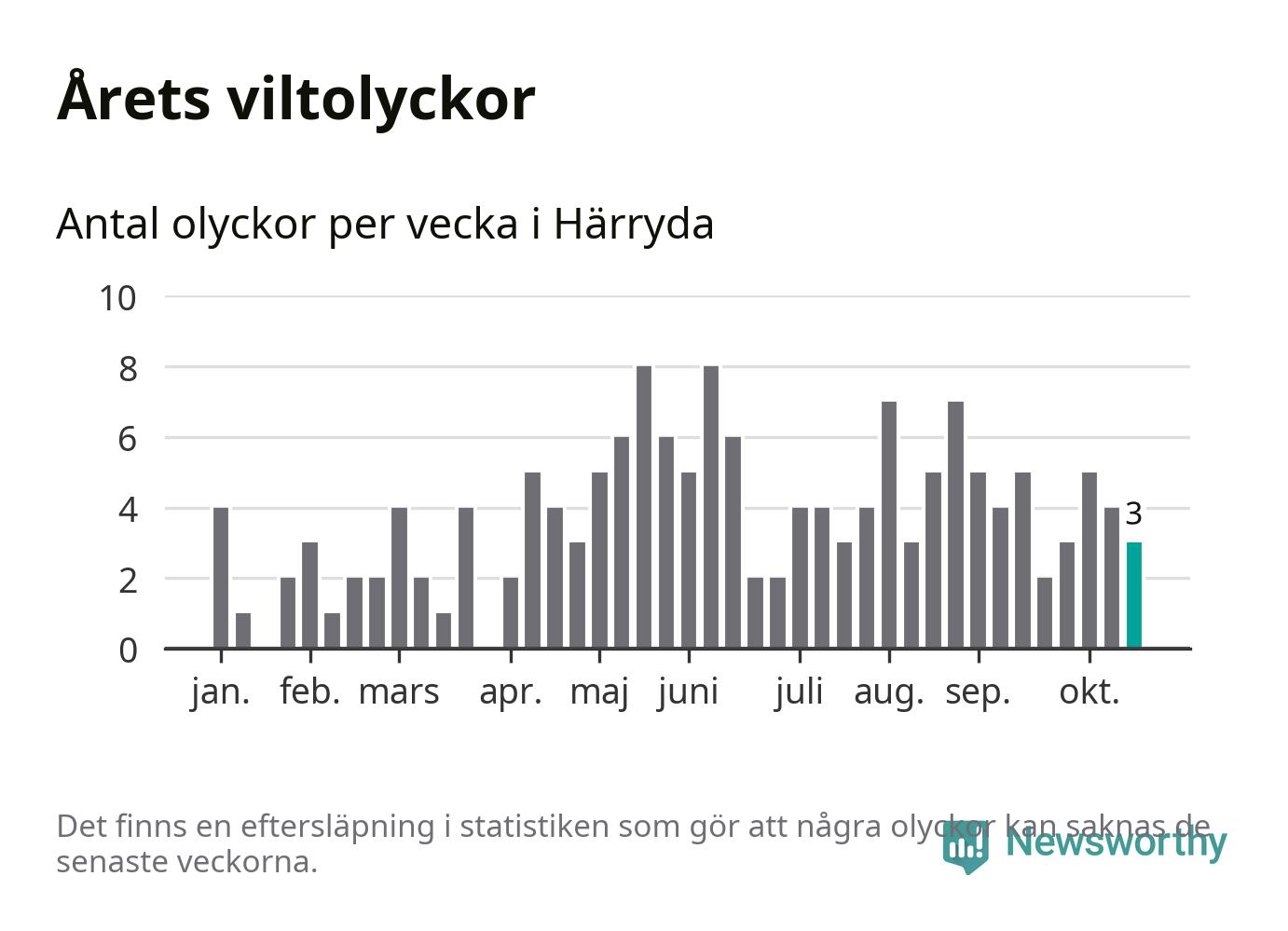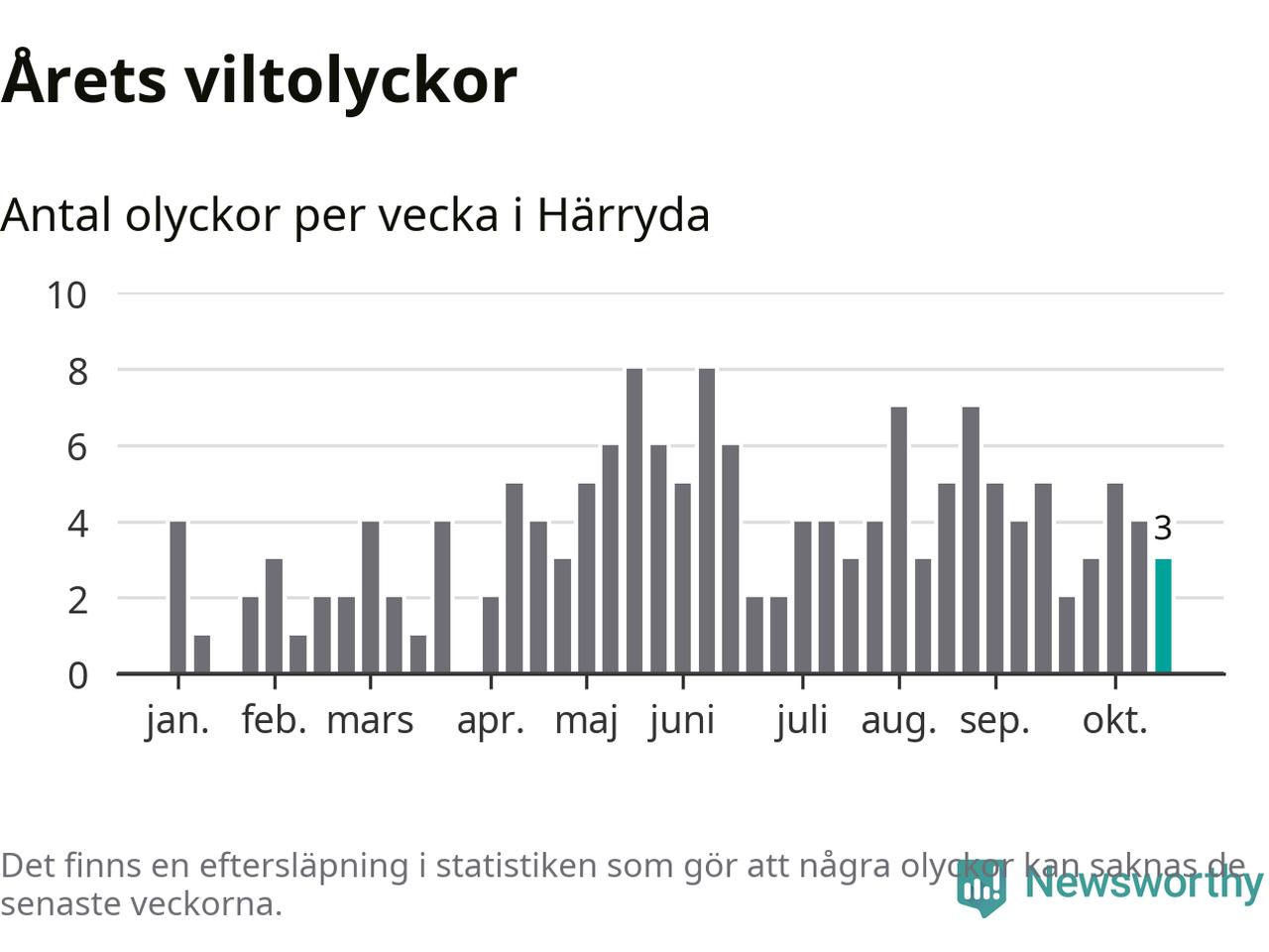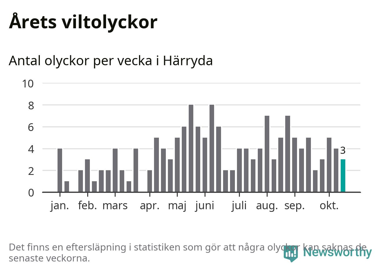 Hittills har tre viltolyckor rapporterats in i Härryda kommun från vecka 43. Se listan här.