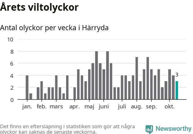 Totalt det här året har det inträffat 158 viltolyckor i kommunen. Det är mer än genomsnittet för motsvarande period (omkring 140) de senaste tio åren.