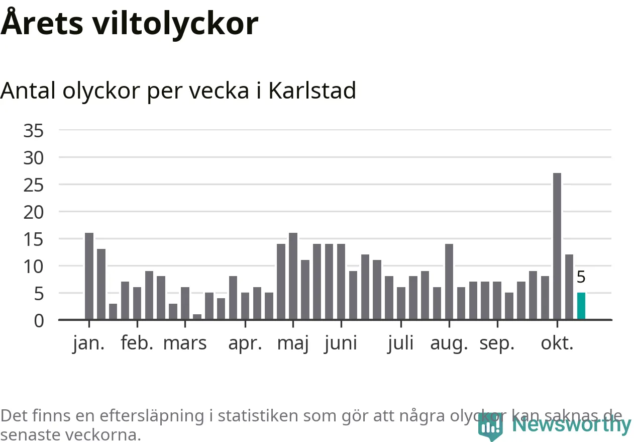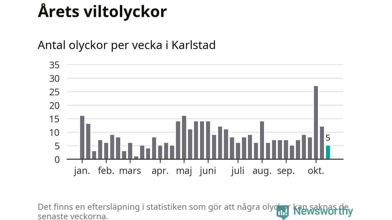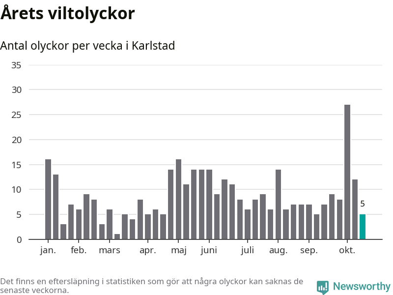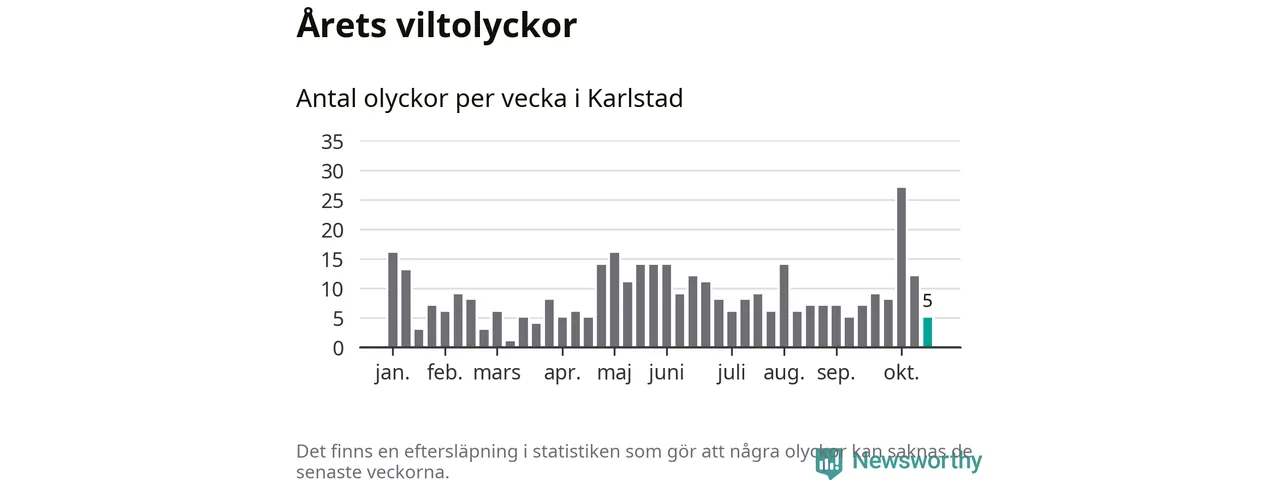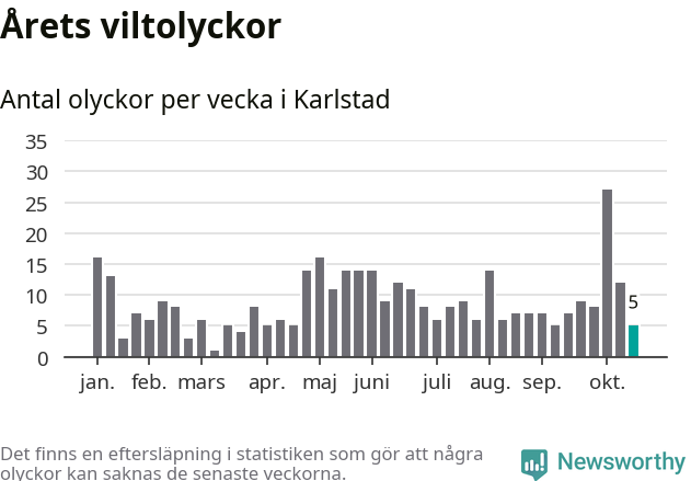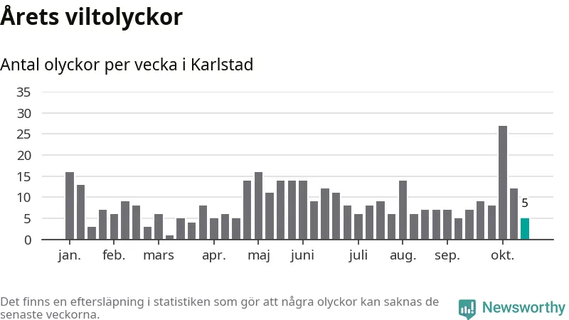 Hittills har fem viltolyckor rapporterats in i Karlstads kommun från vecka 43. Se listan här.