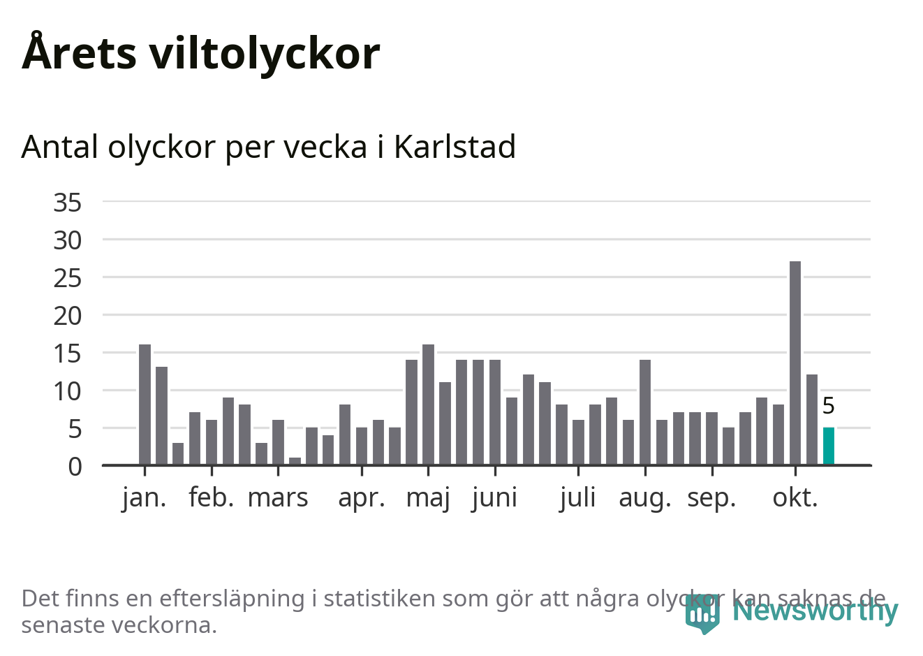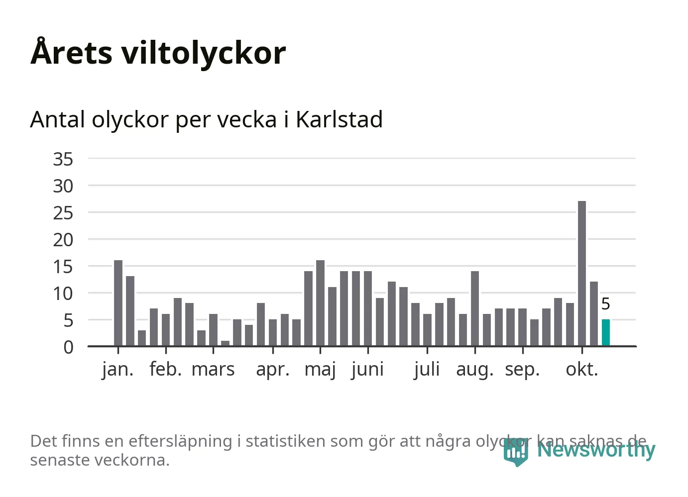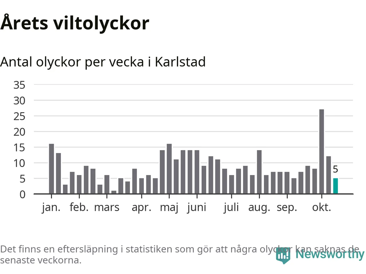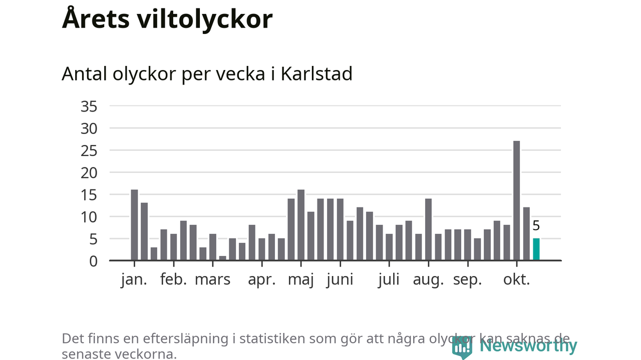 Hittills har fem viltolyckor rapporterats in i Karlstads kommun från vecka 43. Se listan här.