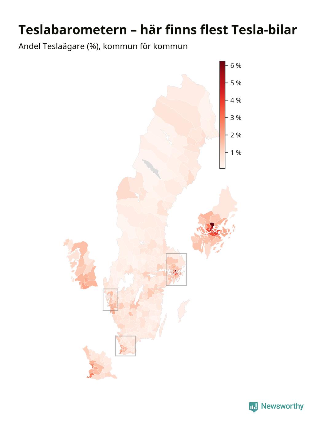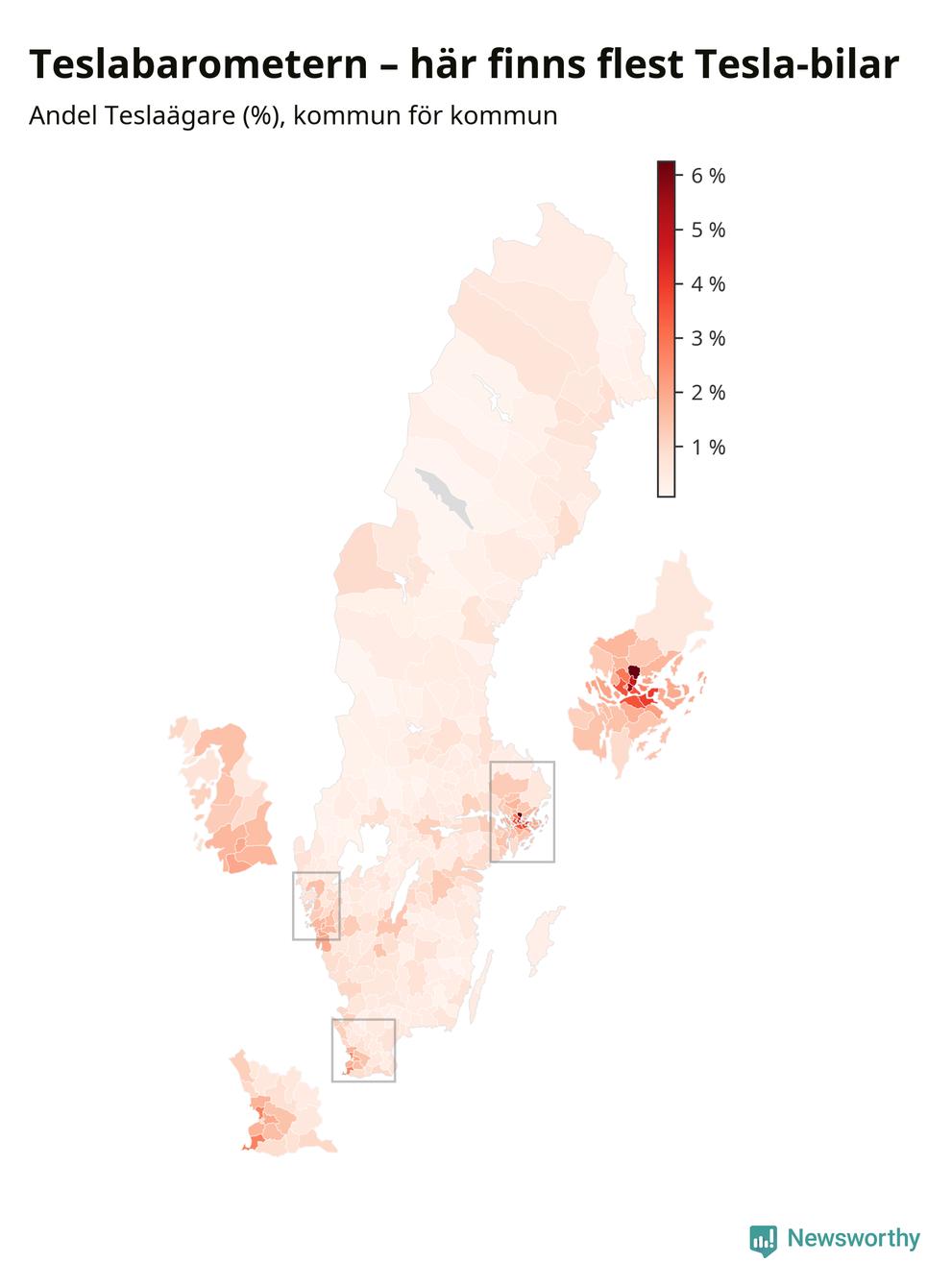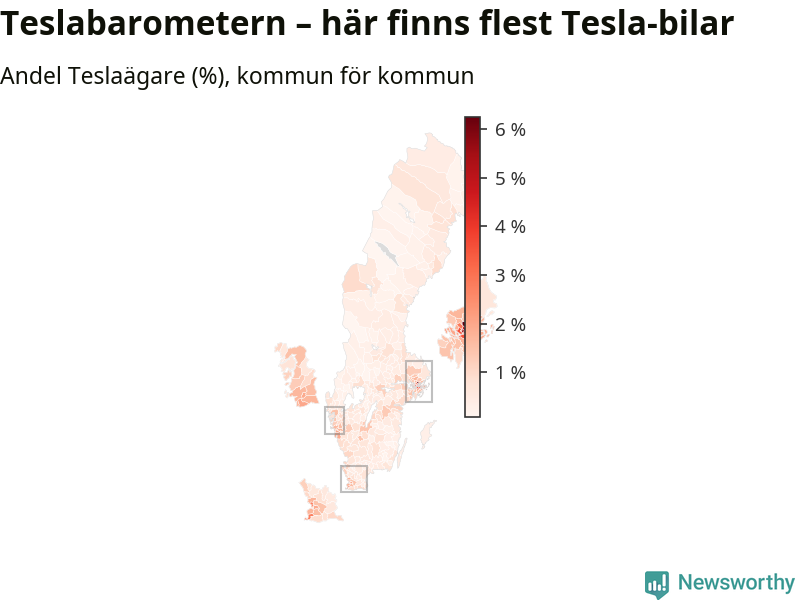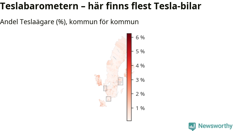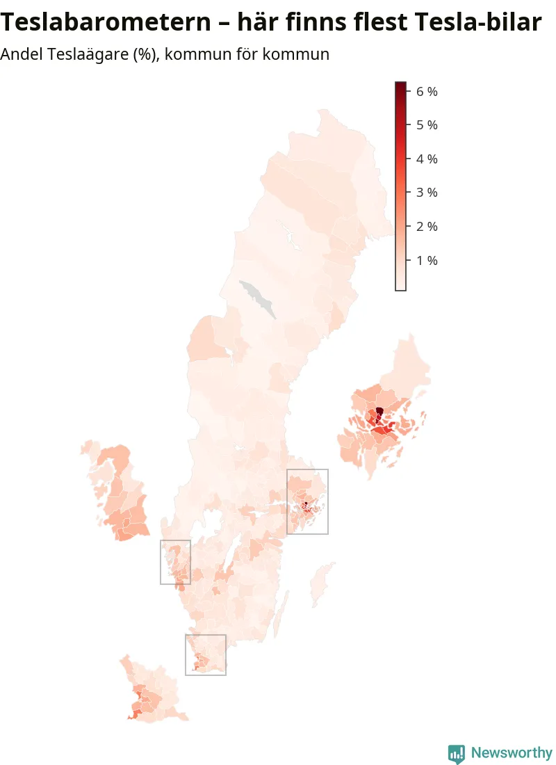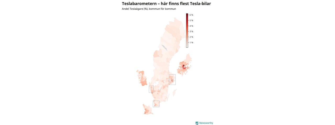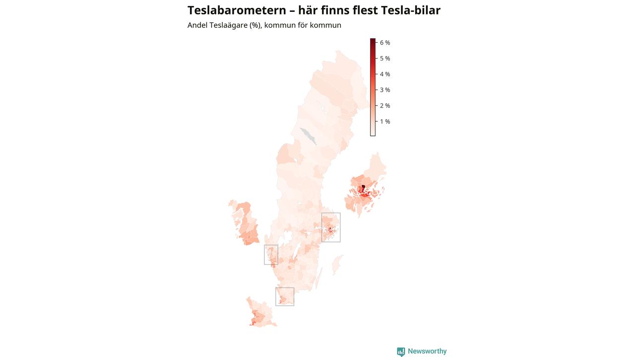 Tesla har, trots flera kontroverser det senaste året, ökat till omkring 77 200 registrerade bilar och därmed avancerat från 20:e till 19:e plats bland landets vanligaste bilar. Allra vanligast är Teslan i Täby kommun – där står den för sex procent av alla bilar. Antalet nybilsregistreringar av Teslor har dock sjunkit rejält (−66 procent) om man jämför januari-september i år med samma period förra året.