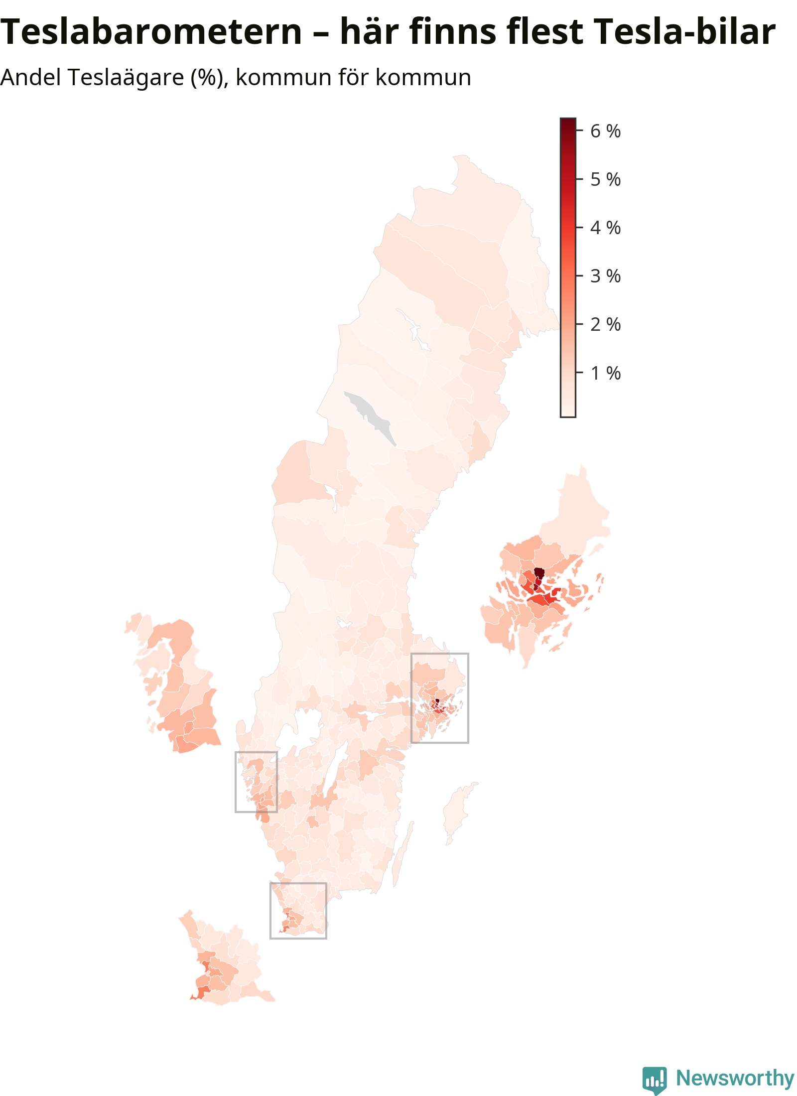 | Kommun | Antal bilar | Andel Volvobilar | Andel Tesla | Märke som klättrat mest |
