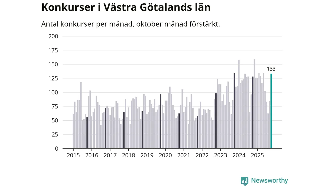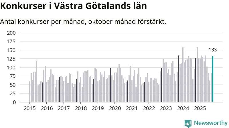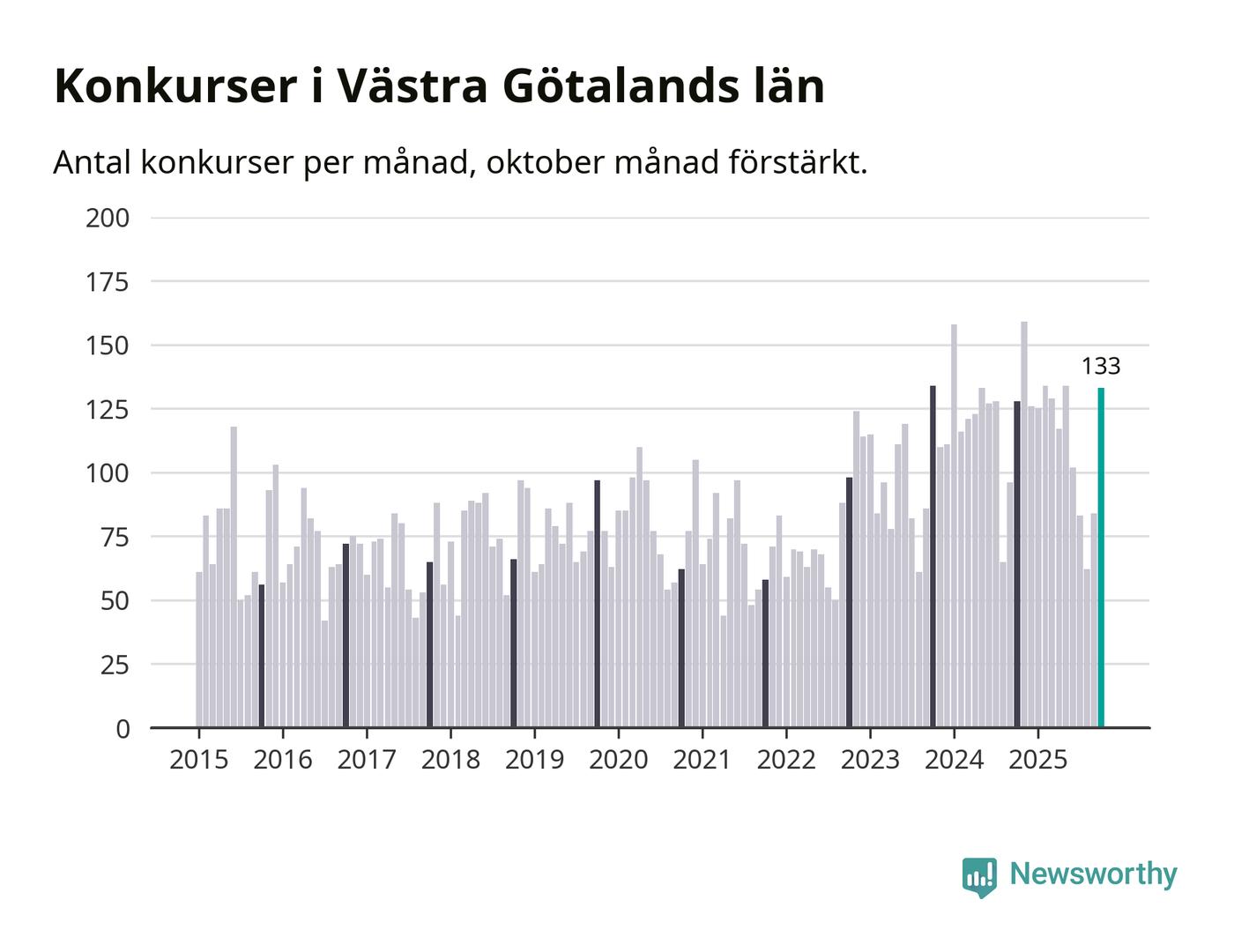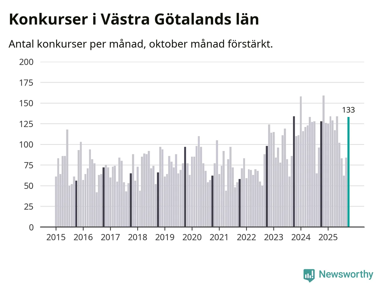 Under oktober månad gick 133 bolag i konkurs i Västra Götaland. Det är fler än normalt för den här tiden på året sett till de senaste tio åren. I fjol noterades 128 konkurser under oktober.