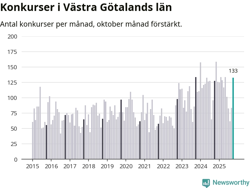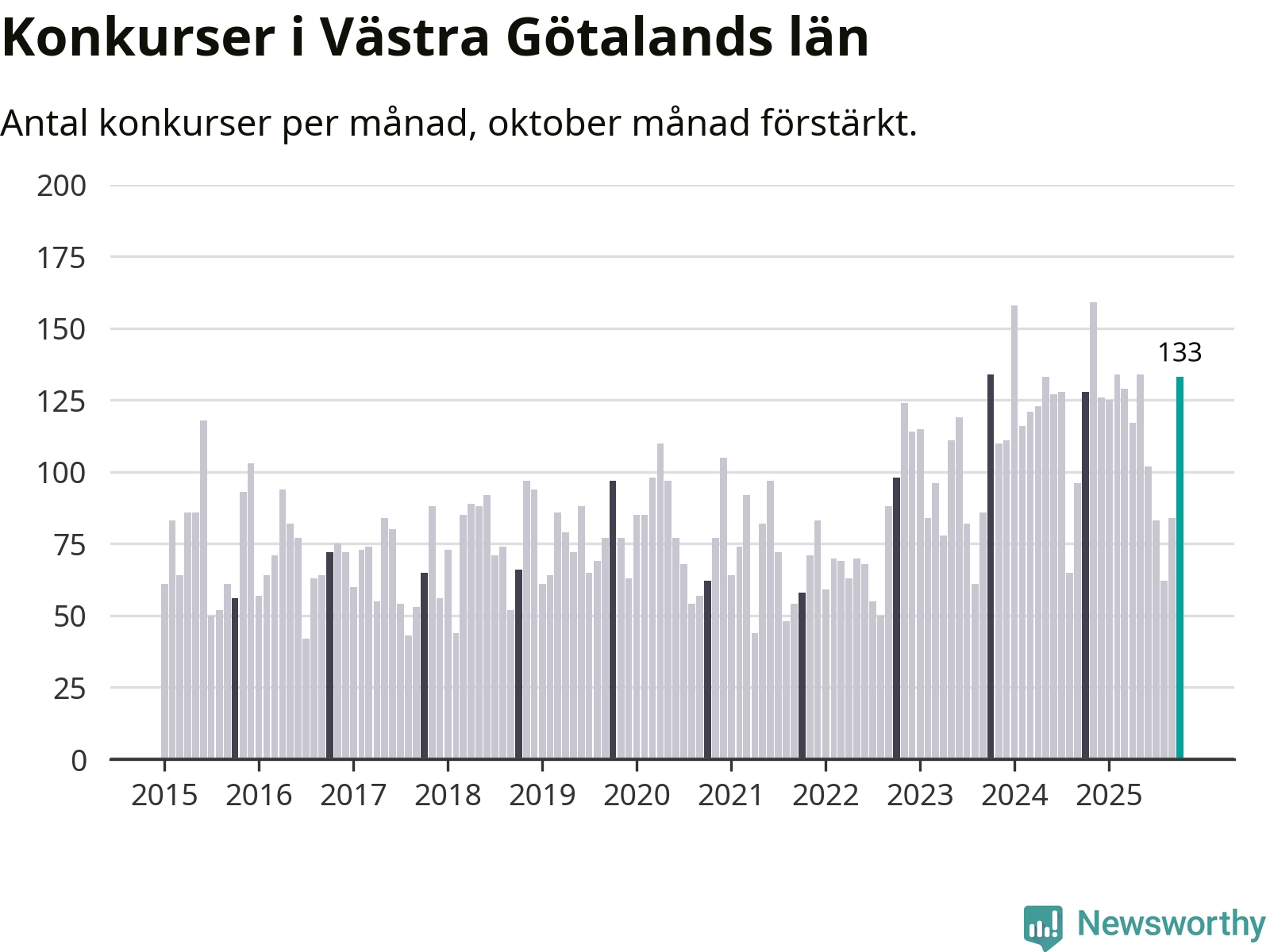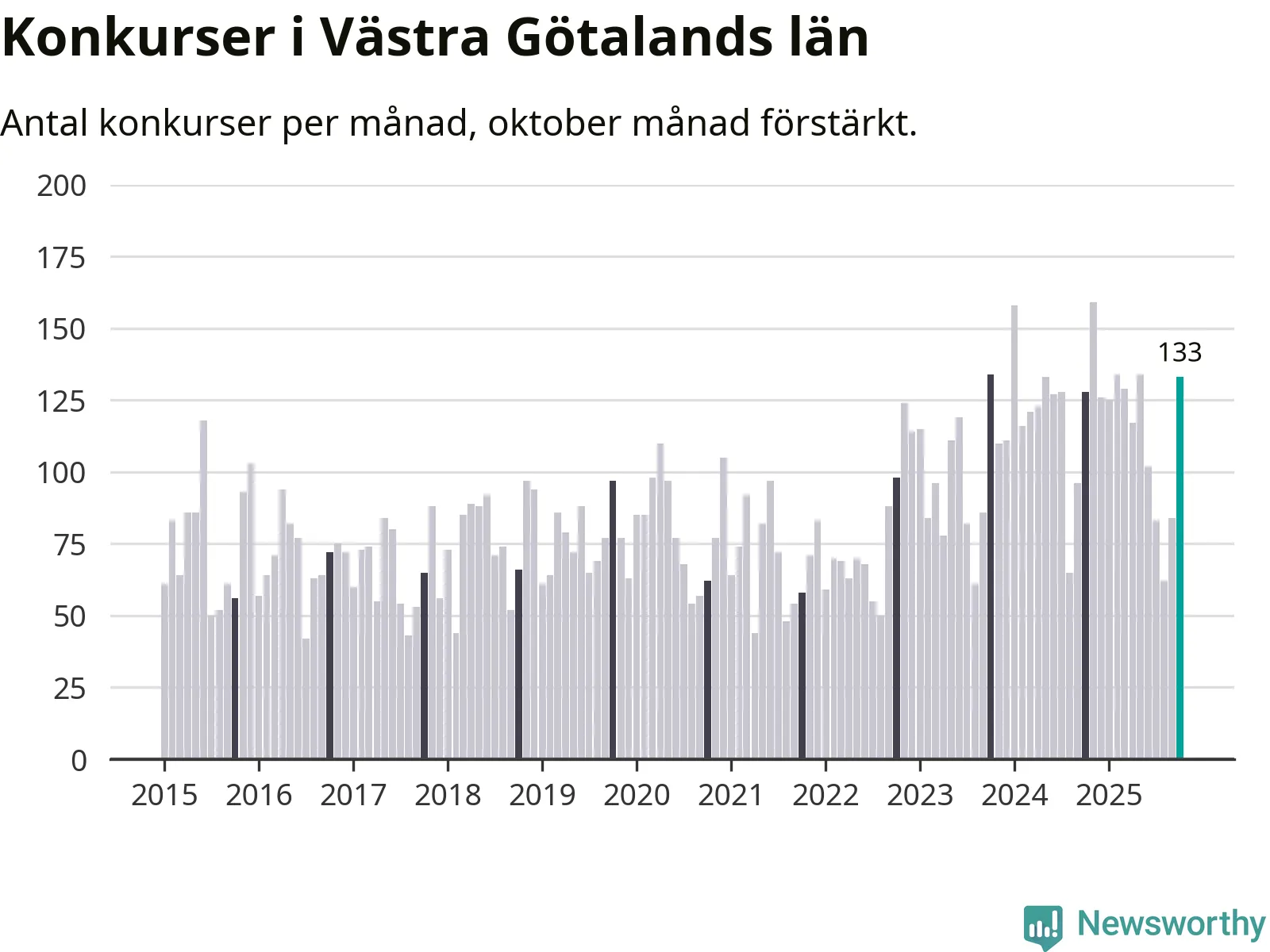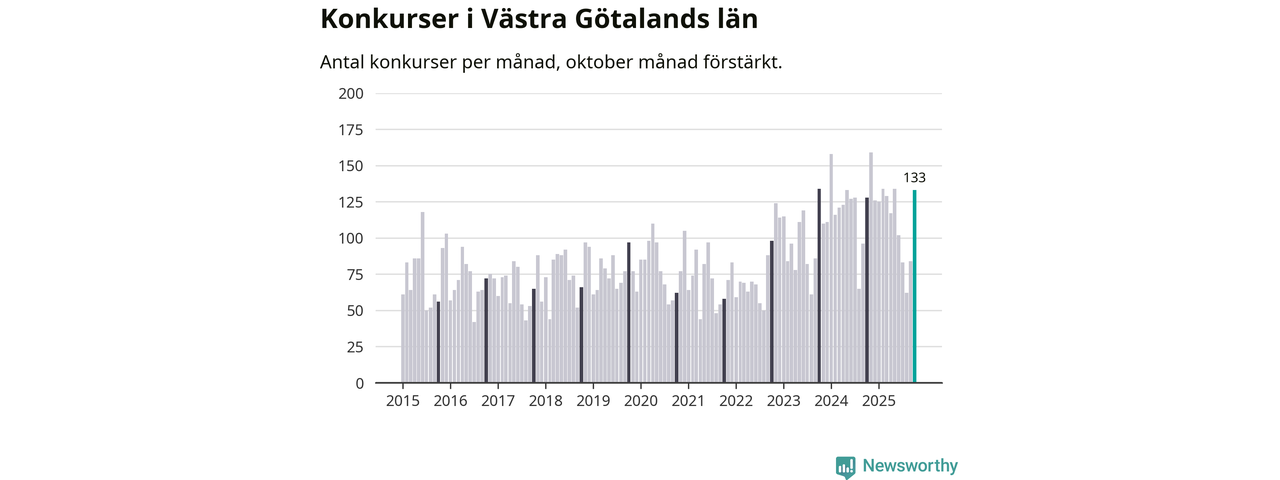 Under oktober månad gick 133 bolag i konkurs i Västra Götaland. Det är fler än normalt för den här tiden på året sett till de senaste tio åren. I fjol noterades 128 konkurser under oktober.