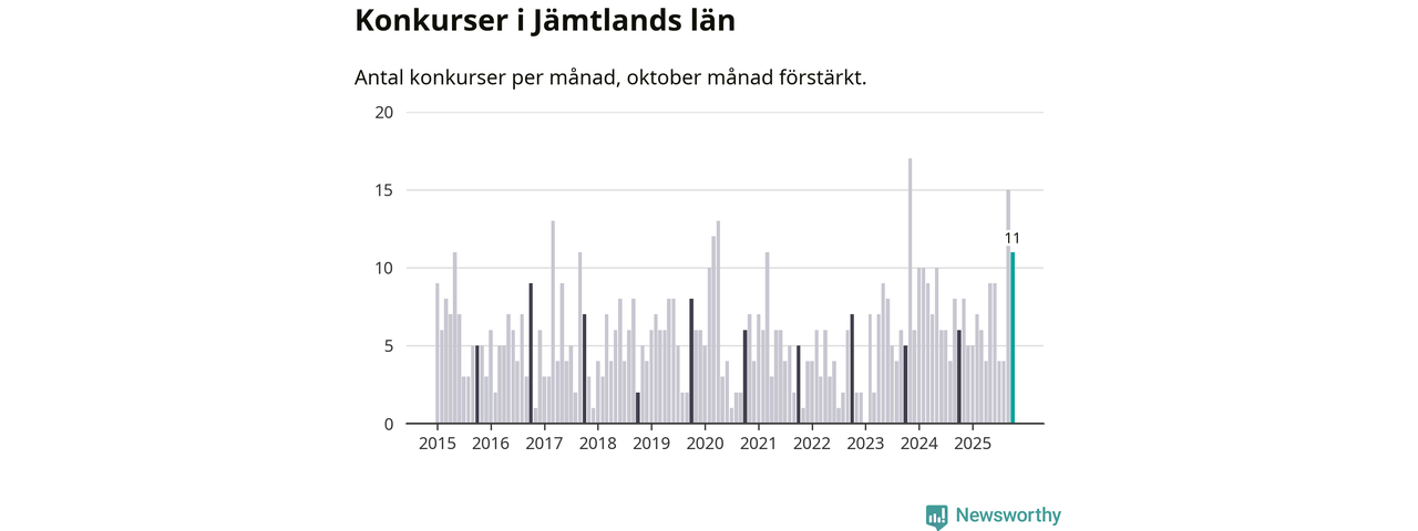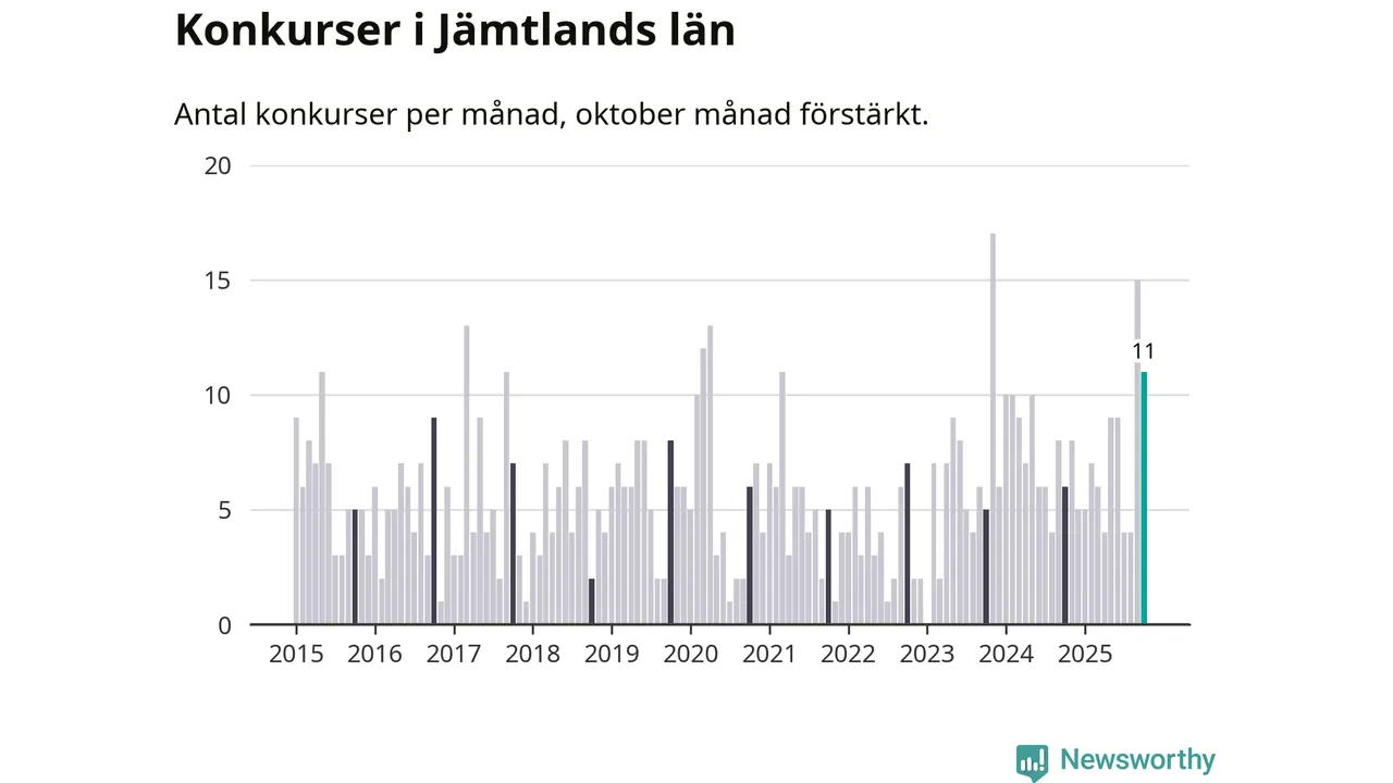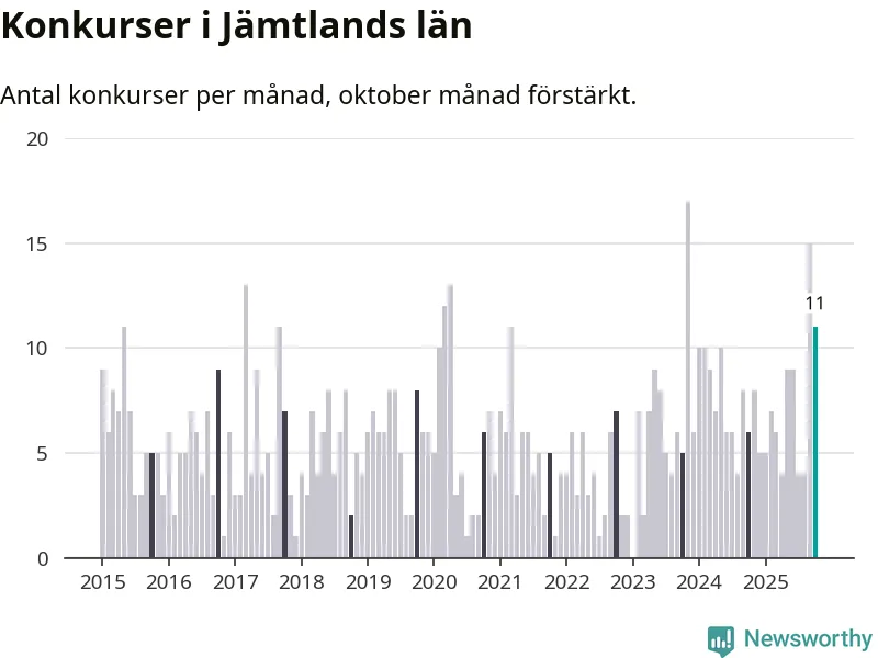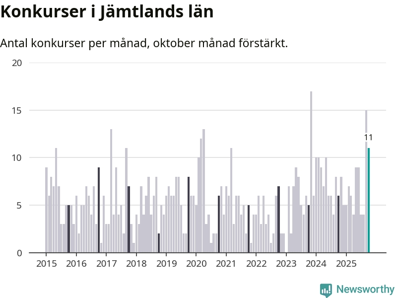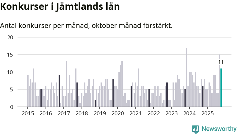 Under oktober månad gick elva bolag i konkurs i Jämtland. Det är en tämligen normal nivå för den här tiden på året. I fjol noterades sex konkurser under oktober.