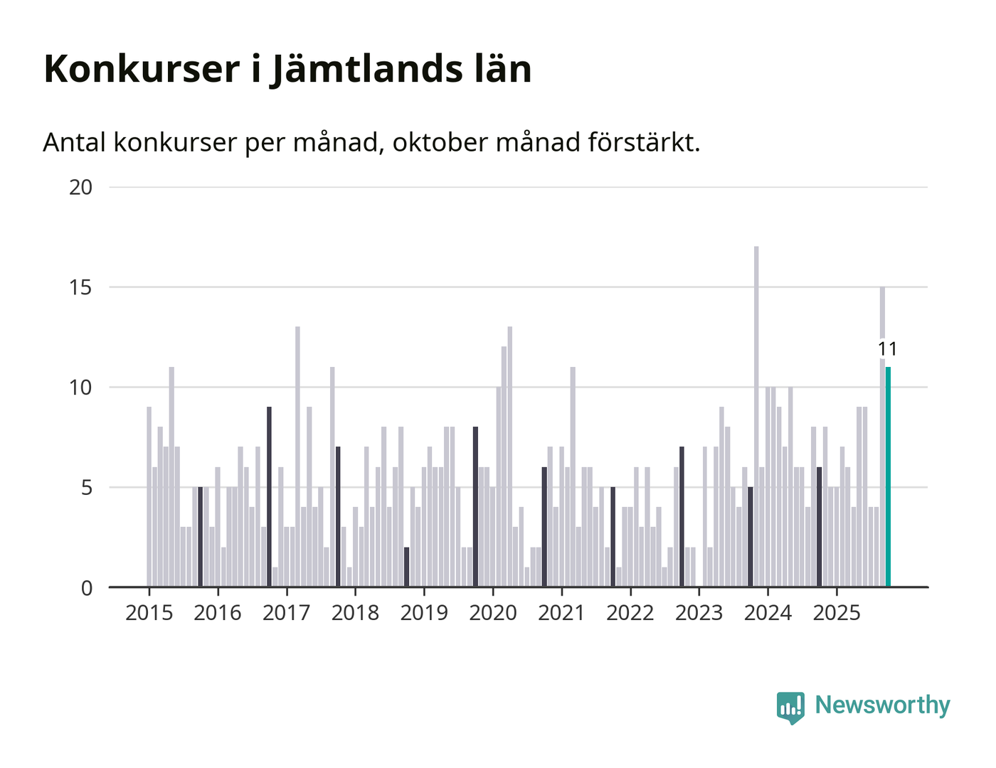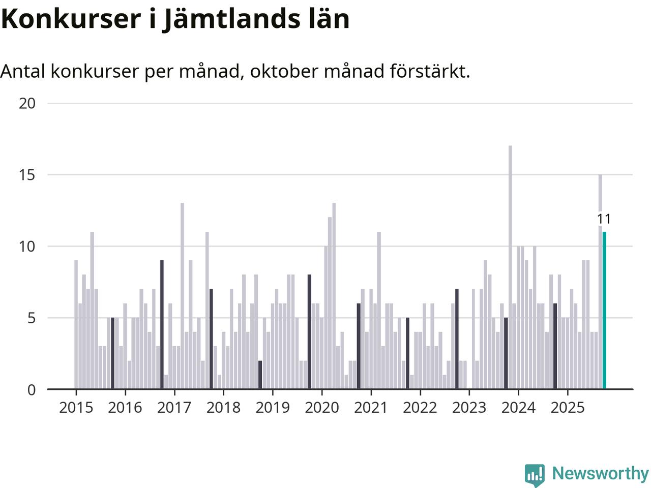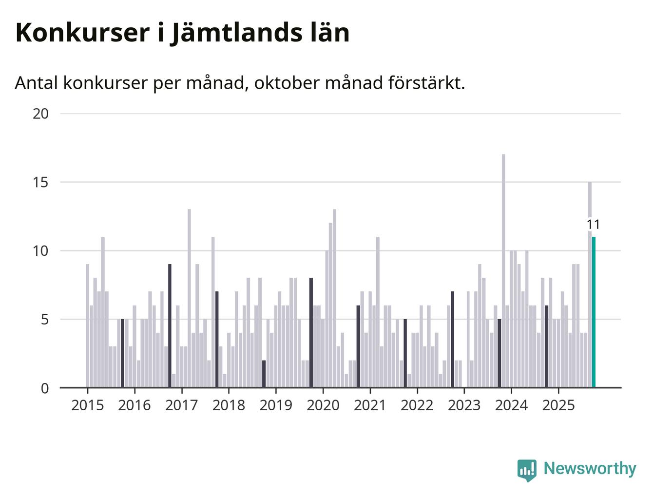 Under oktober månad gick elva bolag i konkurs i Jämtland. Det är en tämligen normal nivå för den här tiden på året. I fjol noterades sex konkurser under oktober.