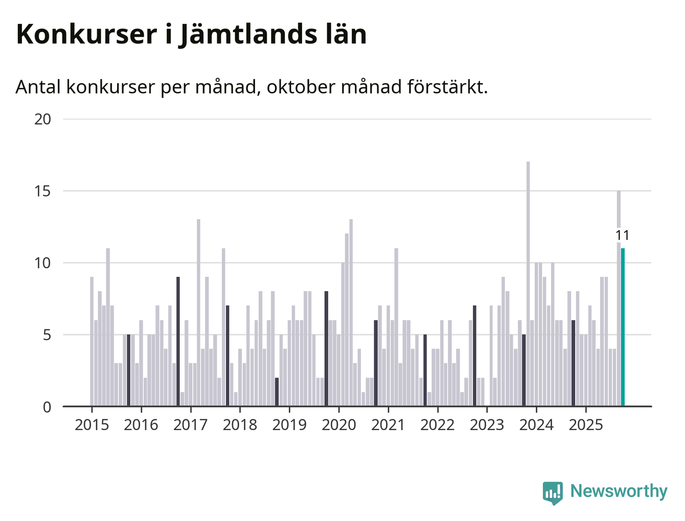UC publicerar på kommunnivå endast det ackulumerade, det vill säga sammanräknade, antalet konkurser i sin månadsstatistik. För att räkna ut antalet konkurser per månad subtraherar vi det ackulumerade antalet konkurser för januari till oktober med föregående månads motsvarande värde. Det gör att summan av alla bolag per kommun kan diffa något från länstotalen.