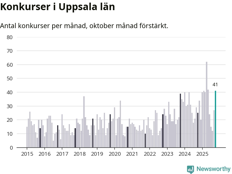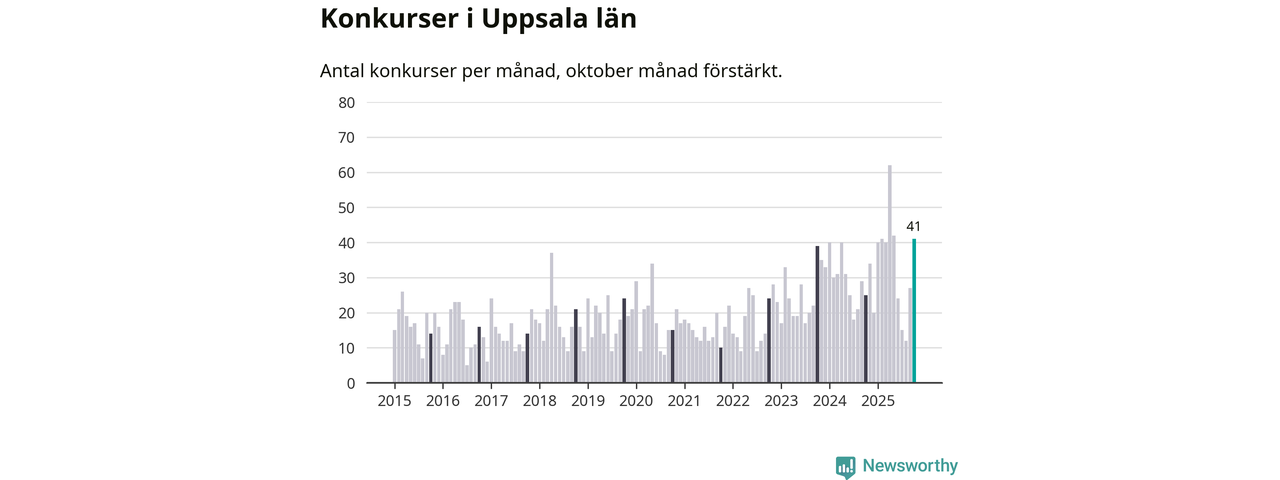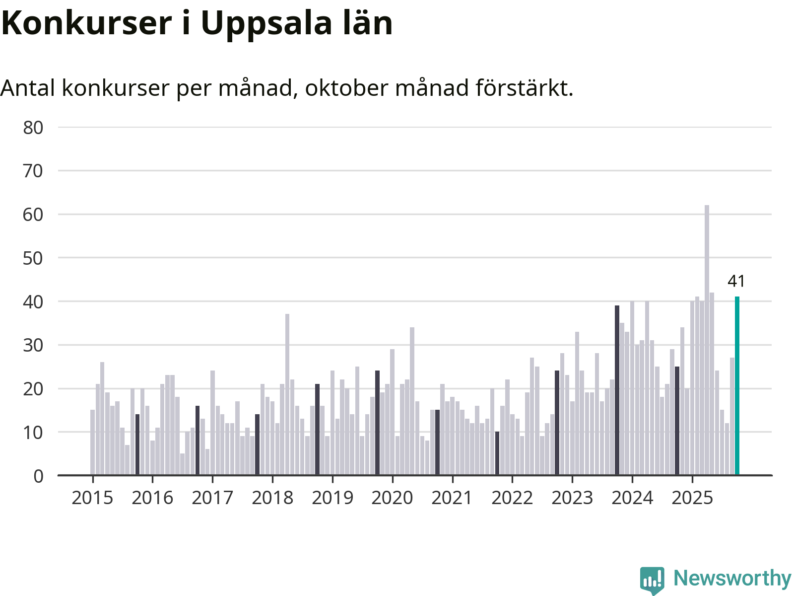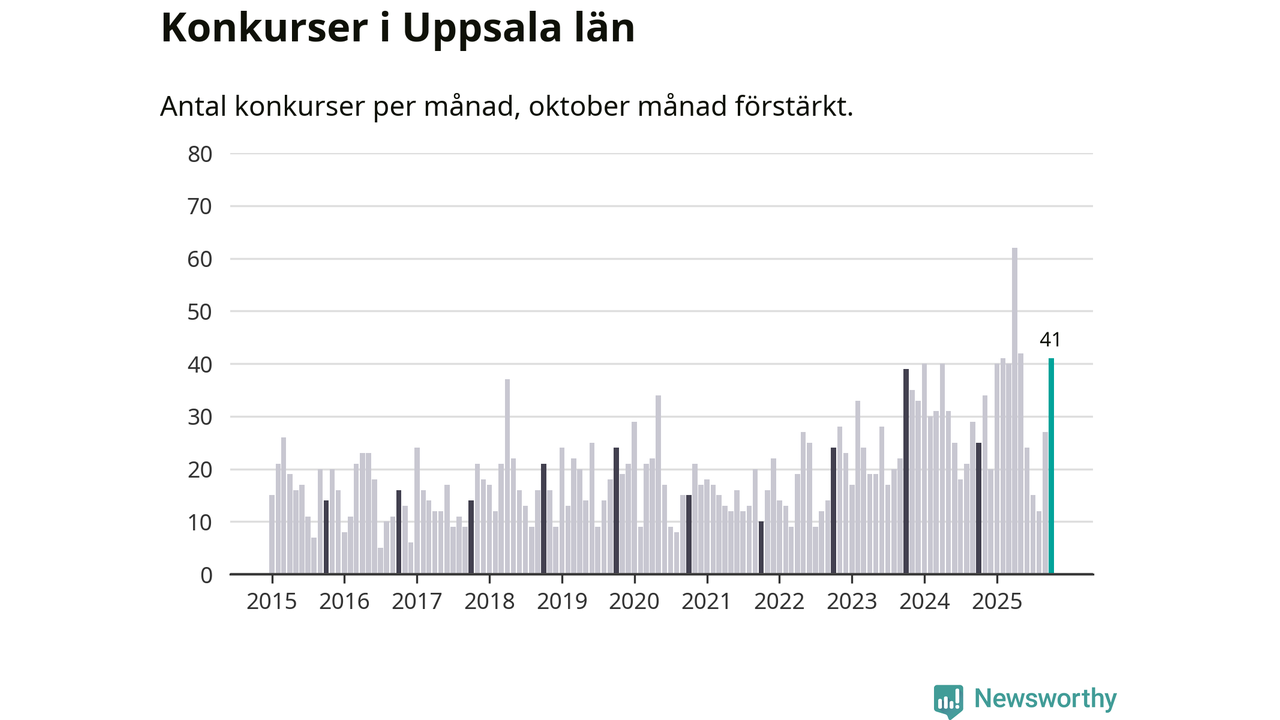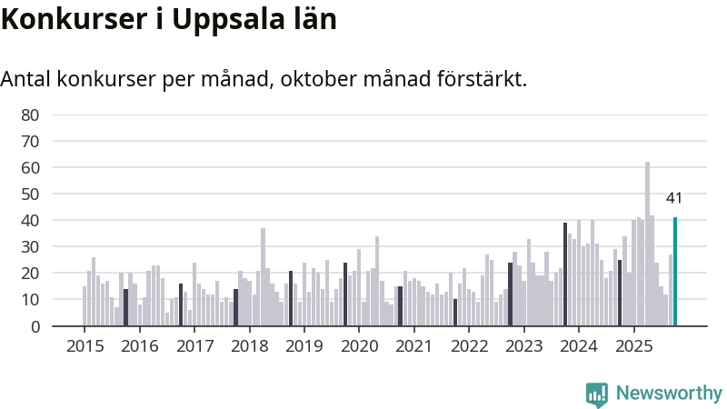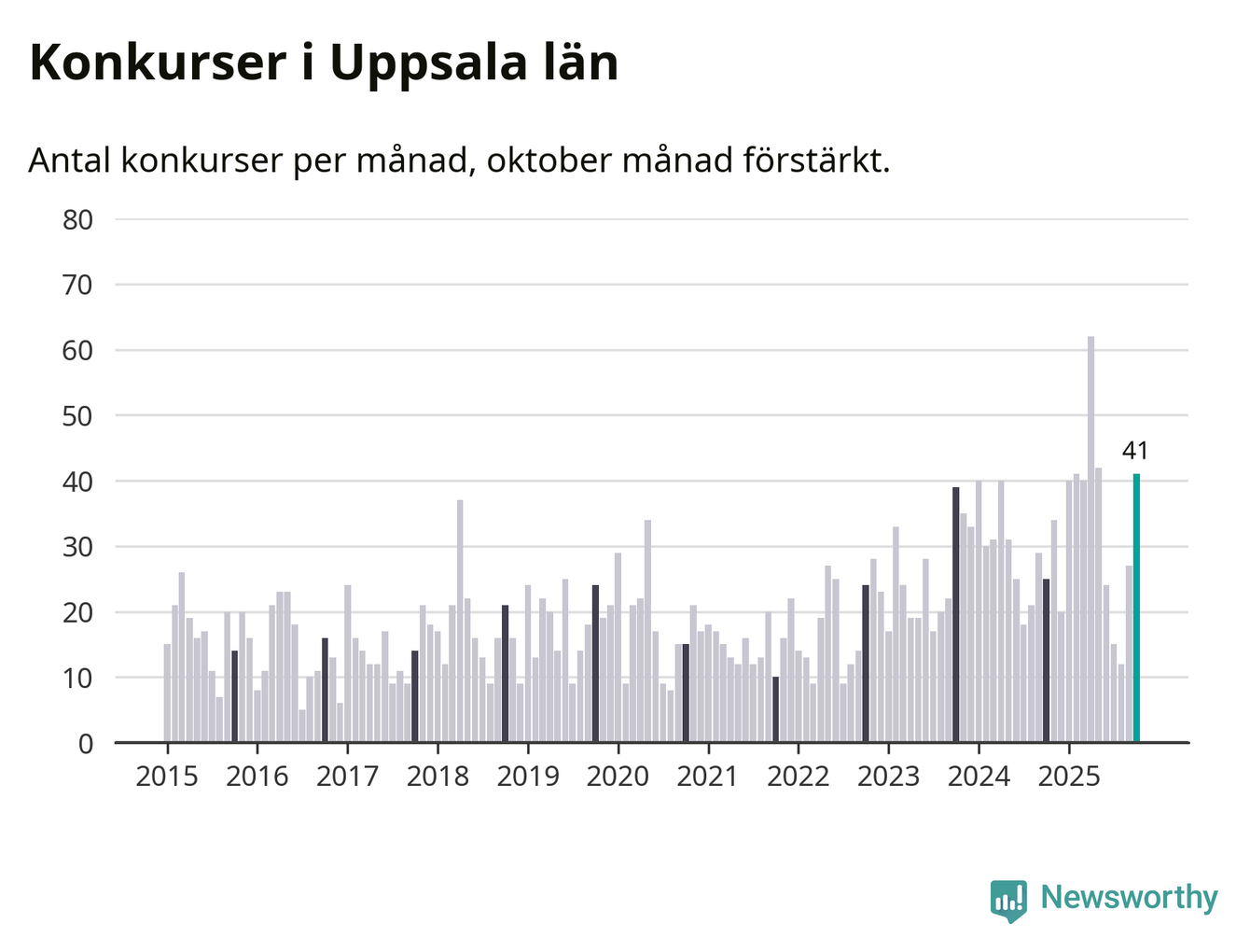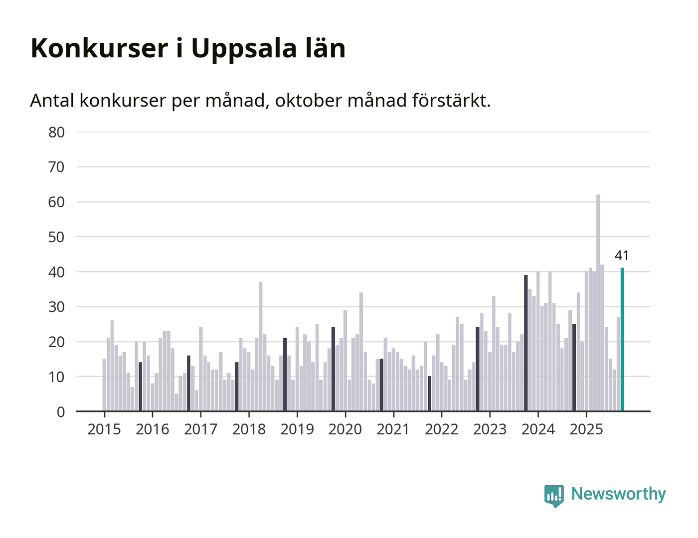 Under oktober månad gick 41 bolag i konkurs i Uppsala län. Det är fler än normalt för den här tiden på året sett till de senaste tio åren. I fjol noterades 25 konkurser under oktober.
