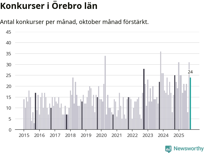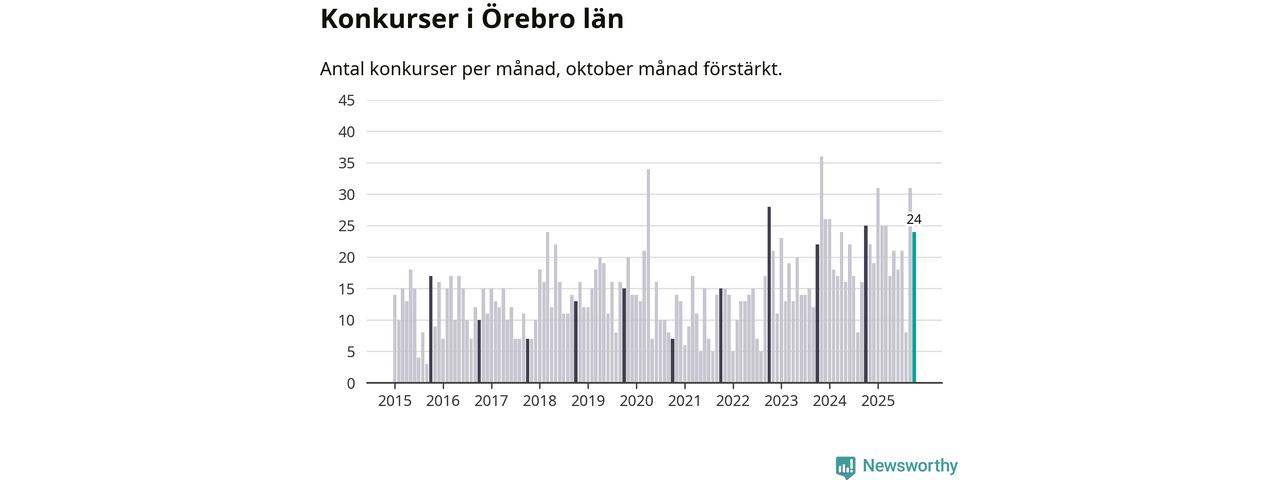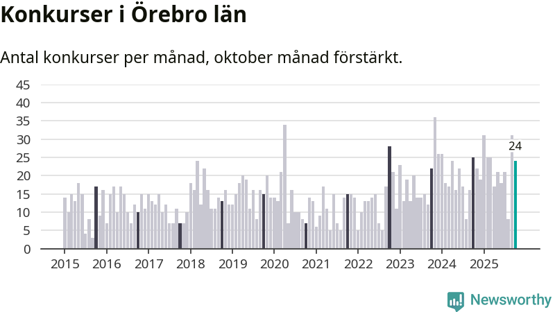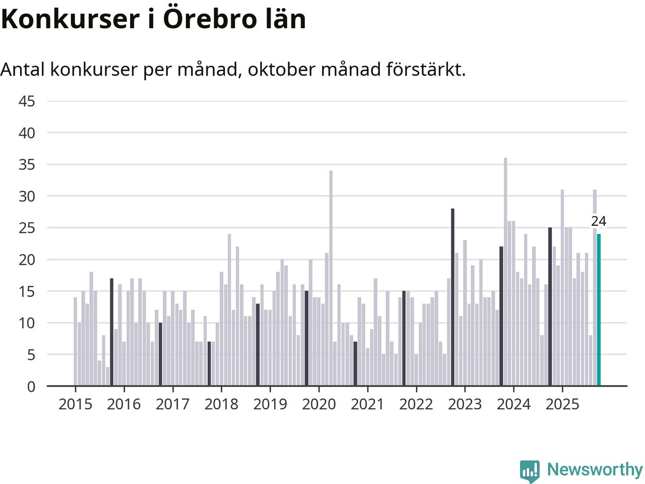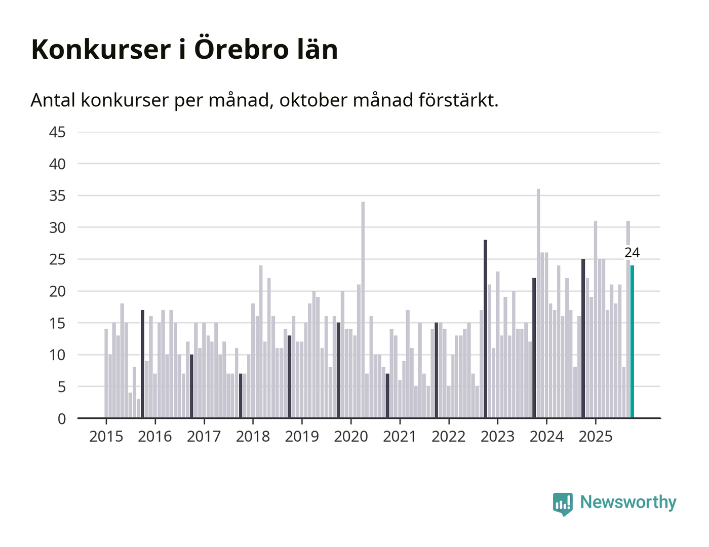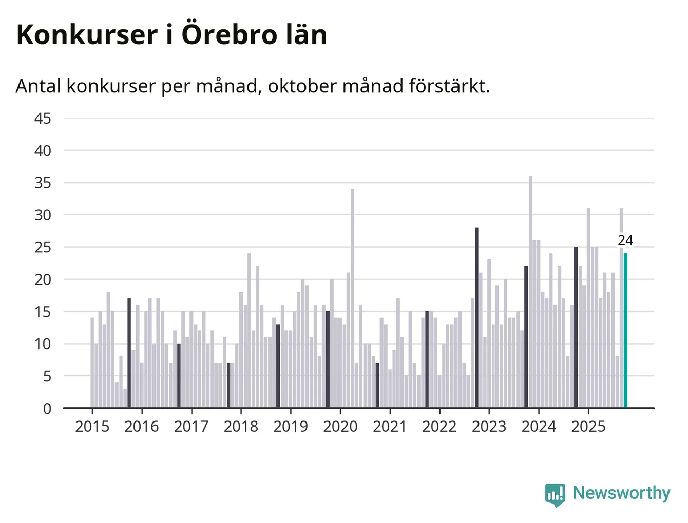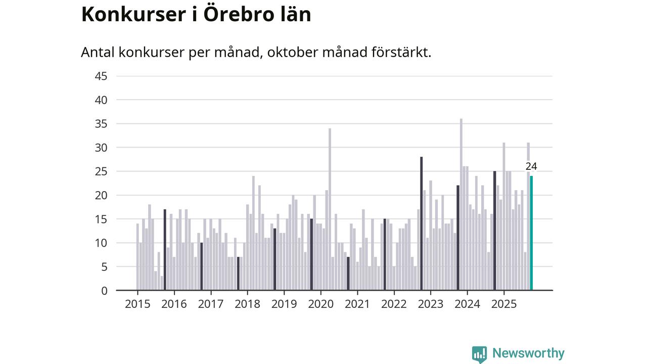 Under oktober månad gick 24 bolag i konkurs i Örebro län. Det är fler än normalt för den här tiden på året sett till de senaste tio åren, men samtidigt något färre än under oktober månad i fjol (25 stycken då).