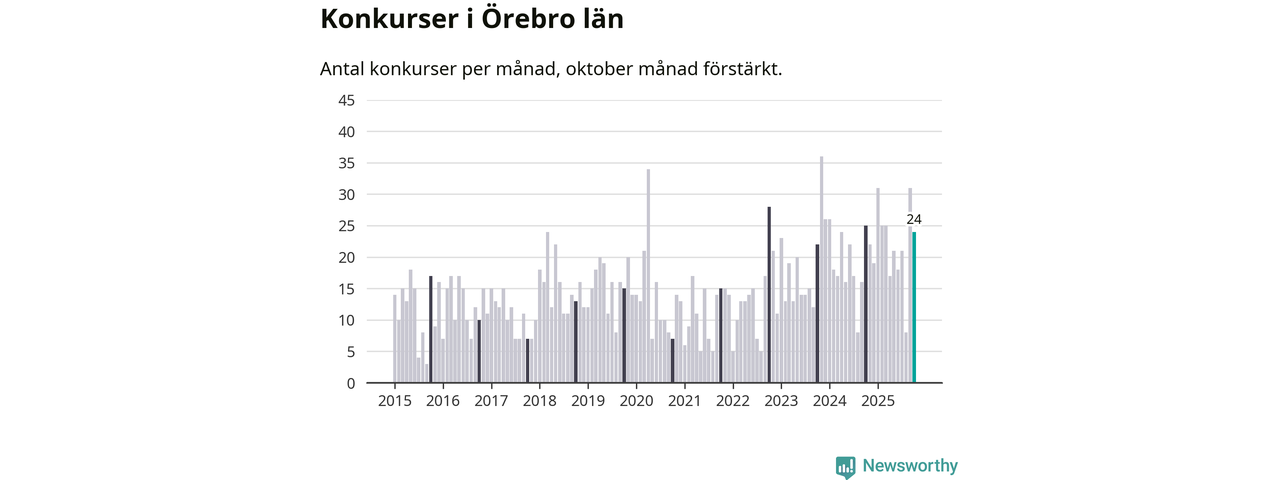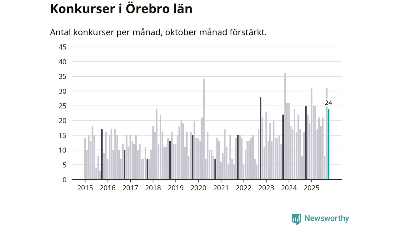 Sedan början av året har 235 företag gått i konkurs i Örebro län. Det kan jämföras med 189 företag under motsvarande tid år 2024 (+24 procent).