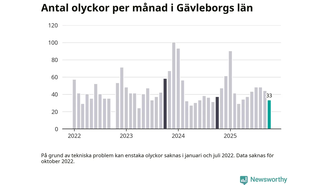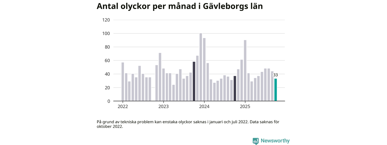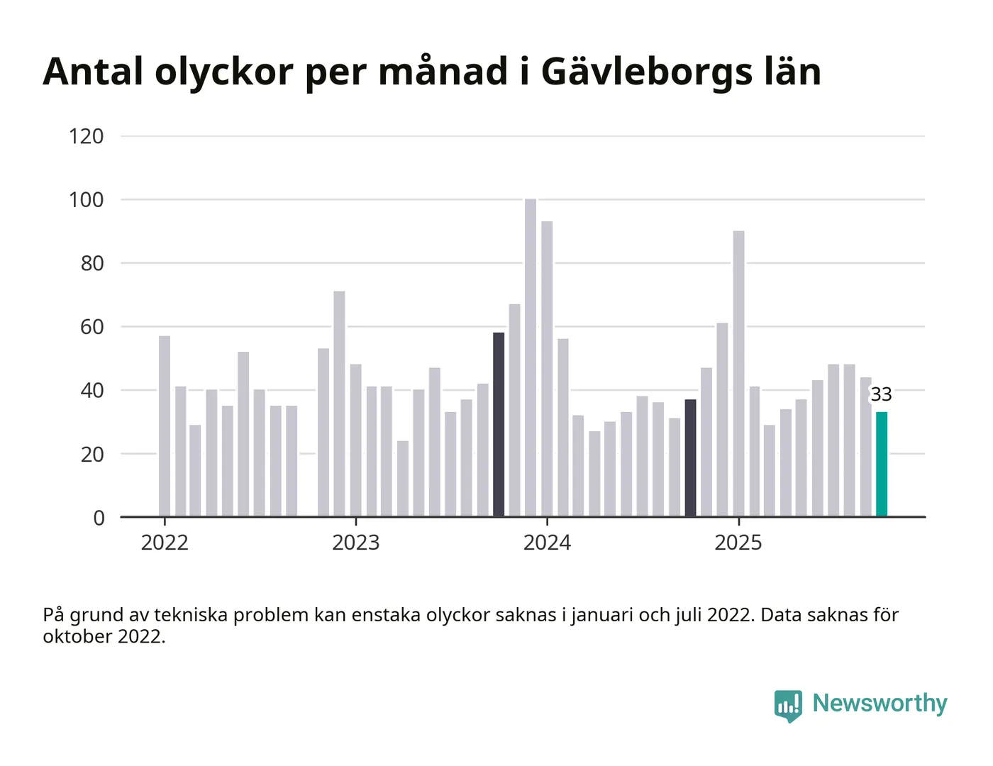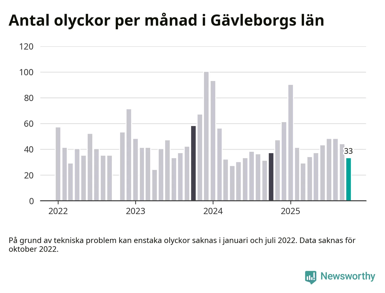 Under oktober 2025 rapporterades 33 trafikolyckor längs eller i anslutning till de stora, statliga vägarna i Gävleborg. Det är färre än samma månad i fjol, och färre än en genomsnittlig månad. Nerbrutet per kommun rapporterades flest olyckor, fyra stycken, längs E4 genom Nordanstigs kommun. Under de senaste åren har annars E4 genom Gävle kommun oftast haft de flesta olyckorna.