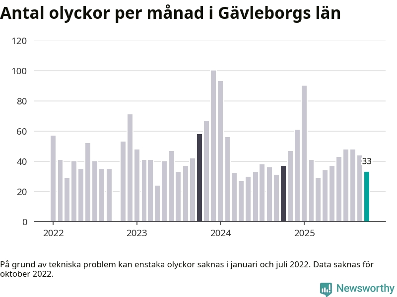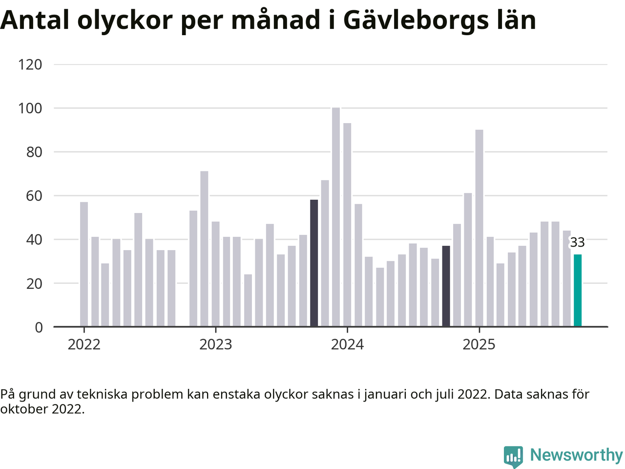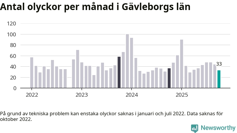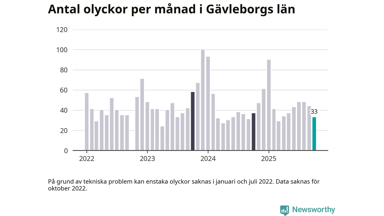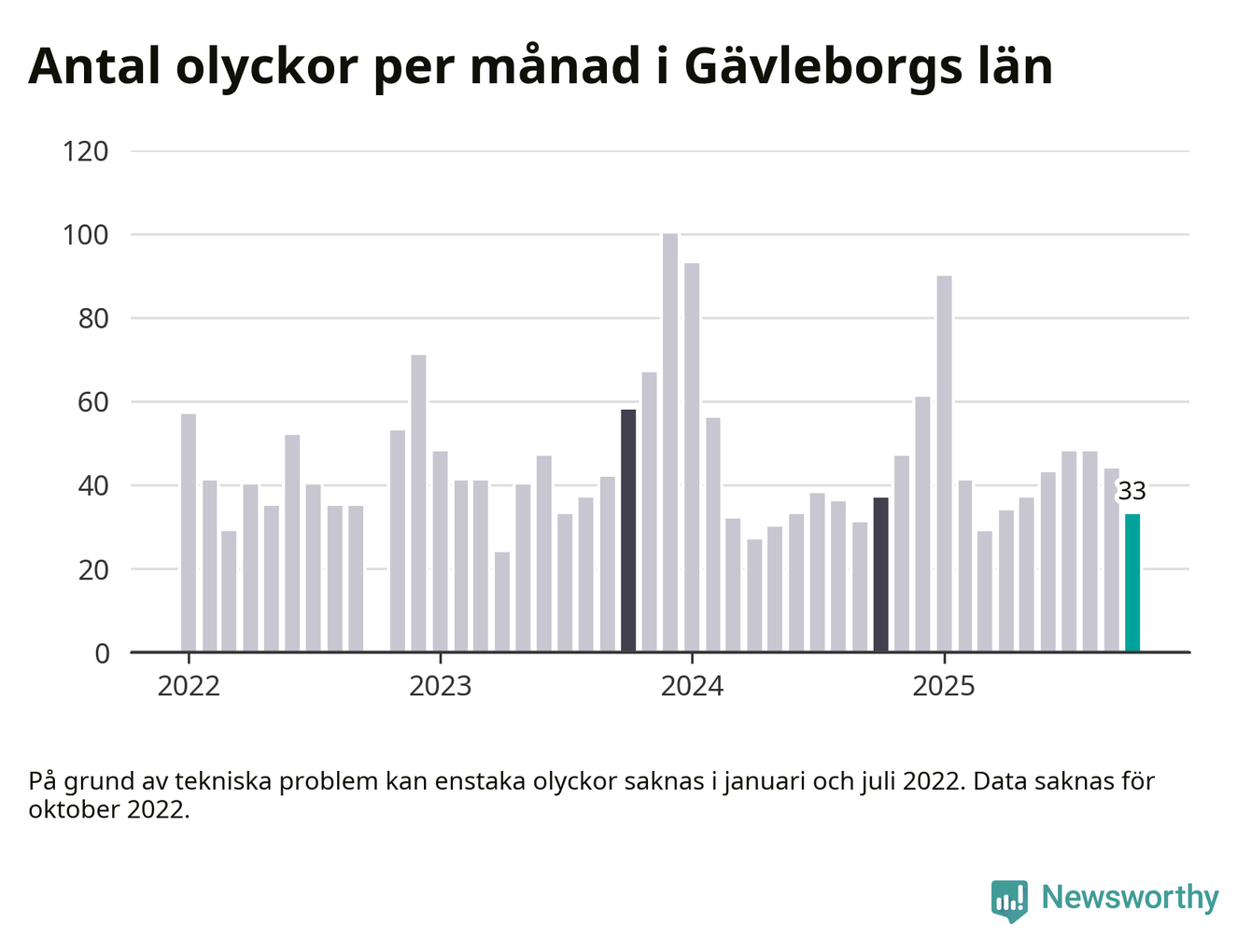 Under oktober 2025 rapporterades 33 trafikolyckor längs eller i anslutning till de stora, statliga vägarna i Gävleborg. Det är färre än samma månad i fjol, och färre än en genomsnittlig månad. Nerbrutet per kommun rapporterades flest olyckor, fyra stycken, längs E4 genom Nordanstigs kommun. Under de senaste åren har annars E4 genom Gävle kommun oftast haft de flesta olyckorna.