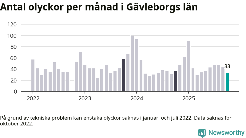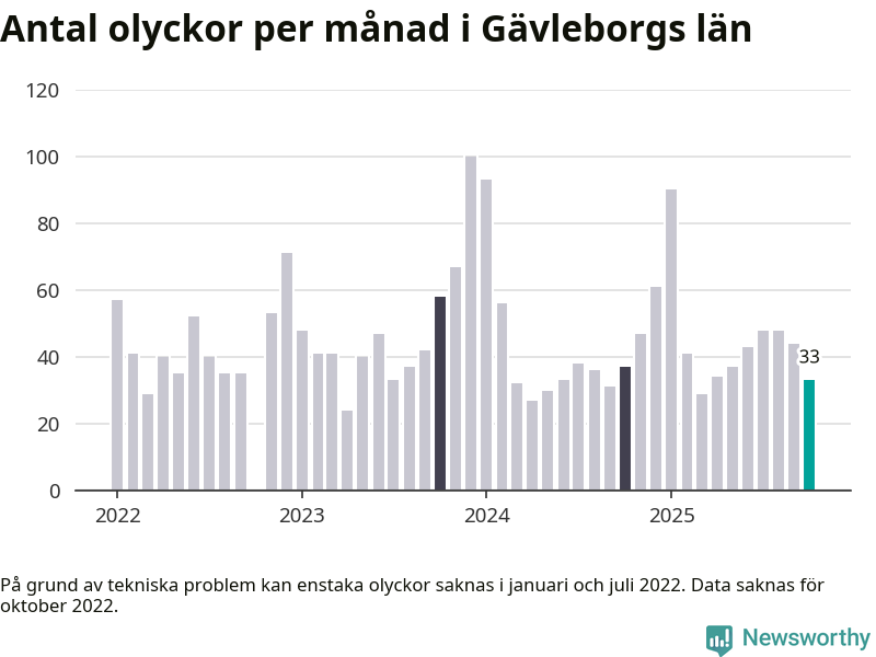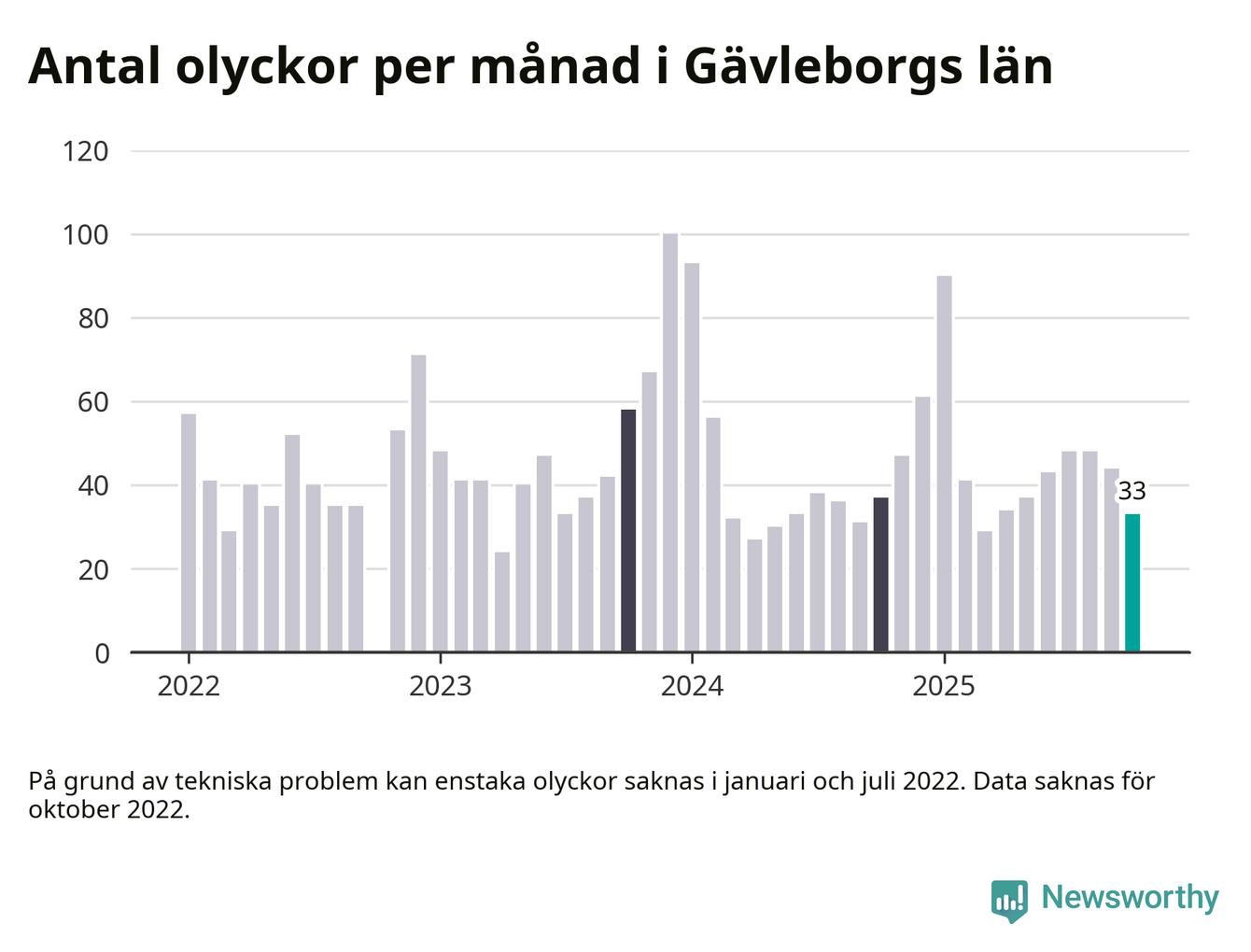 De senaste årens mest olycksdrabbade månad var december för två år sedan, med 100 olyckor. I genomsnitt rapporteras omkring 48 olyckor per månad i länet, sedan början av 2022.