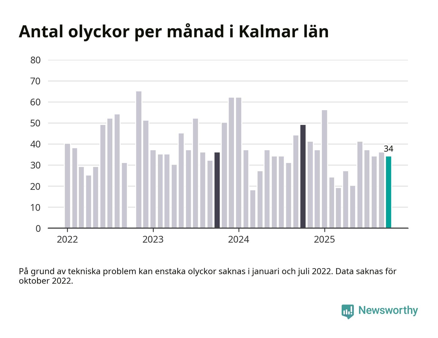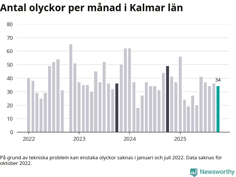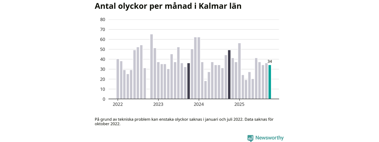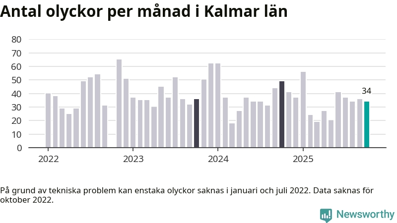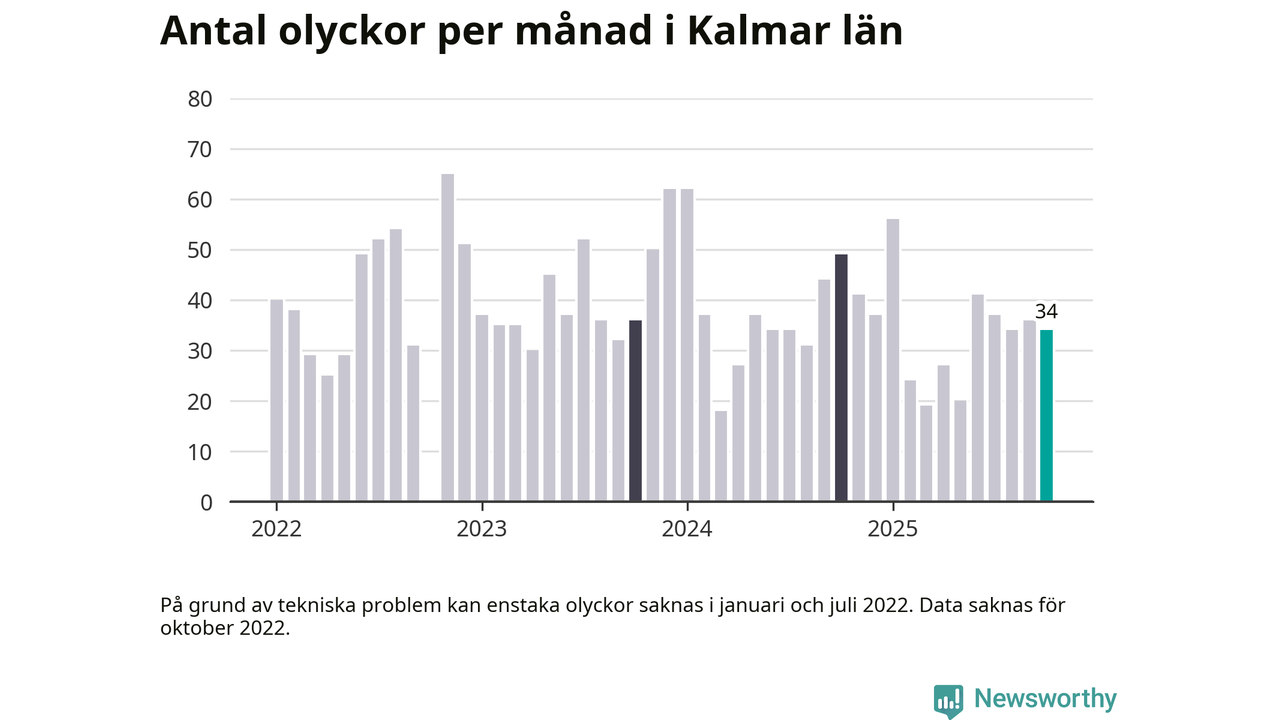 De senaste årens mest olycksdrabbade månad var november för tre år sedan, med 65 olyckor. I genomsnitt rapporteras omkring 37 olyckor per månad i länet, sedan början av 2022.