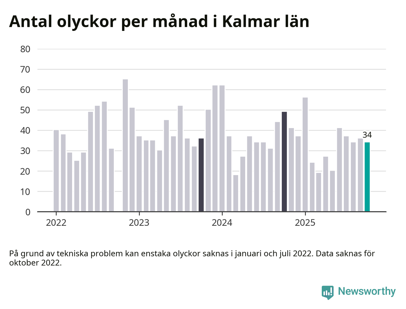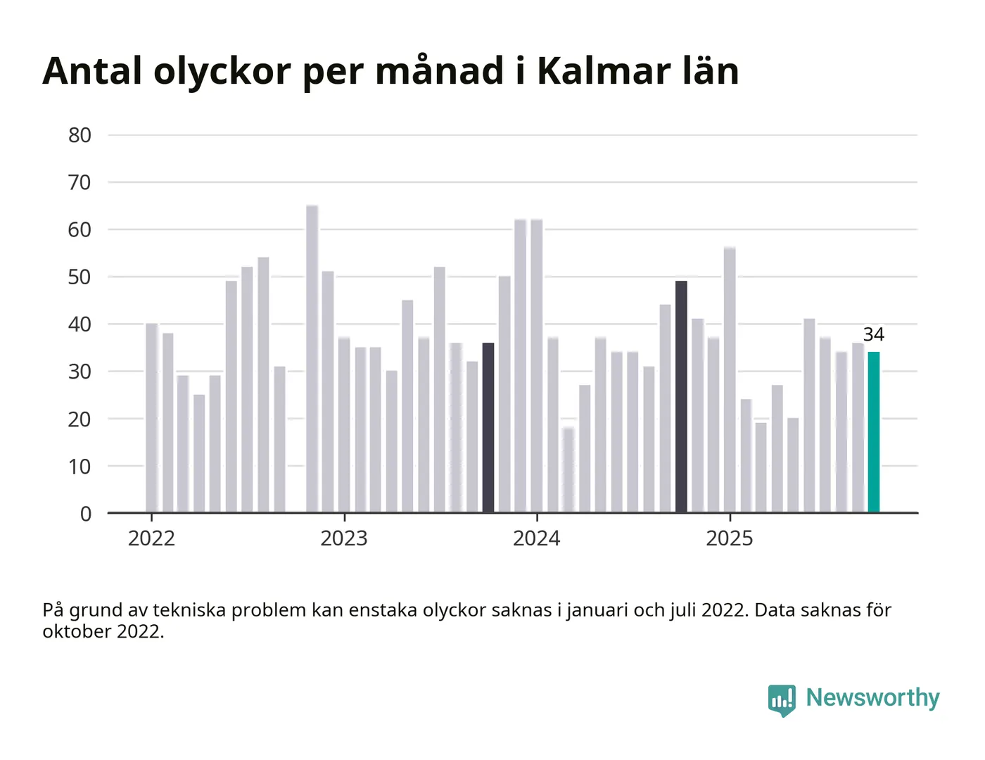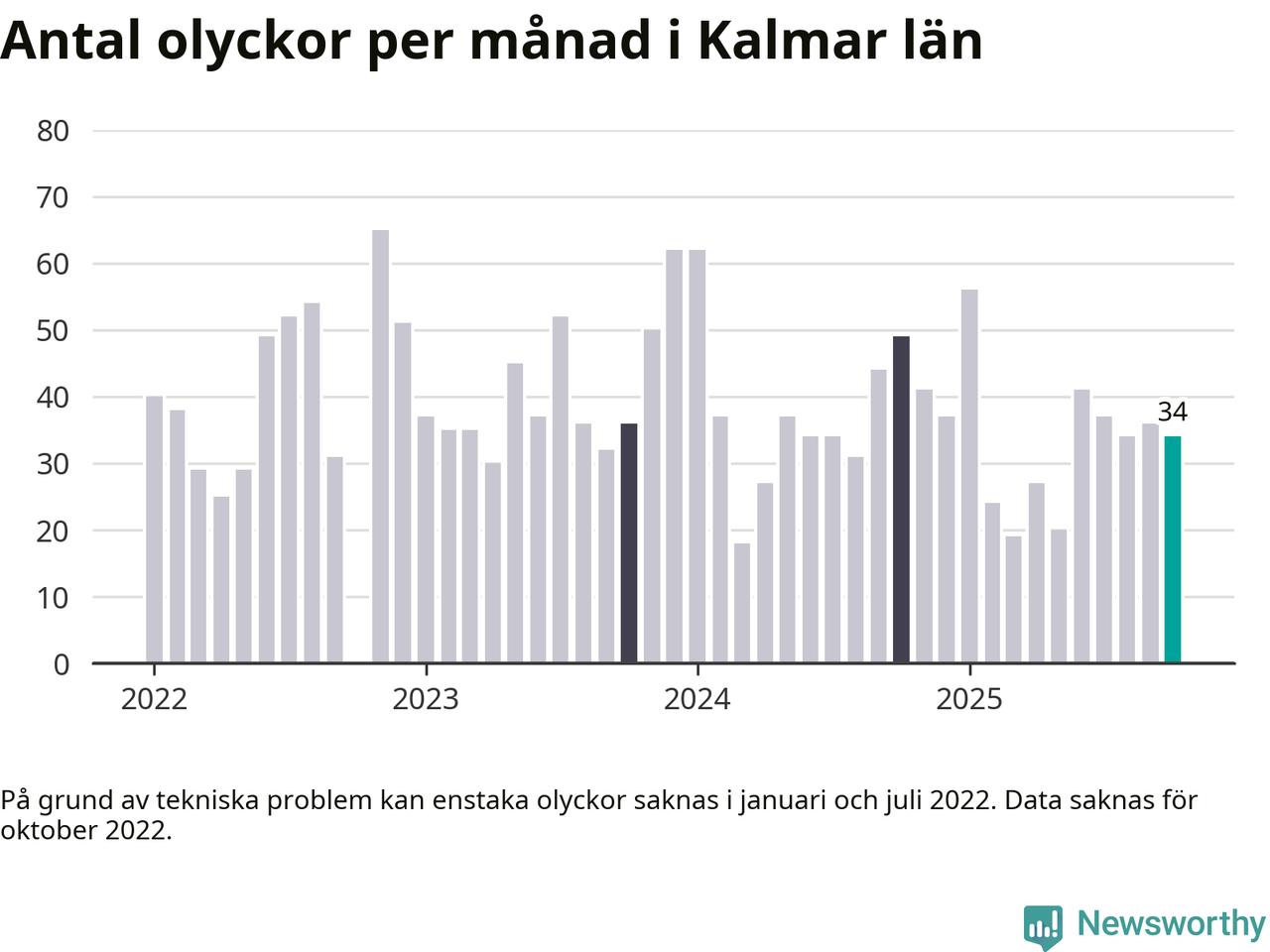 De senaste årens mest olycksdrabbade månad var november för tre år sedan, med 65 olyckor. I genomsnitt rapporteras omkring 37 olyckor per månad i länet, sedan början av 2022.