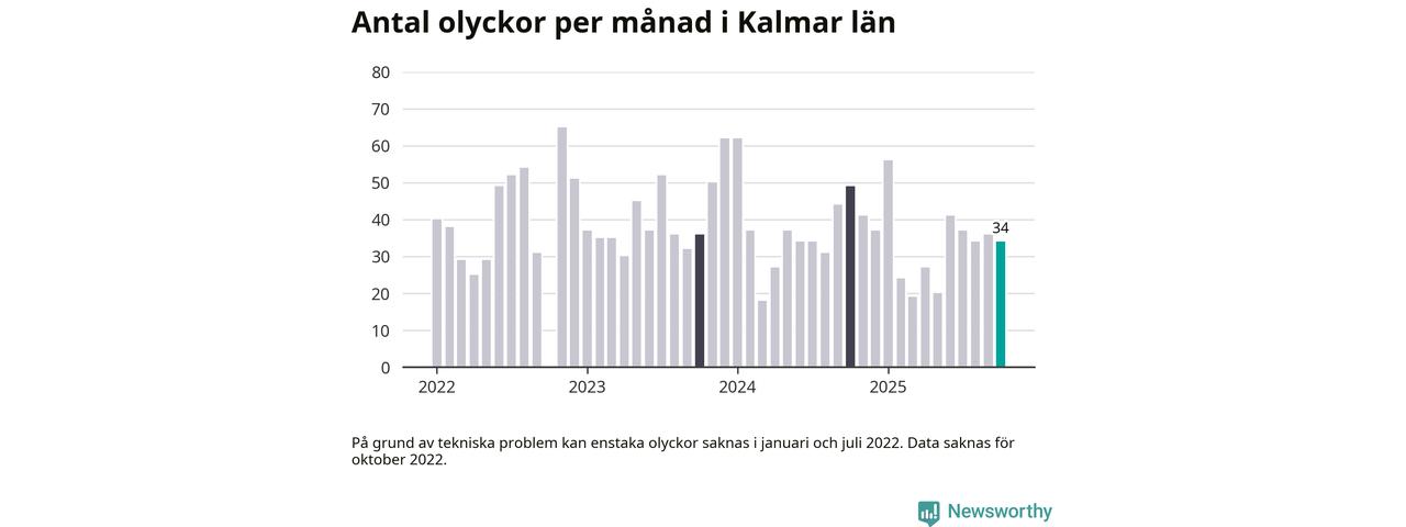 Under oktober 2025 rapporterades 34 trafikolyckor längs eller i anslutning till de stora, statliga vägarna i Kalmar län. Det är färre än samma månad i fjol. Nerbrutet per kommun rapporterades flest olyckor, fyra stycken, längs E22 genom Oskarshamns kommun. Under de senaste åren har annars E22 genom Kalmar kommun oftast haft de flesta olyckorna.