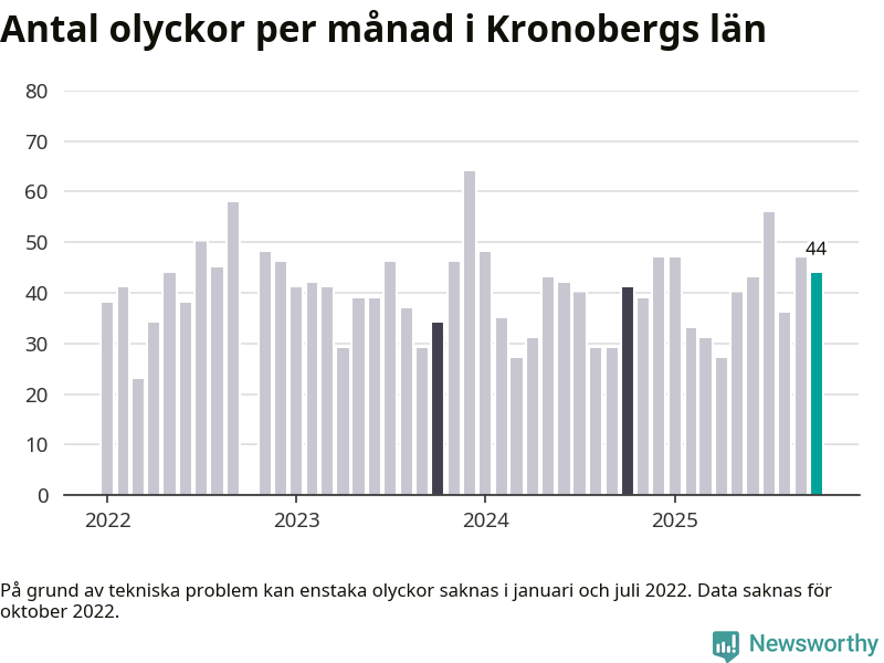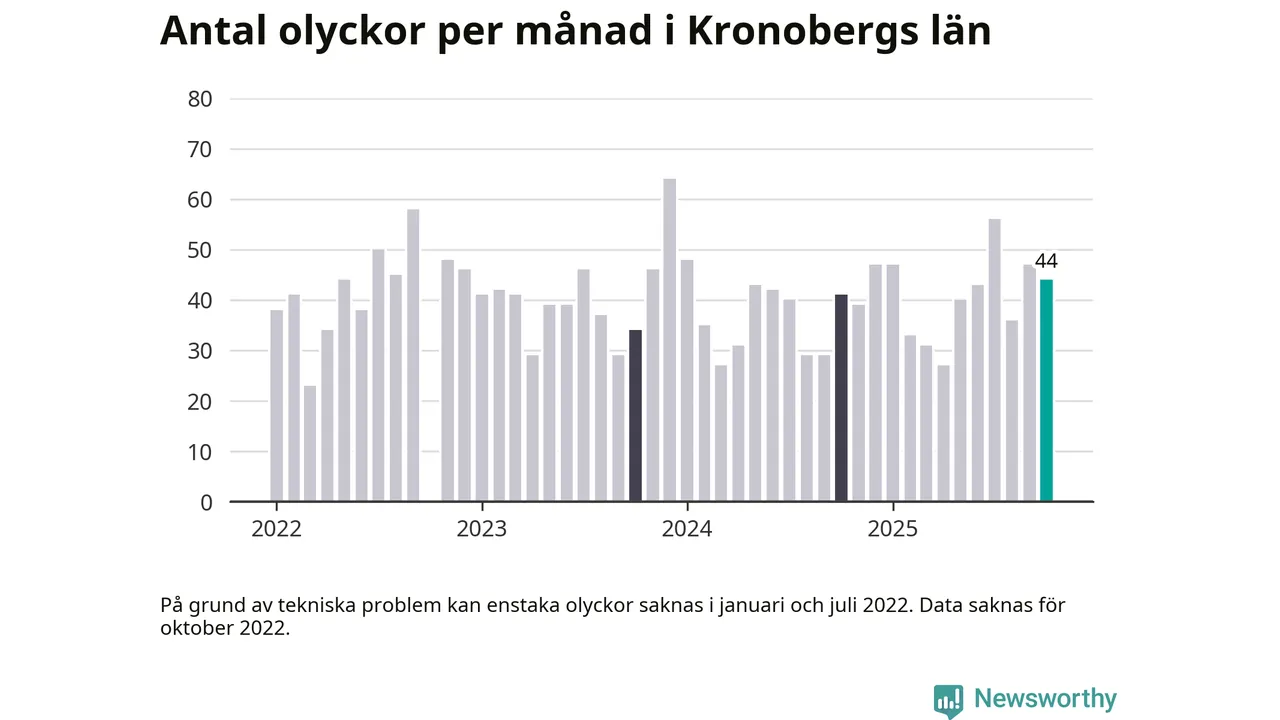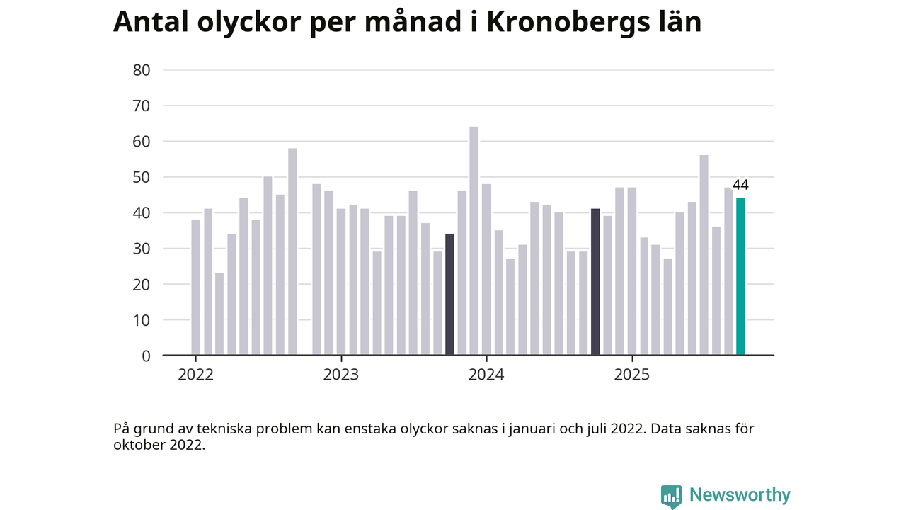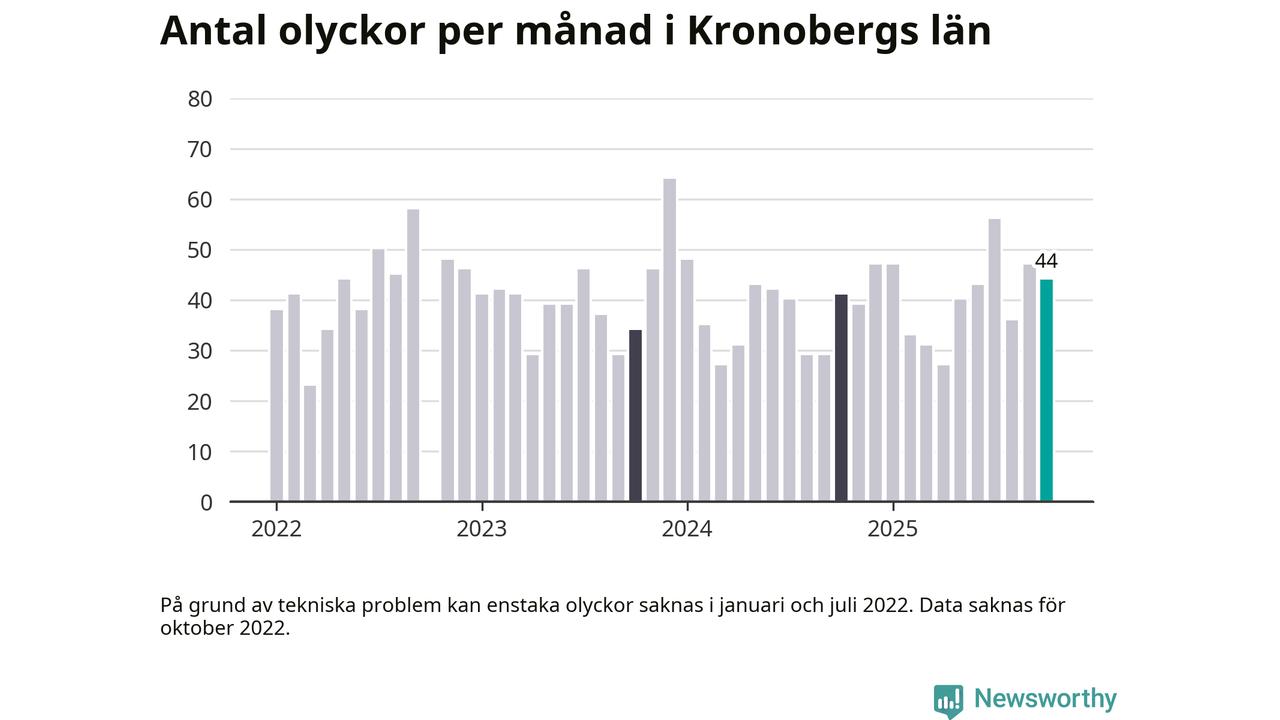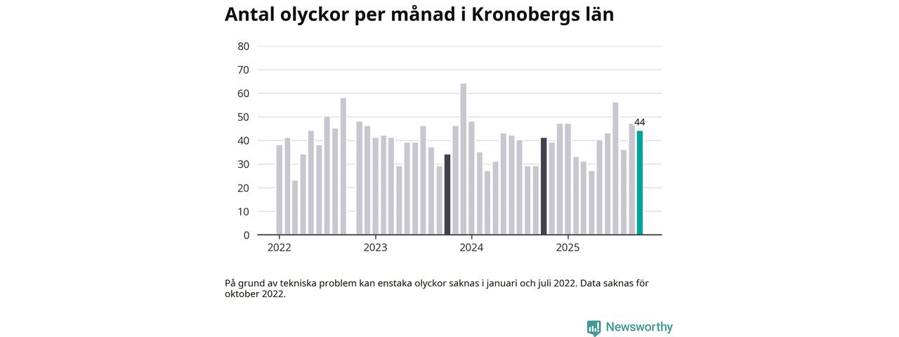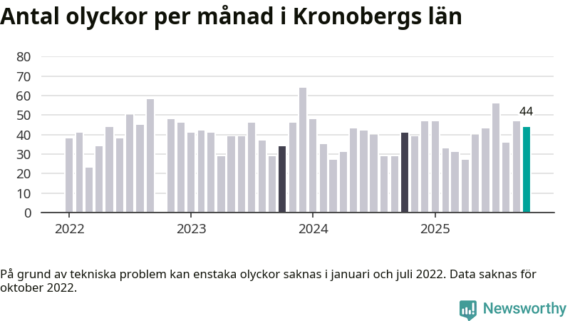I Kronobergs län rapporterades 44 längs de stora vägarna i länet under oktober, visar data från Trafikverket som Newsworthy sammanställt.