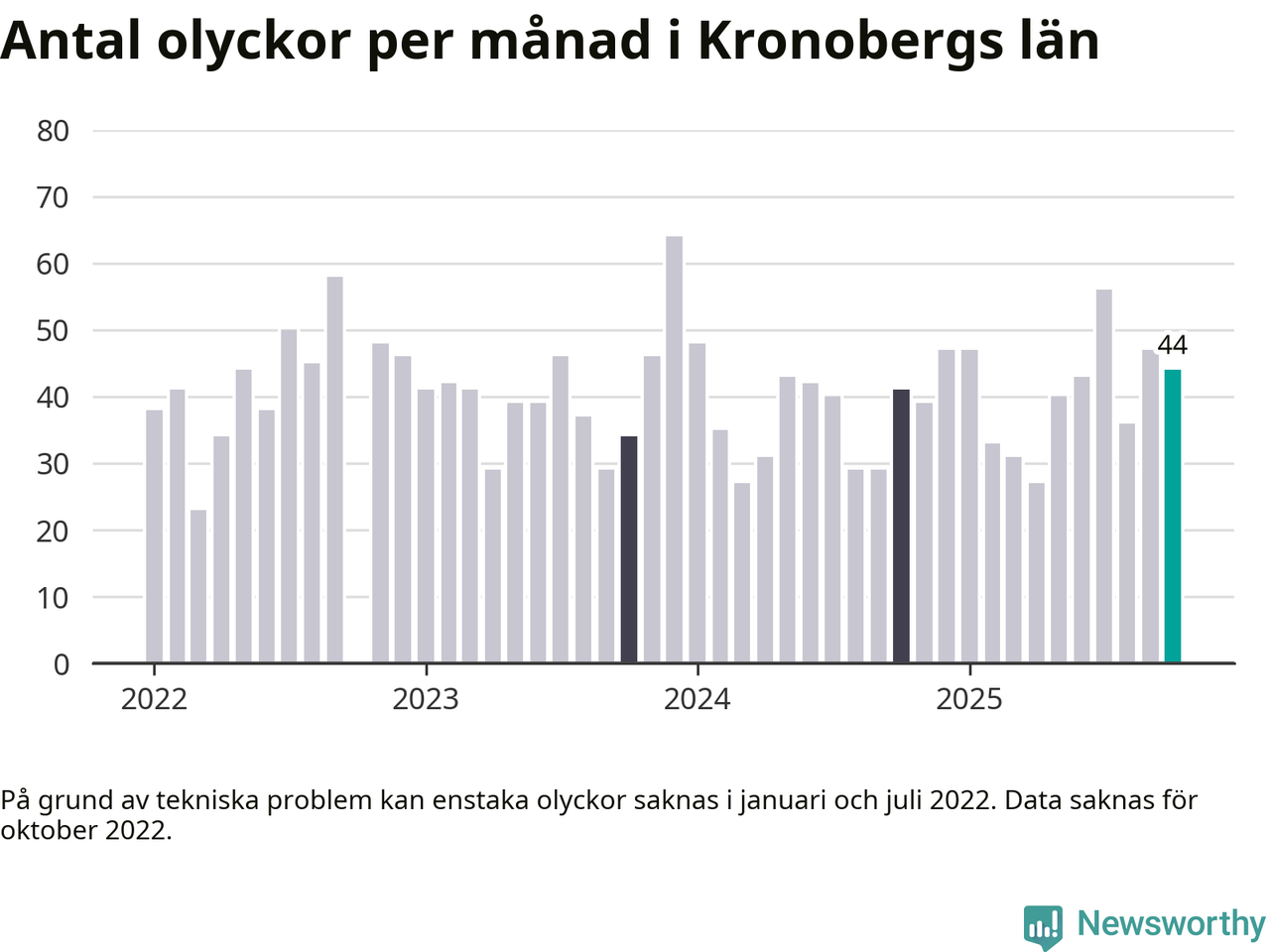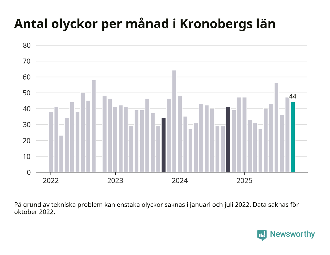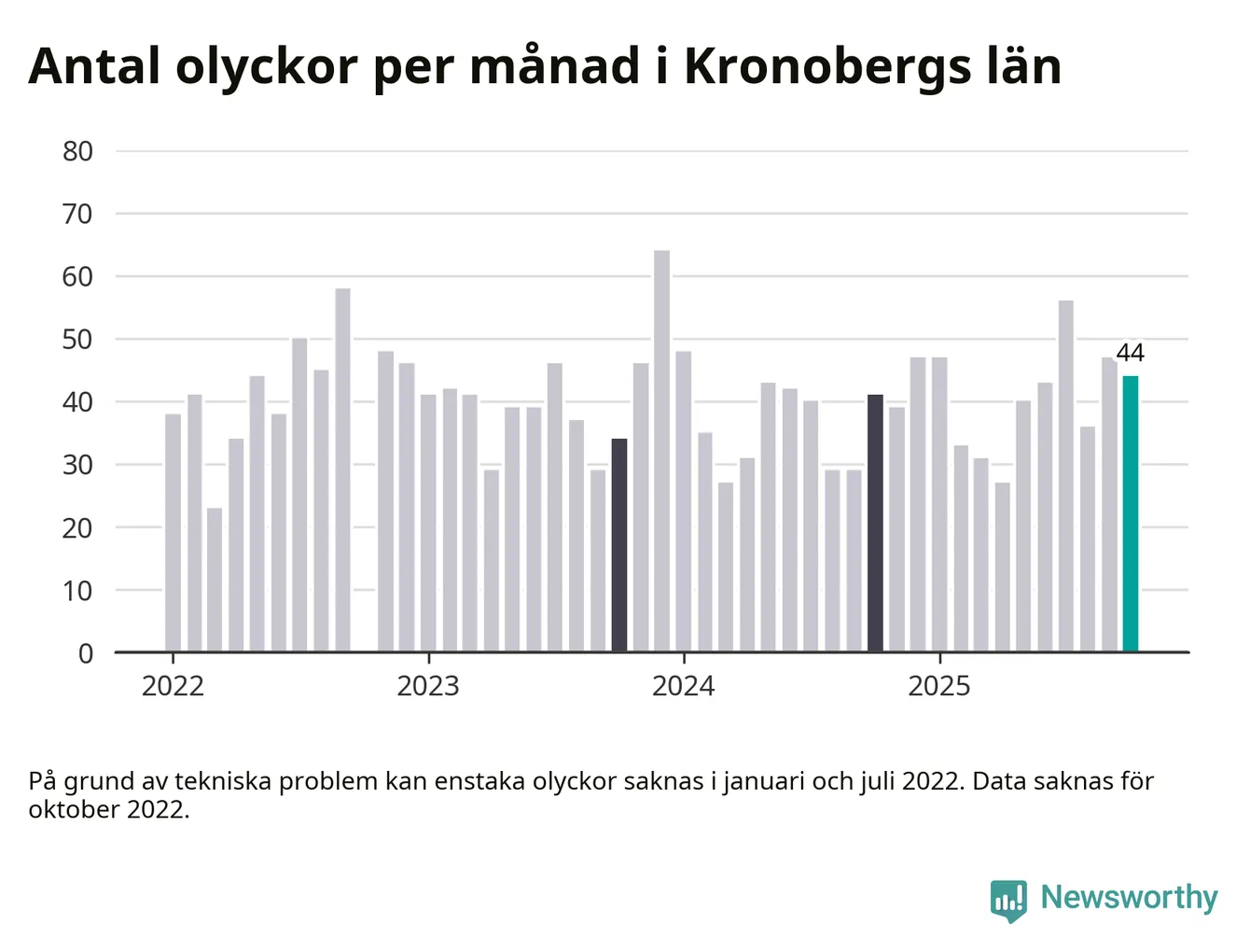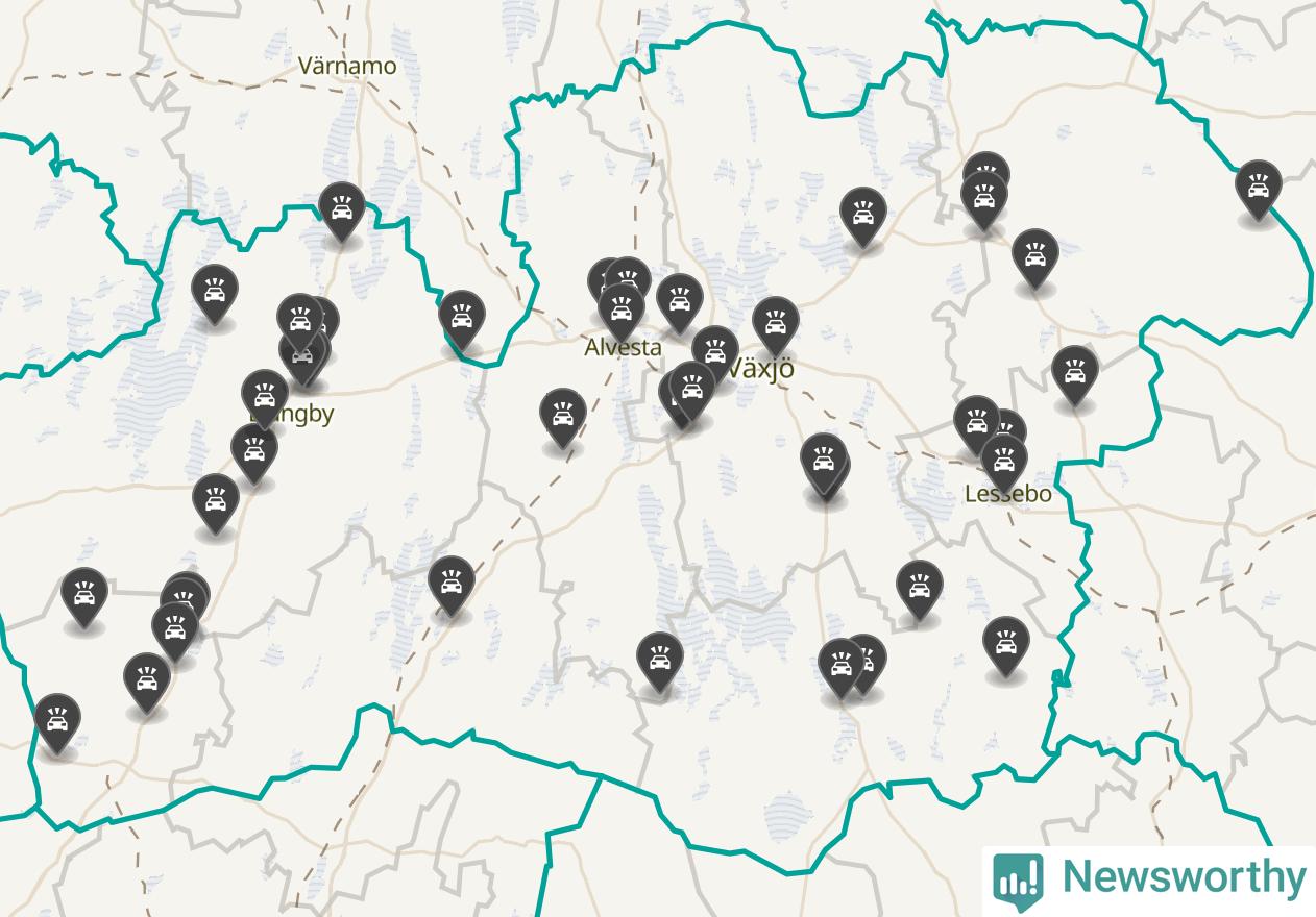 I Kronobergs län rapporterades 44 längs de stora vägarna i länet under oktober, visar data från Trafikverket som Newsworthy sammanställt.