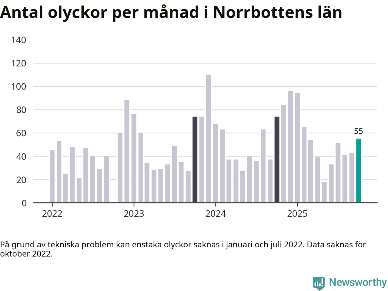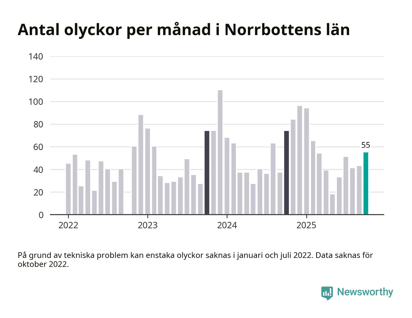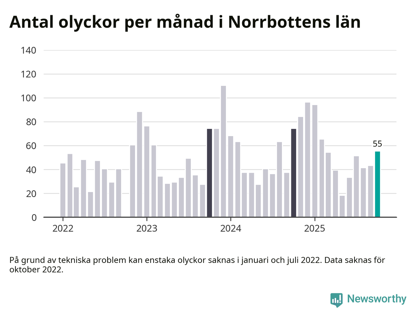Under oktober 2025 rapporterades 55 trafikolyckor längs eller i anslutning till de stora, statliga vägarna i Norrbotten. Det är färre än samma månad i fjol. Nerbrutet per kommun var vägavsnitten med flest olyckor, fem vardera, E4 genom Luleå kommun och E4 genom Piteå kommun.