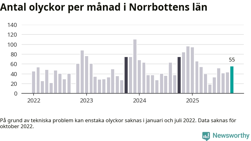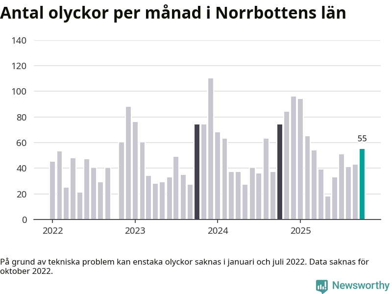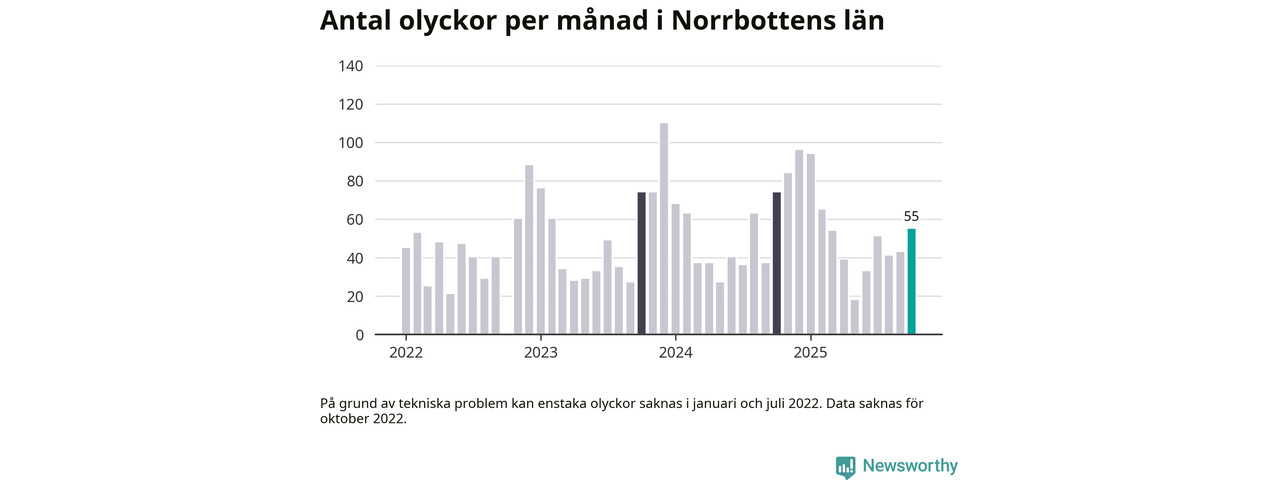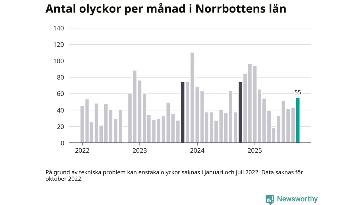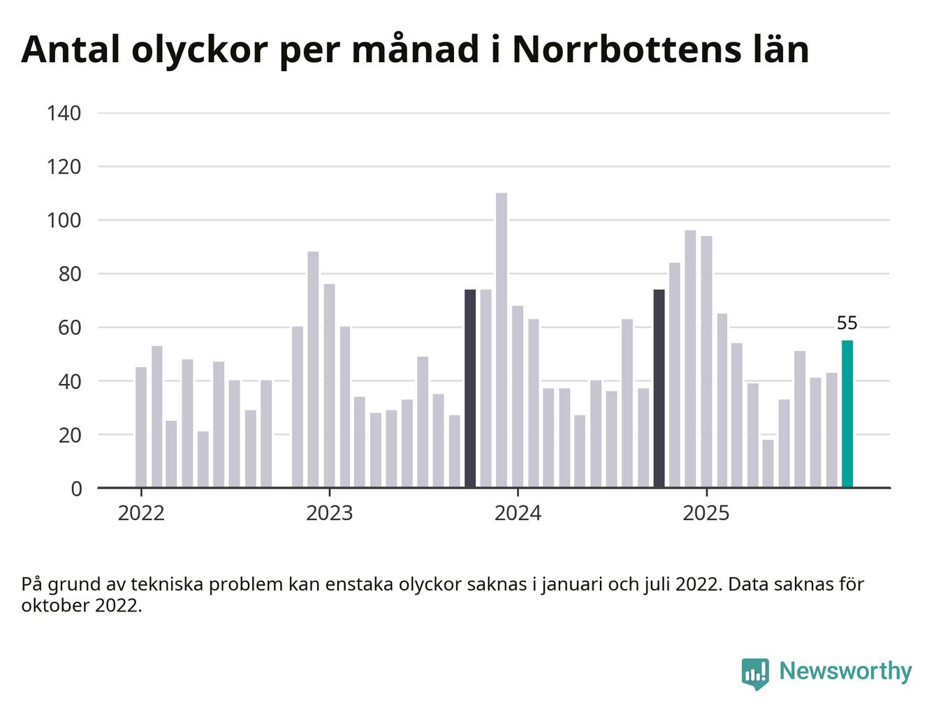 Under oktober 2025 rapporterades 55 trafikolyckor längs eller i anslutning till de stora, statliga vägarna i Norrbotten. Det är färre än samma månad i fjol. Nerbrutet per kommun var vägavsnitten med flest olyckor, fem vardera, E4 genom Luleå kommun och E4 genom Piteå kommun.